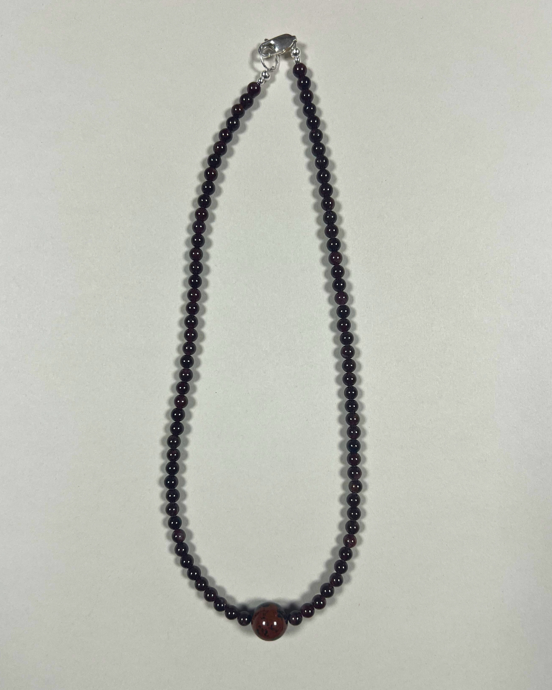 A one-of-a-kind necklace featuring petite 4 mm deep plum garnet beads with a central smooth round mahogany obsidian. All findings and clasp are sterling silver.
