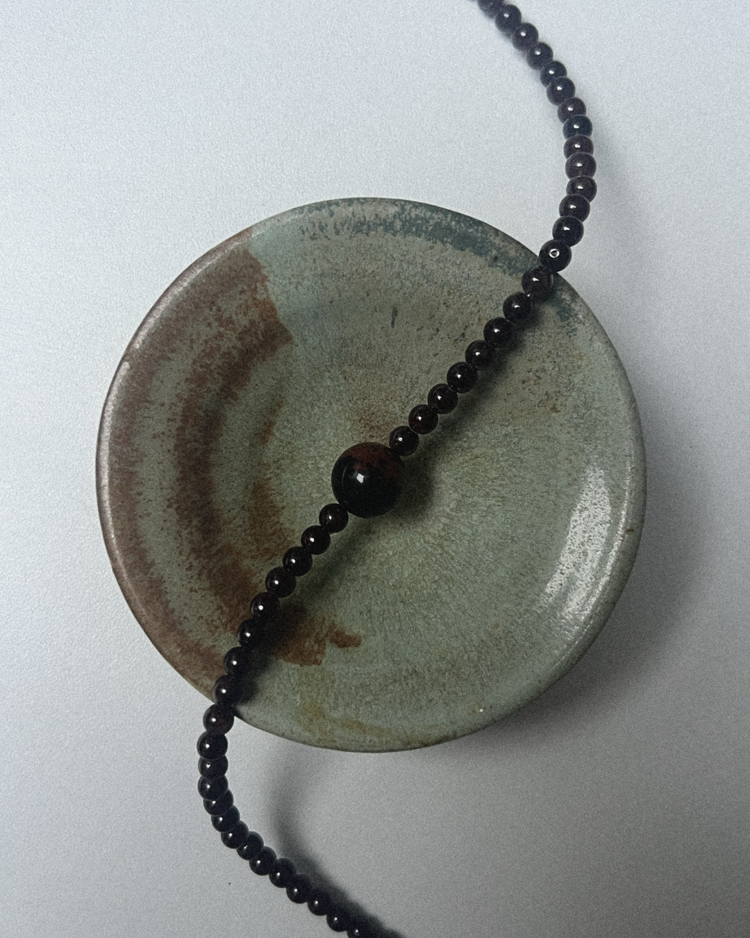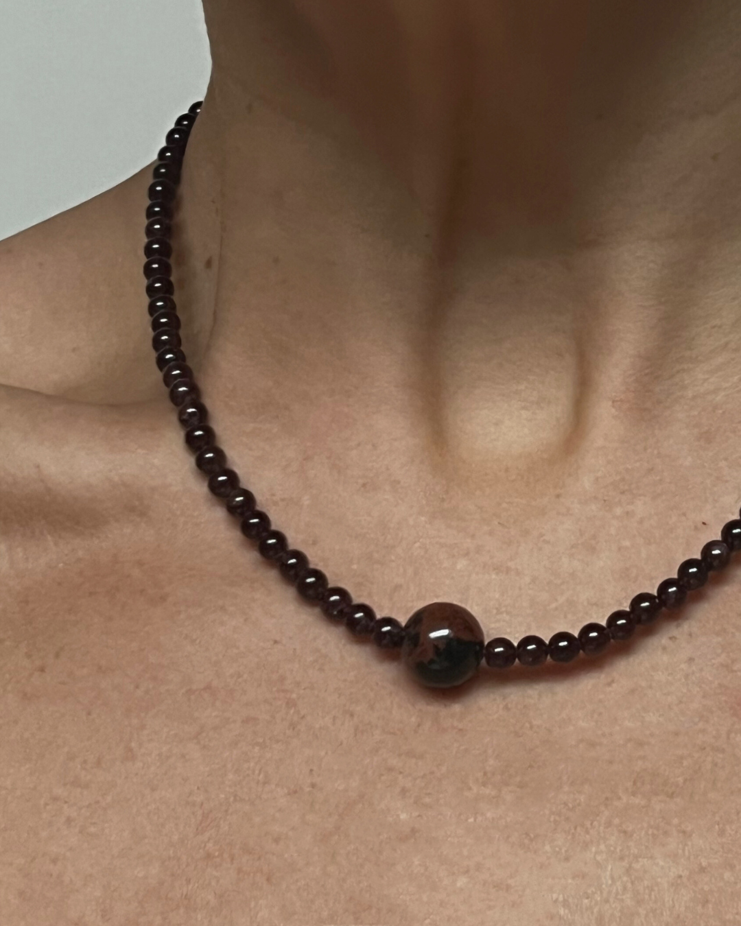 Garnet is often associated with warmth, grounding, and steady vitality, its rich tone bringing depth and quiet strength. Mahogany obsidian offers protection and stability, known for its grounding presence and natural blend of deep browns and red. Together, they create a piece that feels rooted, warm, and gently fortifying.