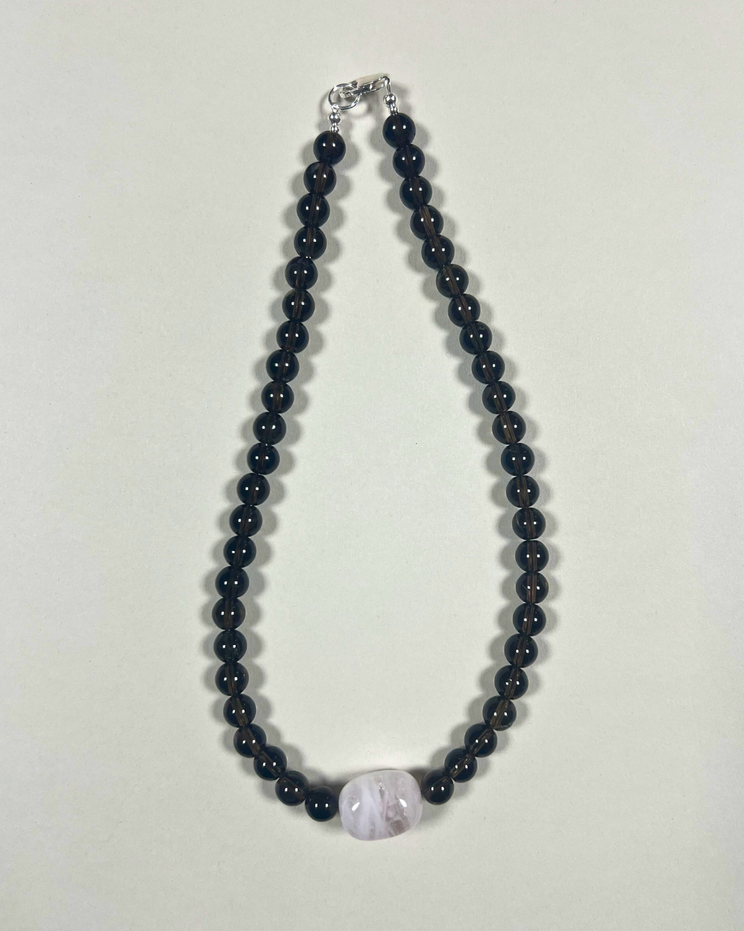 A one-of-a-kind necklace featuring large 8 mm smoky quartz beads with a central pale pink rose quartz. All findings and clasp are sterling silver.