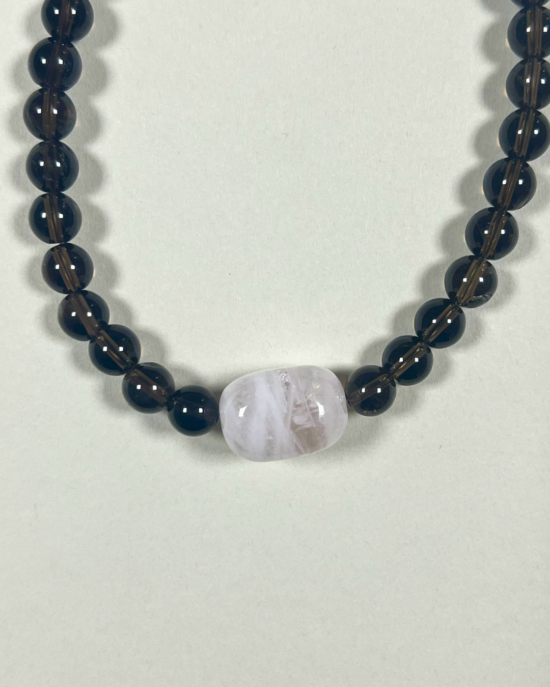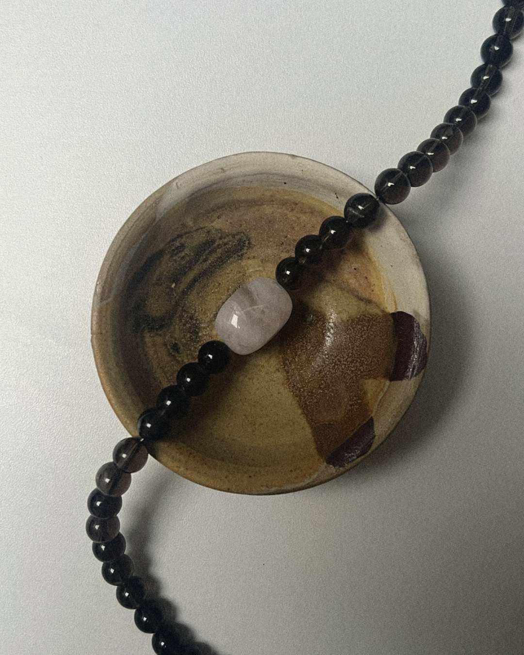 Smoky quartz is known for its grounding, protective energy, offering a sense of steadiness and calm through its deep, translucent tone. Rose quartz brings softness and gentle openness, often associated with compassion, ease, and emotional clarity. Together, they create a piece that feels balanced, soothing, and quietly supportive.