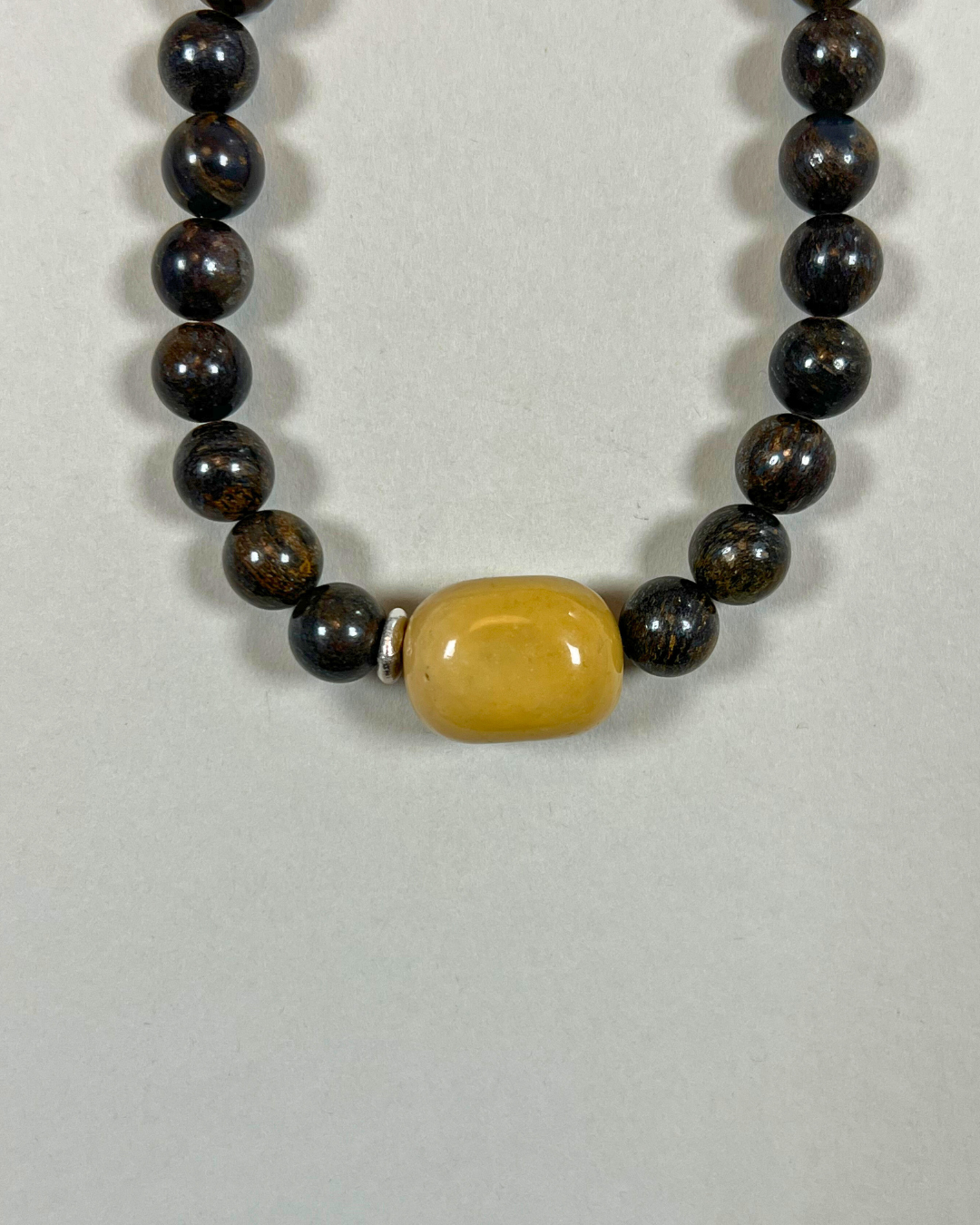 A one-of-a-kind necklace featuring large 8 mm bronzite beads with a central ochre yellow mookaite jasper and two accent fine silver stud beads. All findings and clasp are sterling silver.