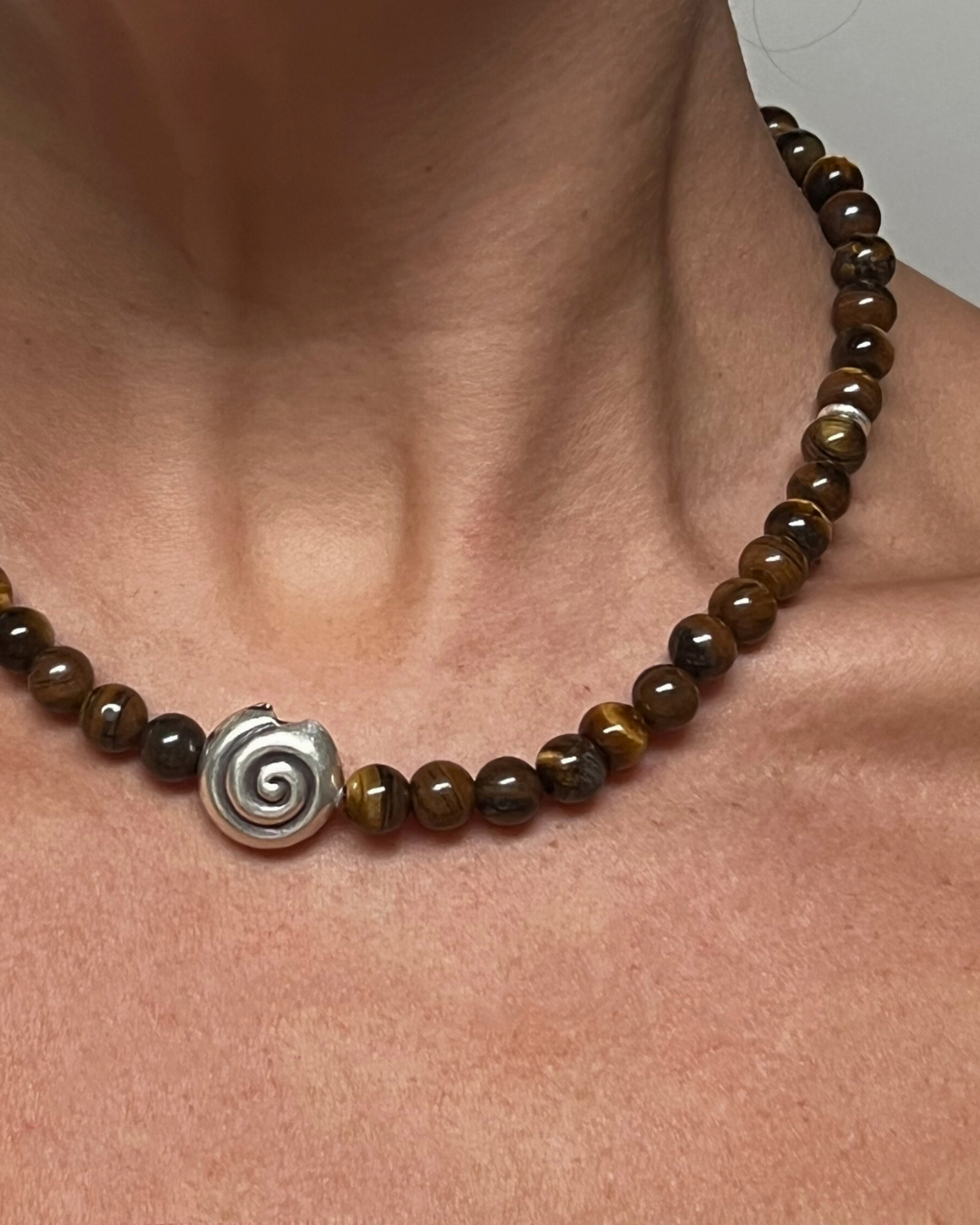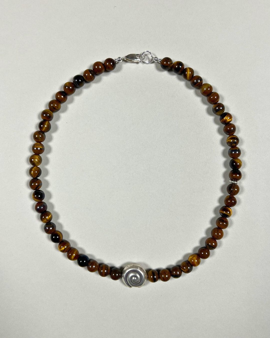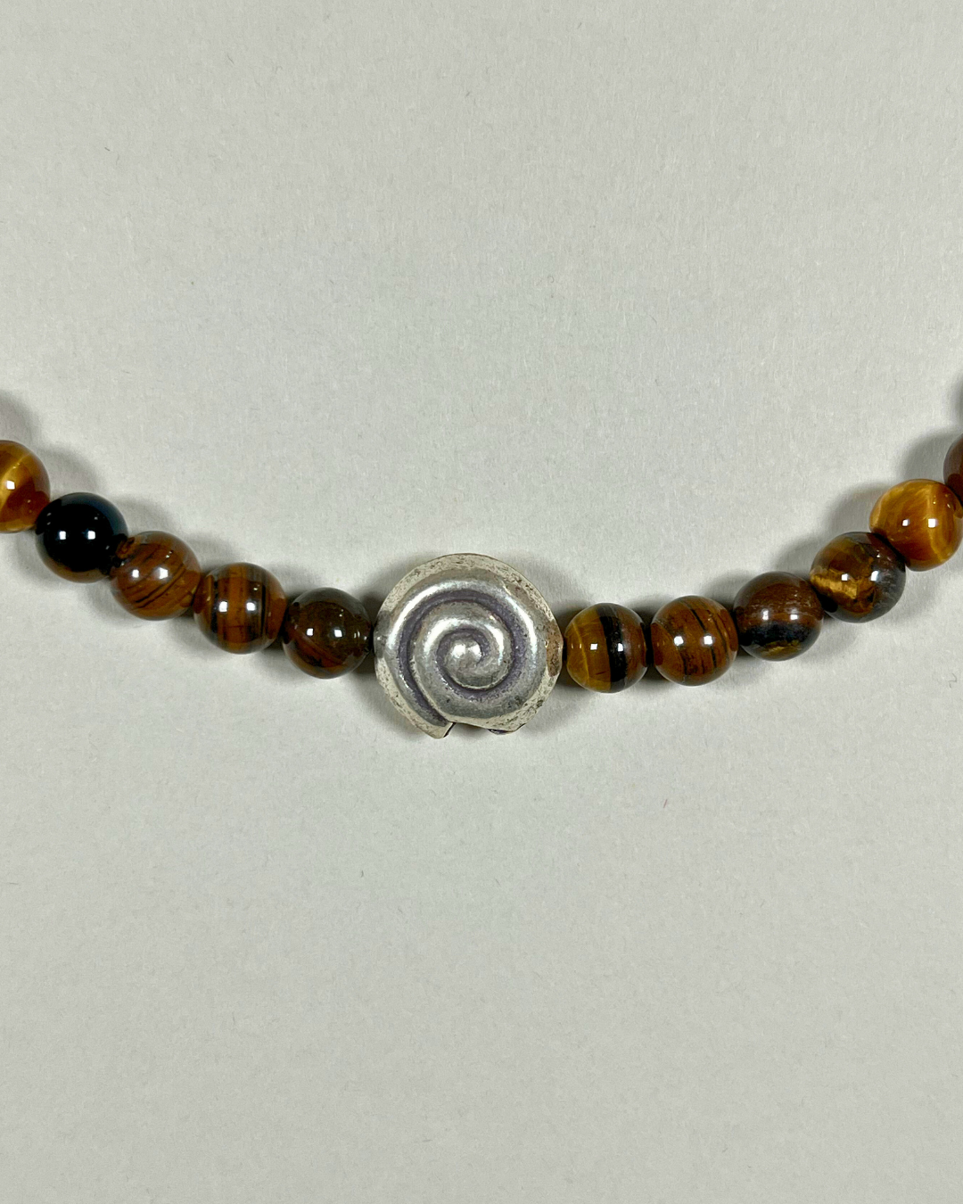 A one-of-a-kind necklace featuring 8mm tiger eye beads, hand-strung and finished with sterling silver findings and clasp. At its centre sits a large fine silver spiral, accented with a silver stud bead - a bold focal point that catches the light against the golden-brown tones of the tiger eye.