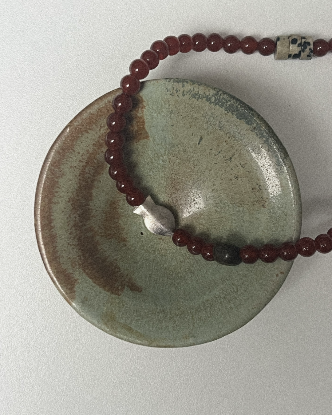 Carnelian is a stone of courage, creativity, and motivation - full of warm, life-giving energy. Dalmatian jasper adds a playful, grounding counterpoint, while bronzite offers protection and calm. The fine silver fish, symbolising flow and intuition, completes the piece with a quiet sense of movement and trust in one’s path.