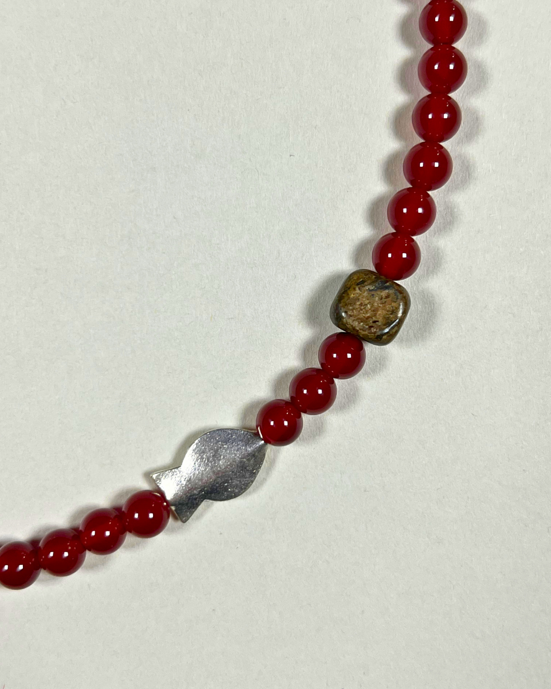 A one-of-a-kind necklace featuring 6mm carnelian beads with an accent stack of dalmatian jasper, a fine silver fish charm, and a bronzite nugget. All findings and clasp are sterling silver.