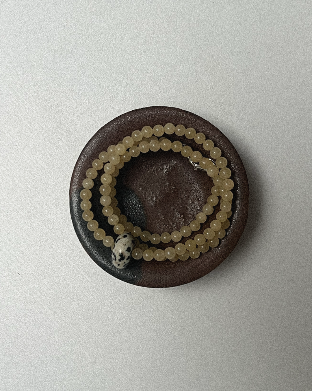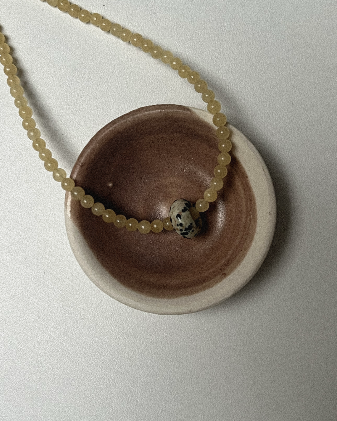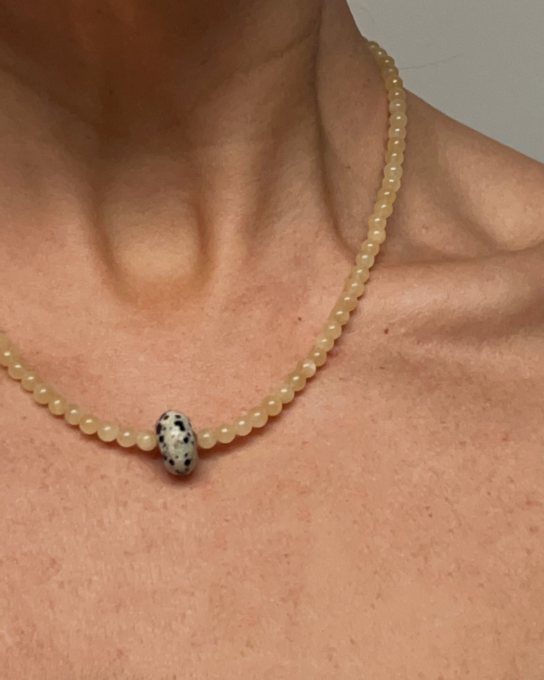 Yellow jade is often associated with warmth, joy, and gentle confidence, offering a soft, uplifting brightness. Dalmatian jasper brings grounding and balanced steadiness, known for its supportive, calming energy and natural speckled texture. The sliding bead introduces quiet movement, allowing the piece to shift subtly with the wearer. Together, they create a necklace that feels light, grounded, and softly harmonising.