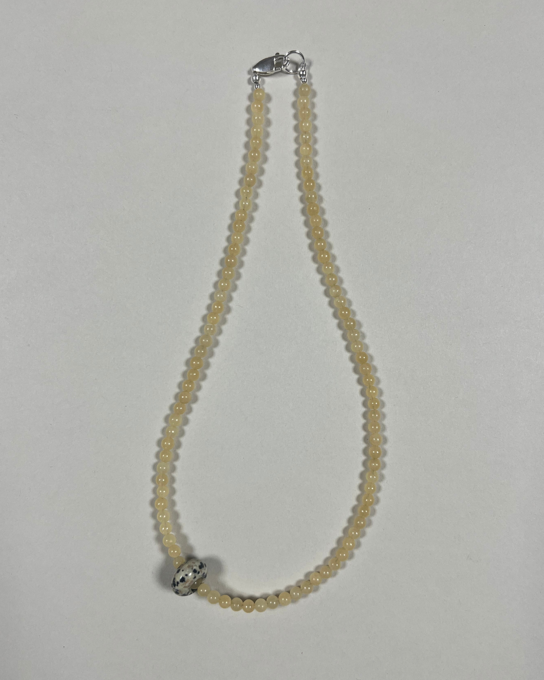 A one-of-a-kind necklace featuring petite 4 mm yellow jade beads with a moveable sliding dalmatian jasper bead. All findings and clasp are sterling silver.