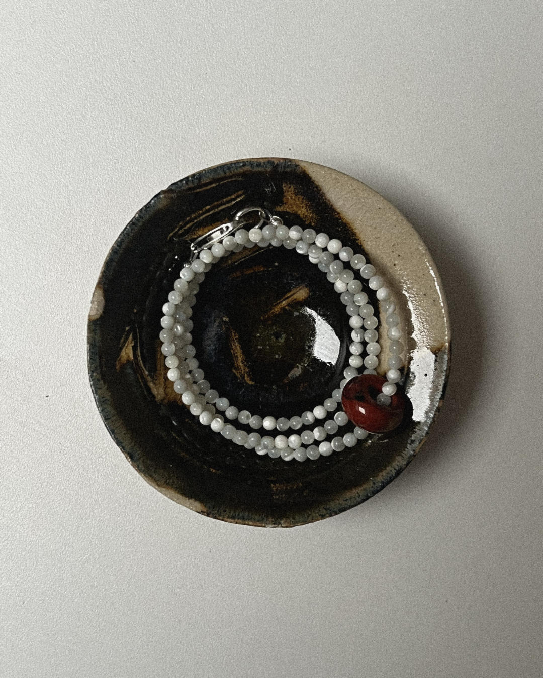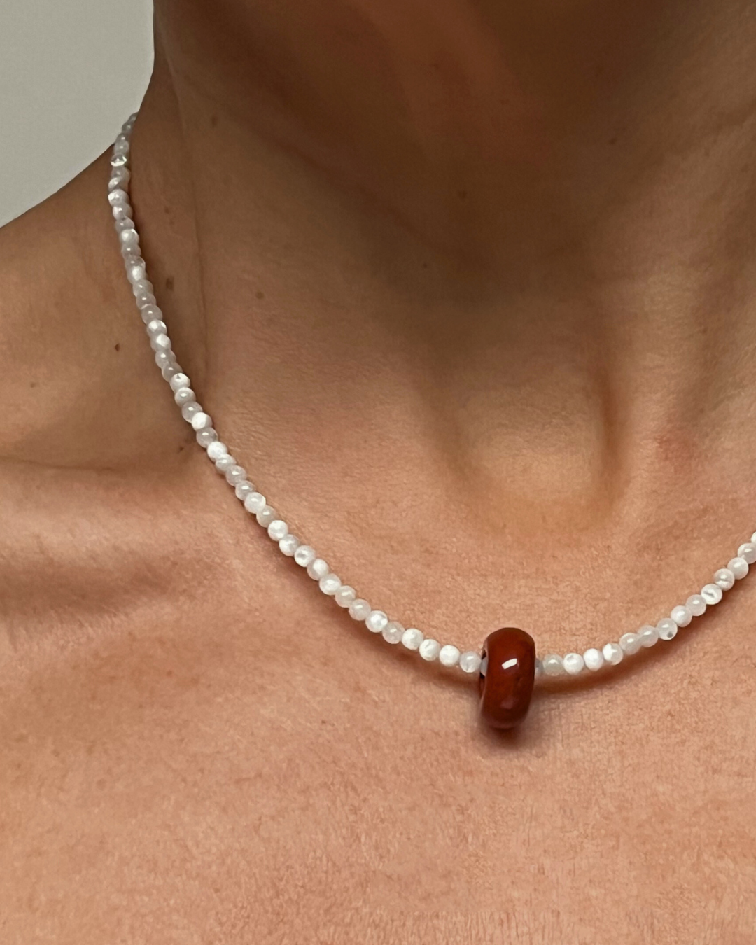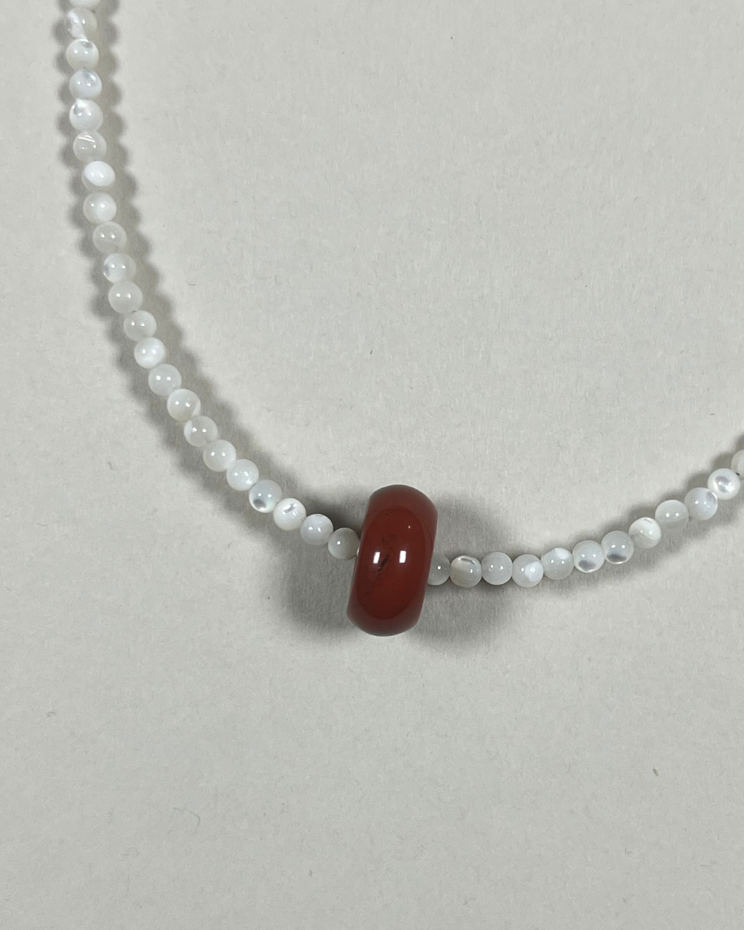 Mother of pearl brings a soft, reflective calm, offering gentle balance and ease through its natural lustre. Red jasper adds grounding warmth and steady support, known for its stabilising energy and earthy red tone. The sliding bead introduces quiet movement, allowing the piece to shift subtly with the wearer. Together, they create a necklace that feels gentle, grounded, and quietly reassuring.