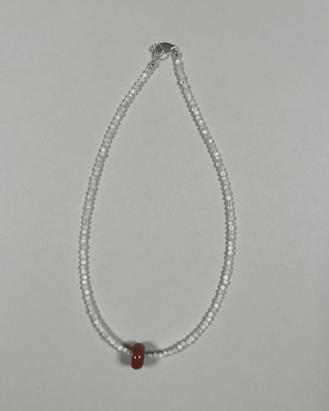 A one-of-a-kind necklace featuring fine 3 mm mother of pearl beads with a moveable red jasper sliding bead. All findings and clasp are sterling silver.