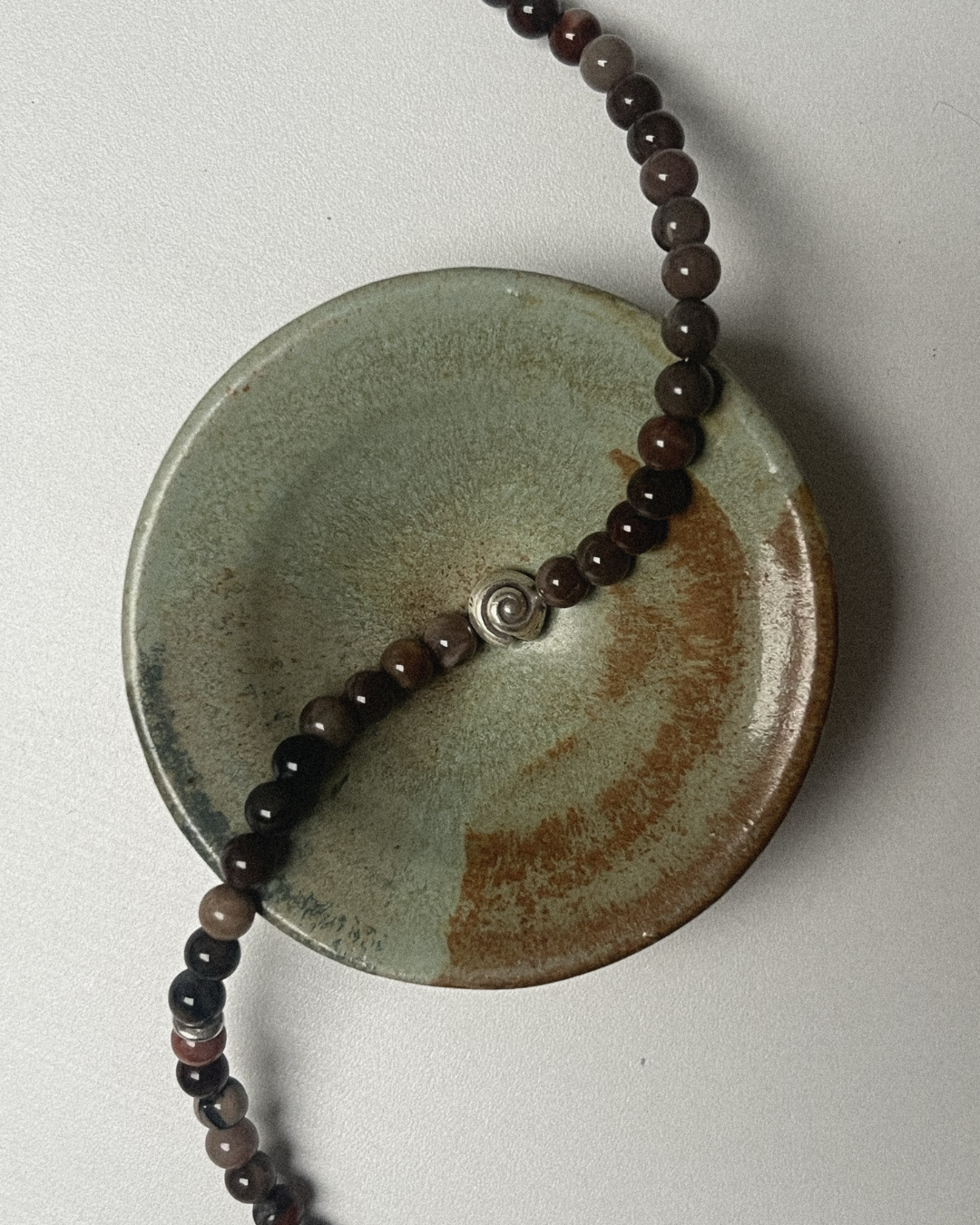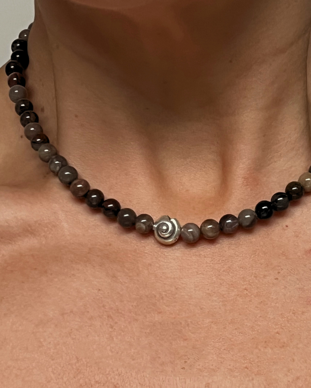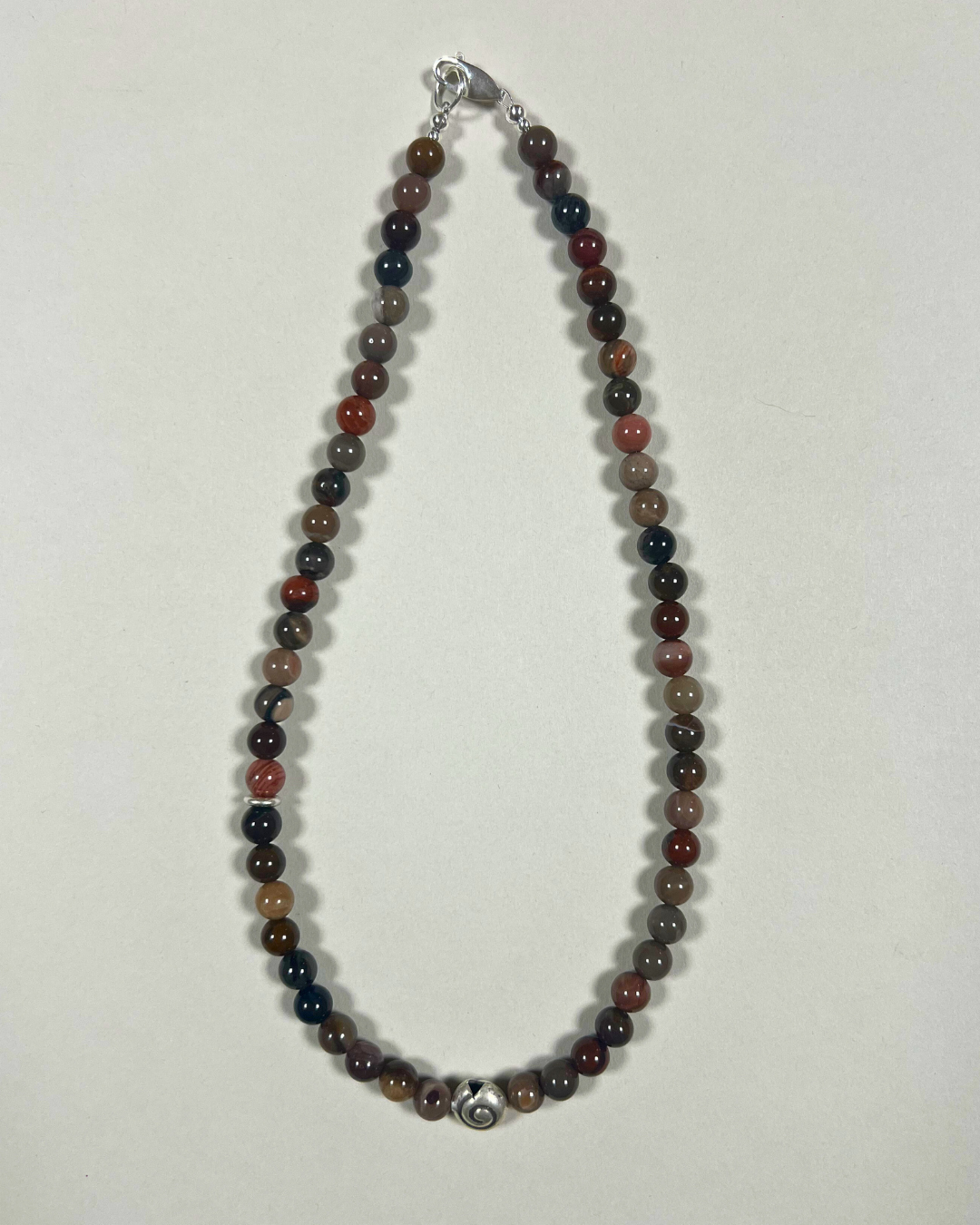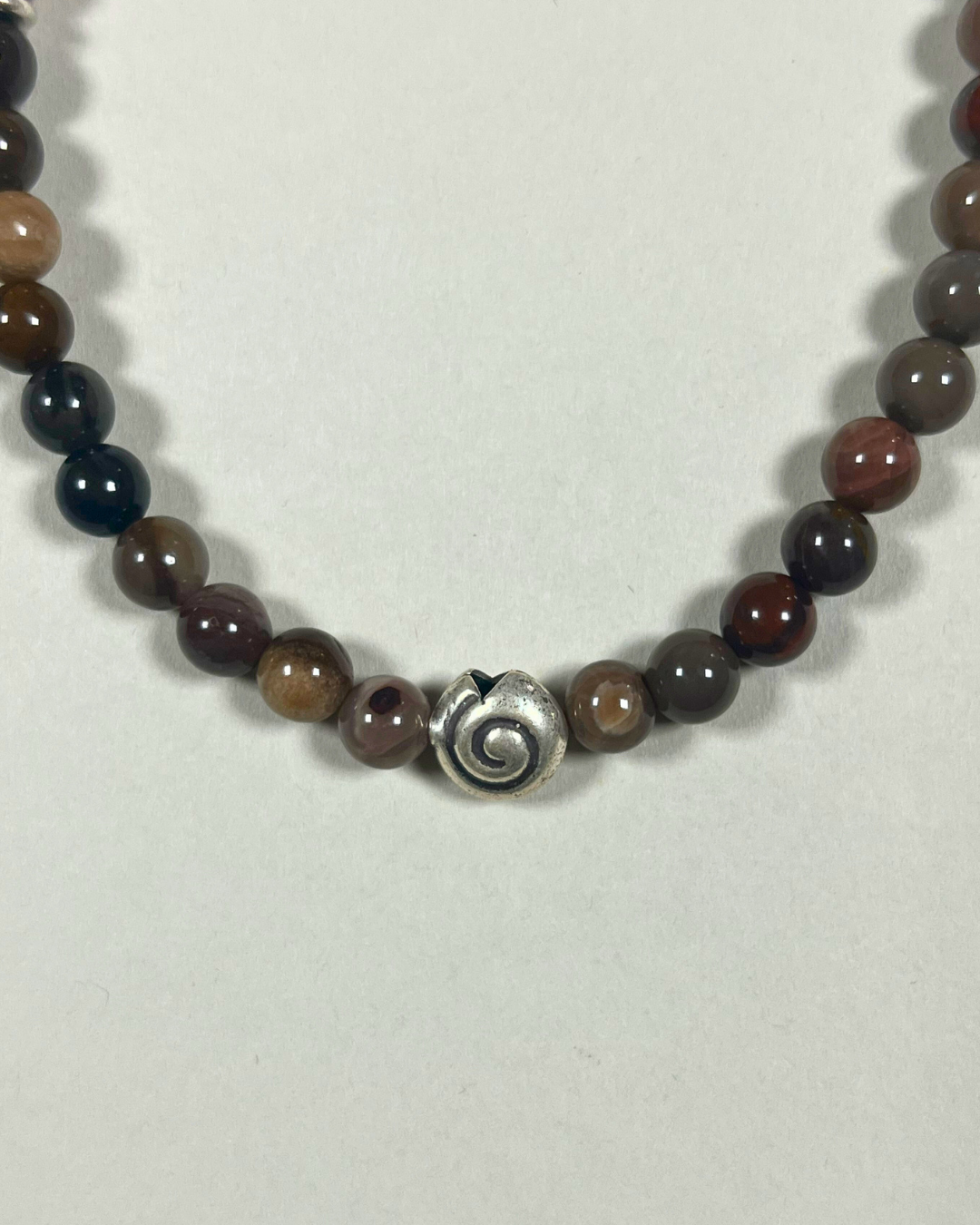A one-of-a-kind necklace featuring 6 mm petrified wood beads with a central fine silver spiral and an accent fine silver stud bead. All findings and clasp are sterling silver.