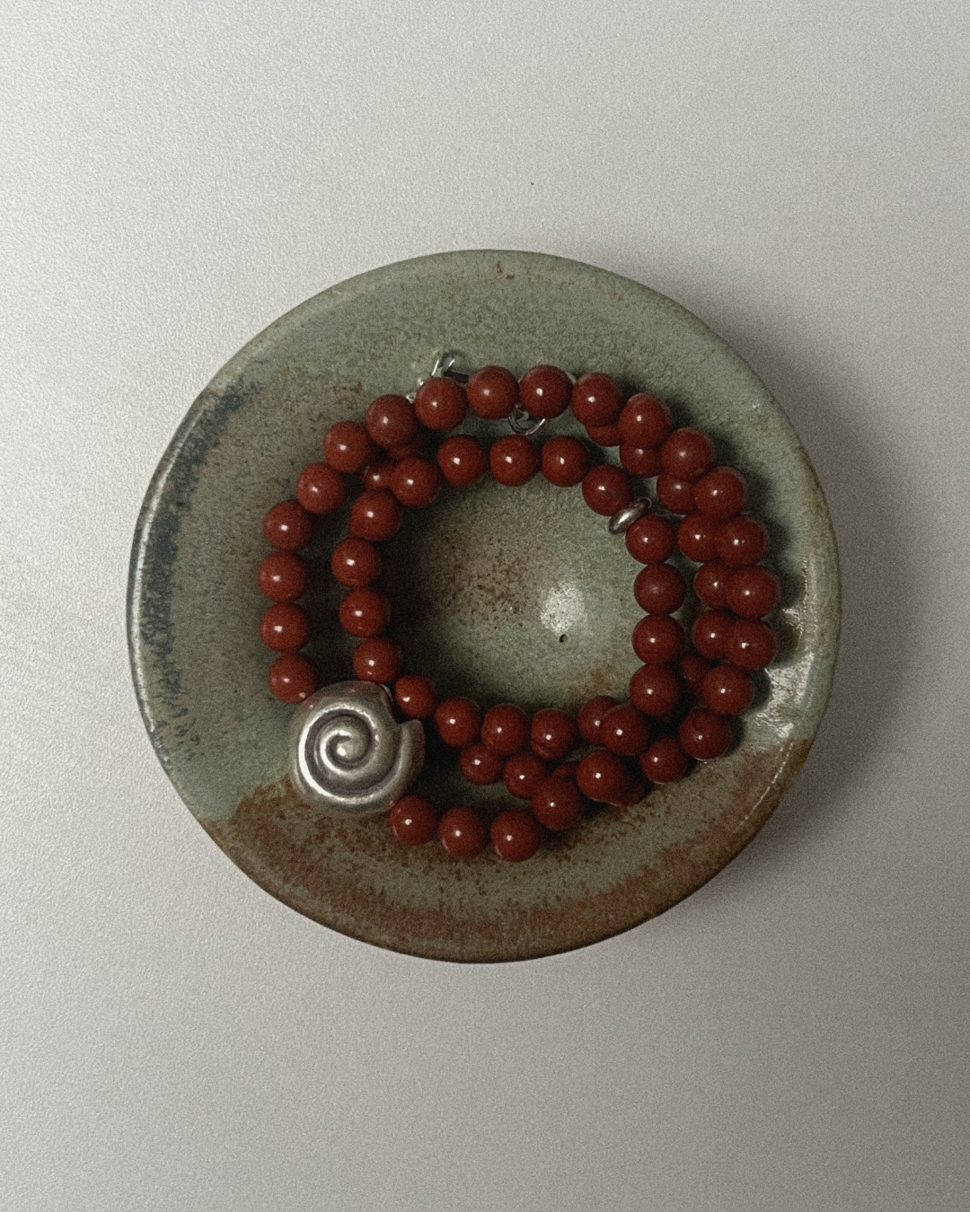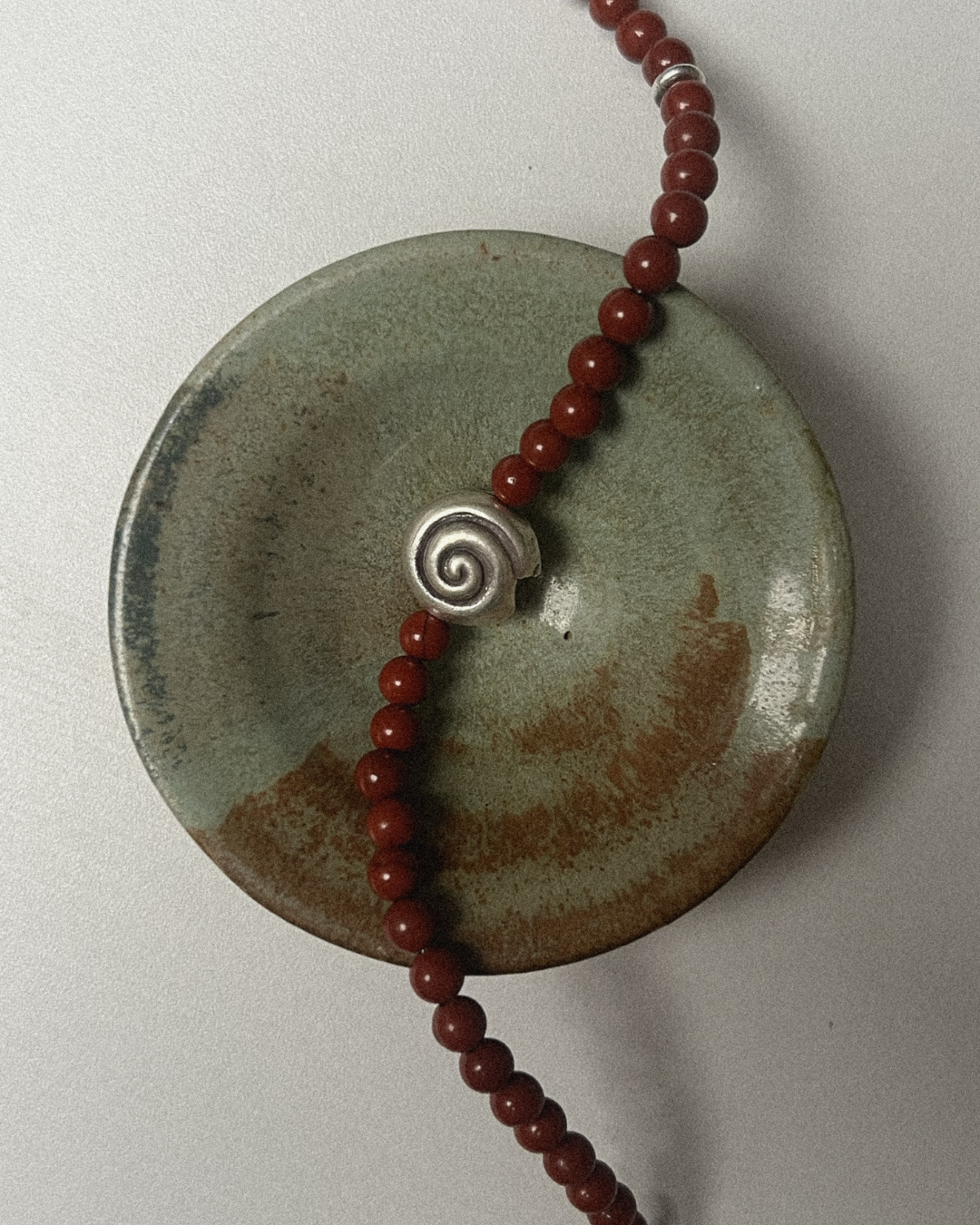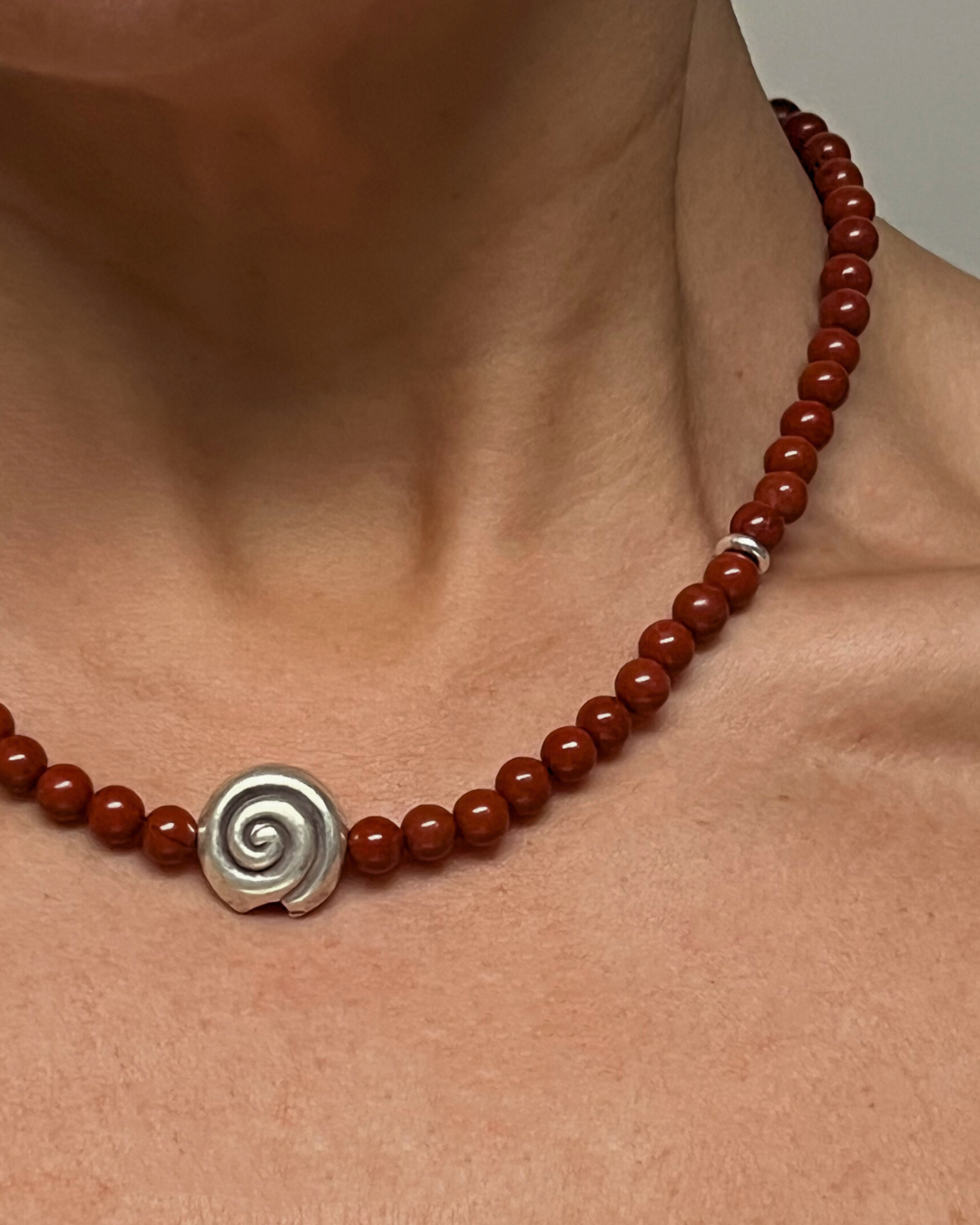 Red jasper is known for its grounding warmth and steady support, offering stability and quiet strength through its earthy red tone. The larger fine silver spiral introduces a sense of movement and unfolding, giving the piece a strong focal point, while the small silver stud adds a subtle note of balance and light. Together, they create a necklace that feels rooted, expressive, and quietly confident.