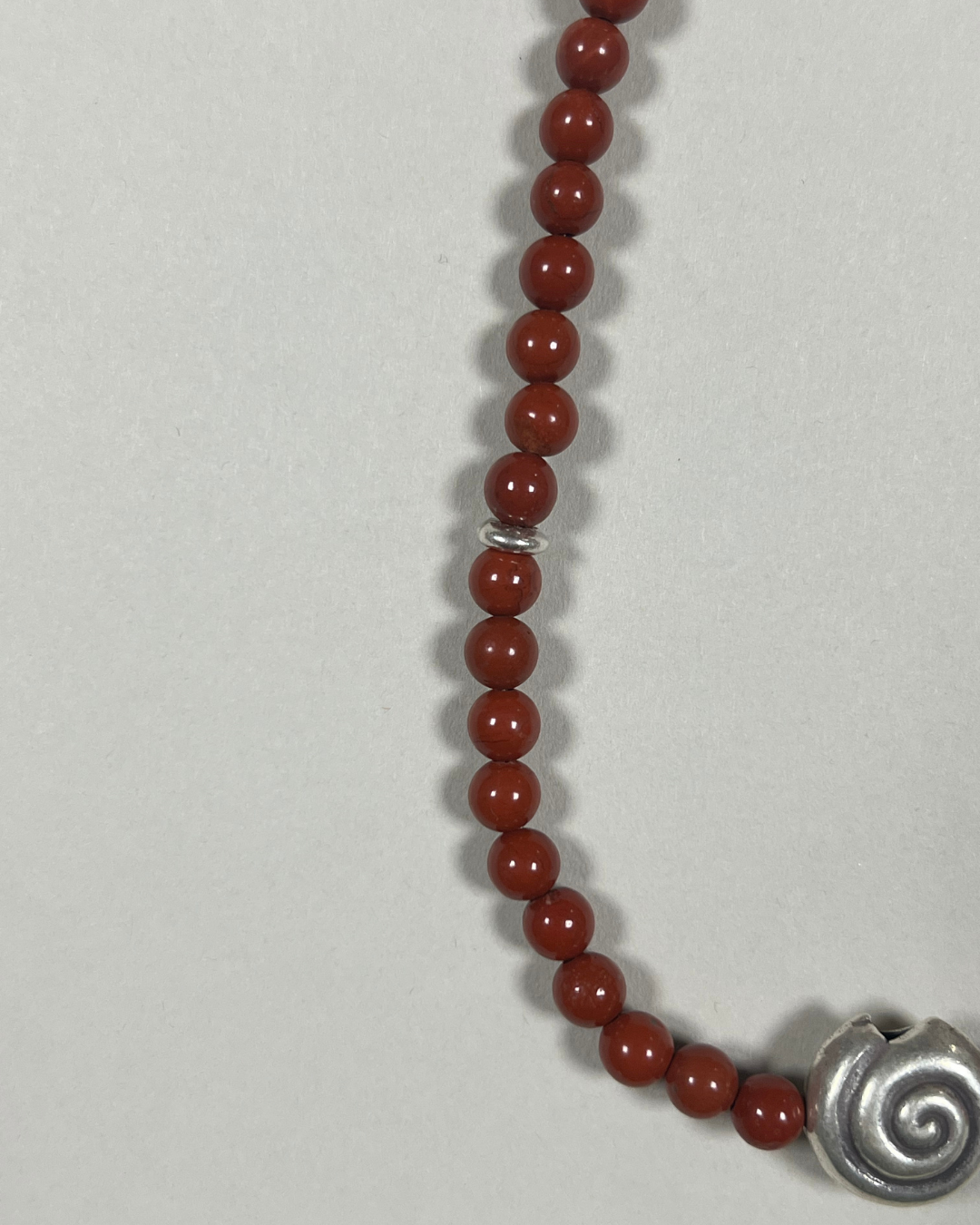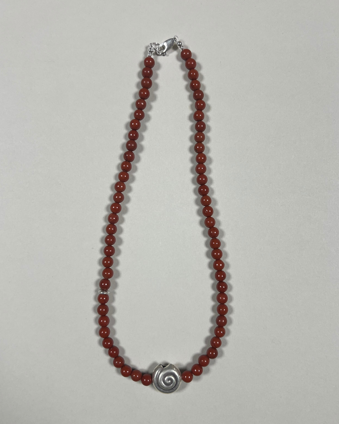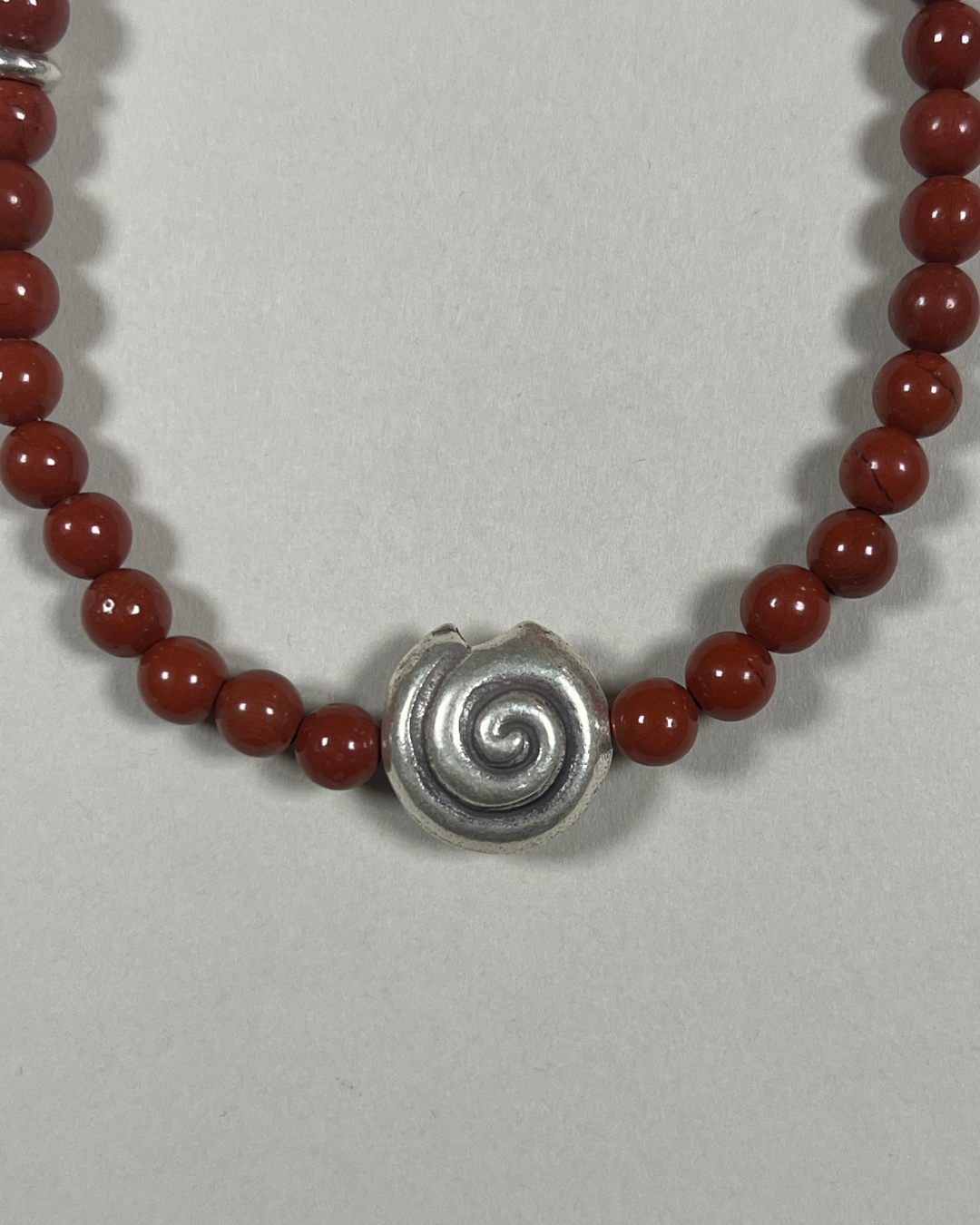A one-of-a-kind necklace featuring 6 mm red jasper beads with a central large fine silver spiral and an accent fine silver stud bead. All findings and clasp are sterling silver.