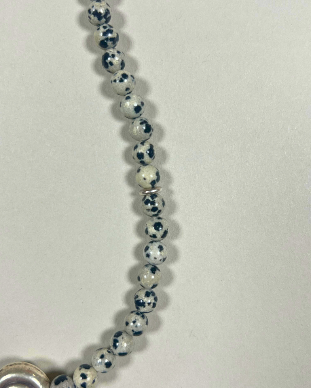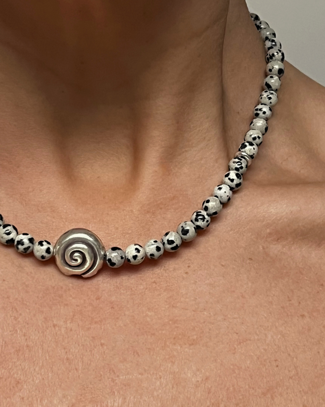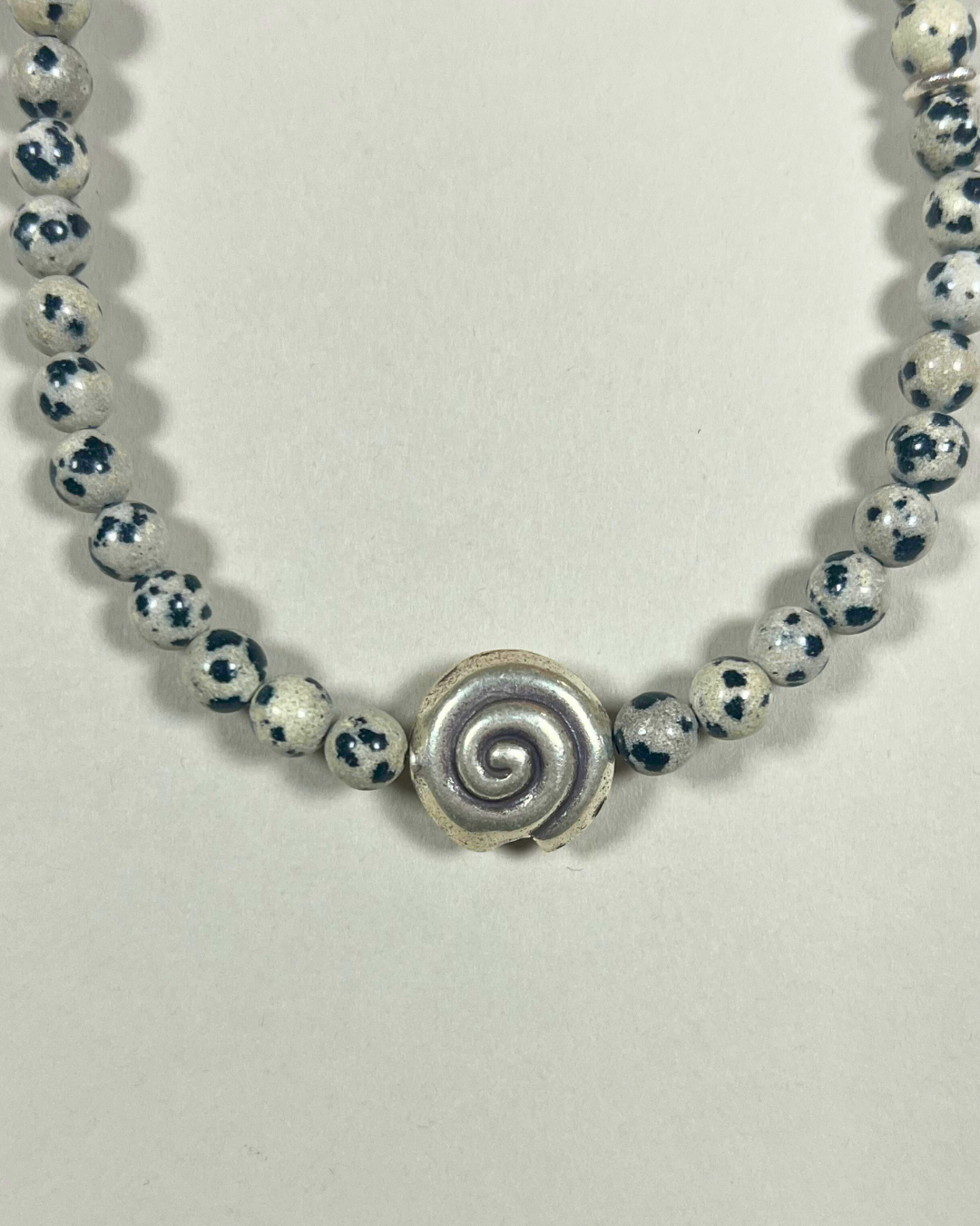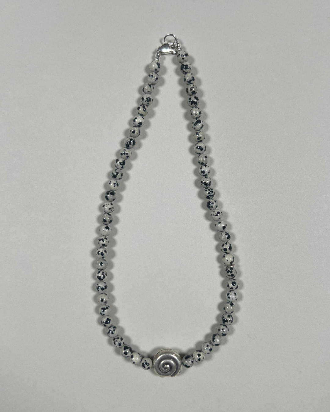 A one-of-a-kind necklace featuring 6 mm dalmatian jasper beads with a central large fine silver spiral and an accent fine silver stud bead. All findings and clasp are sterling silver.