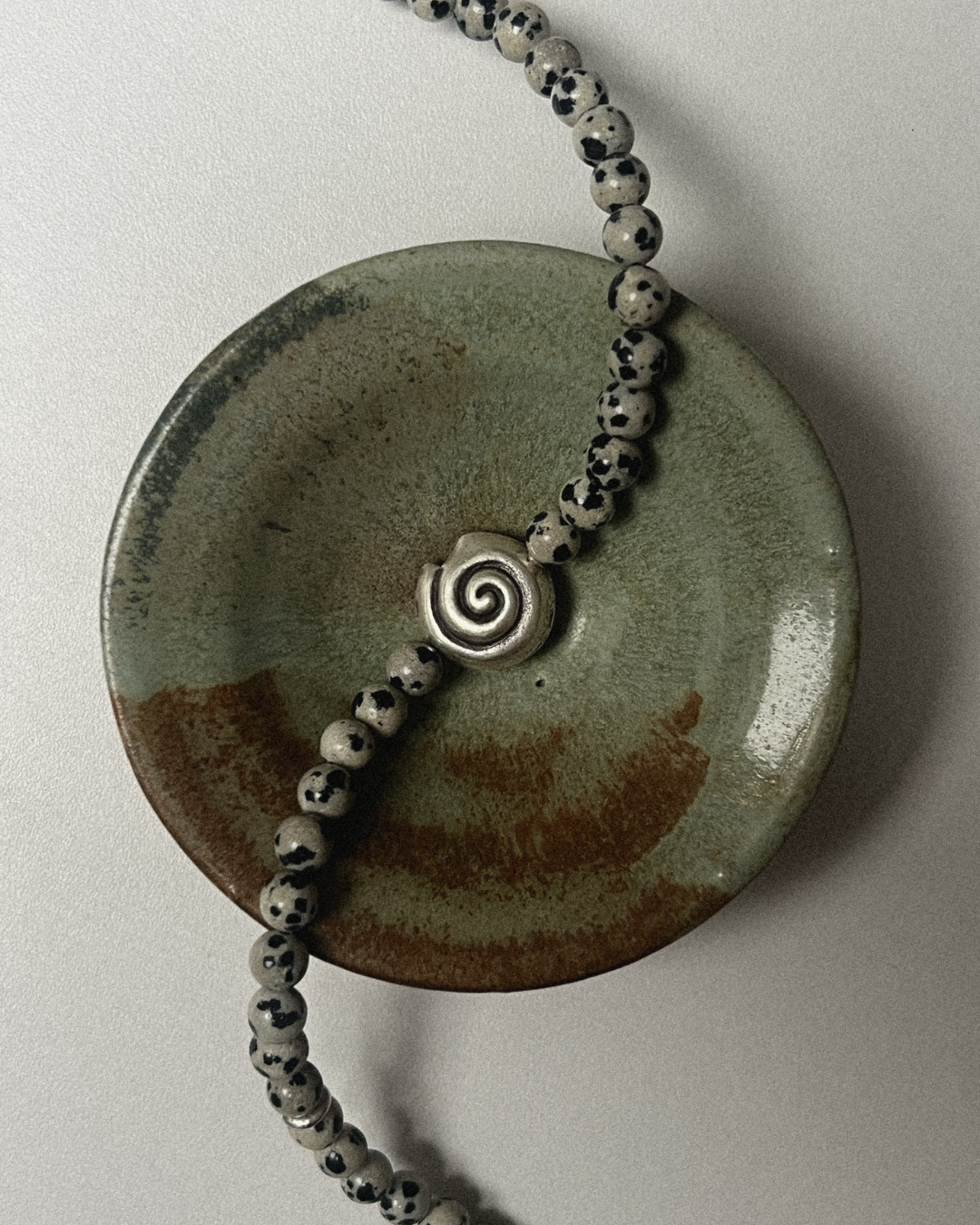 Dalmatian jasper is known for its grounding, balanced steadiness, offering supportive energy through its natural speckled pattern. The larger fine silver spiral introduces a sense of movement and unfolding, while the small silver stud adds a quiet point of light and structure. Together, they create a piece that feels calm, grounded, and quietly expressive.