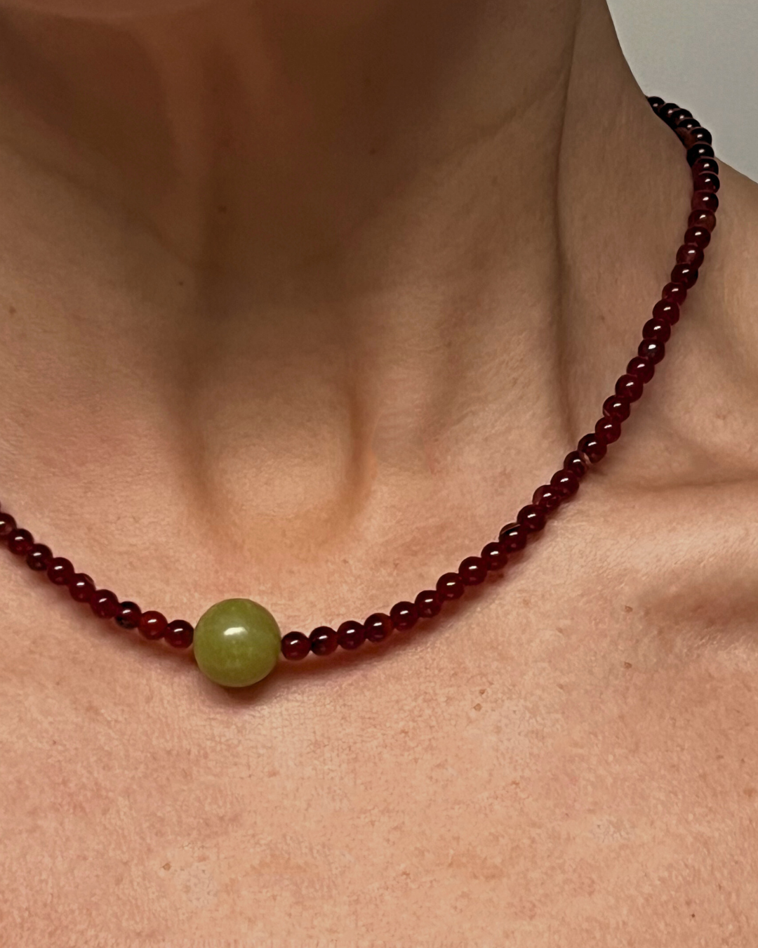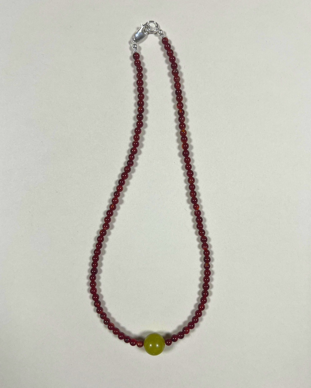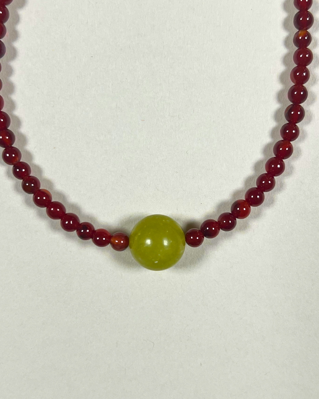 A one-of-a-kind necklace featuring petite 4 mm carnelian beads with a central smooth olive jade sphere. All findings and clasp are sterling silver.