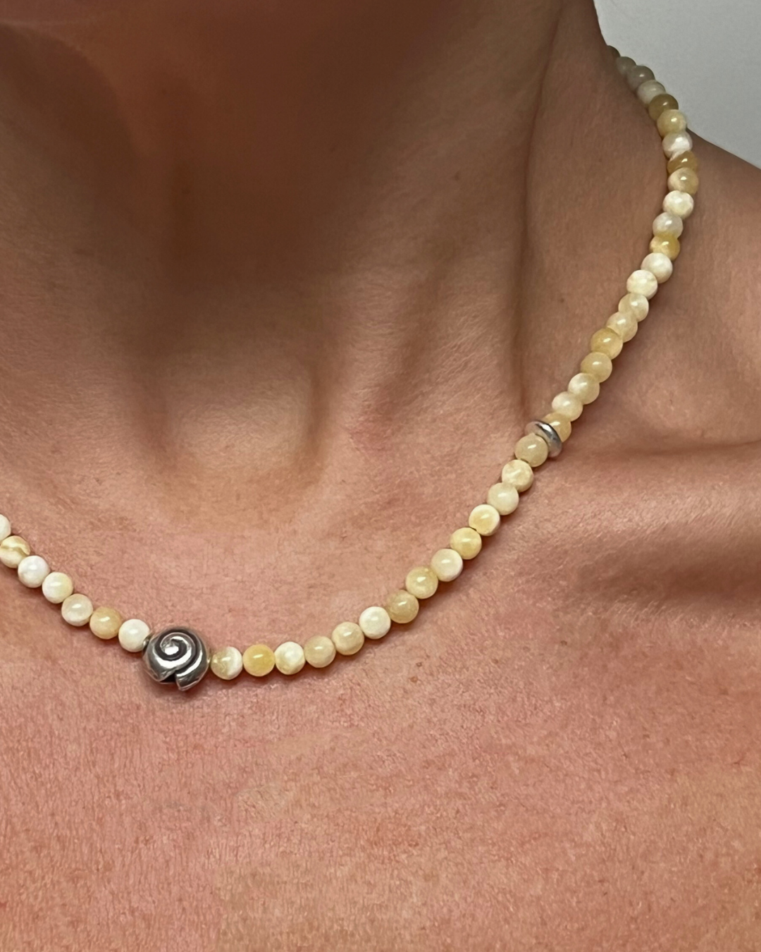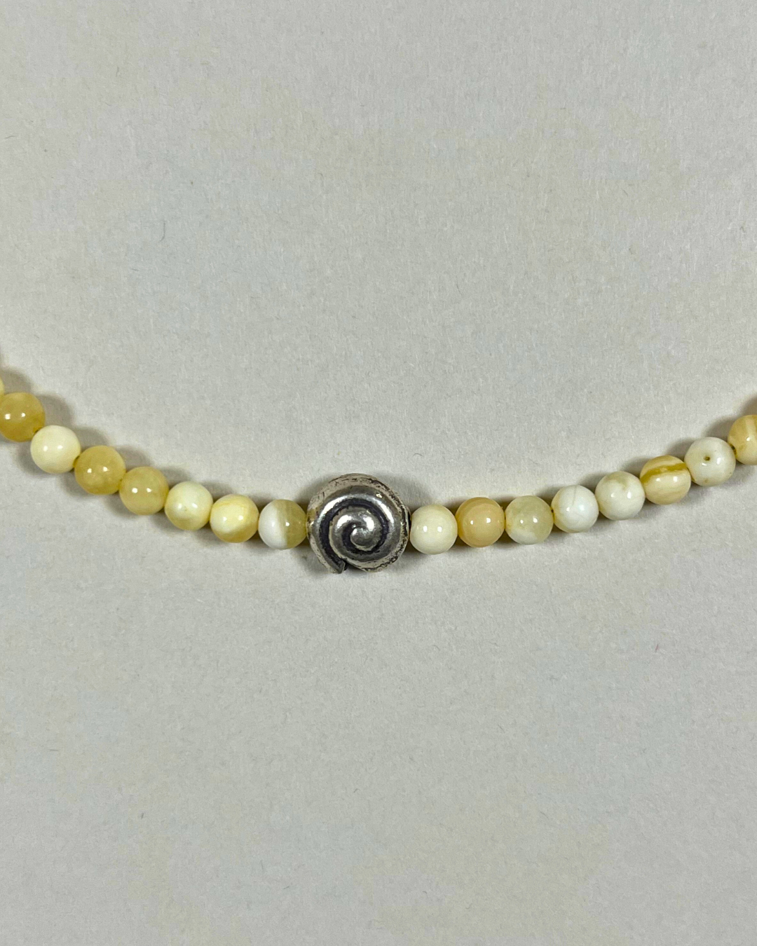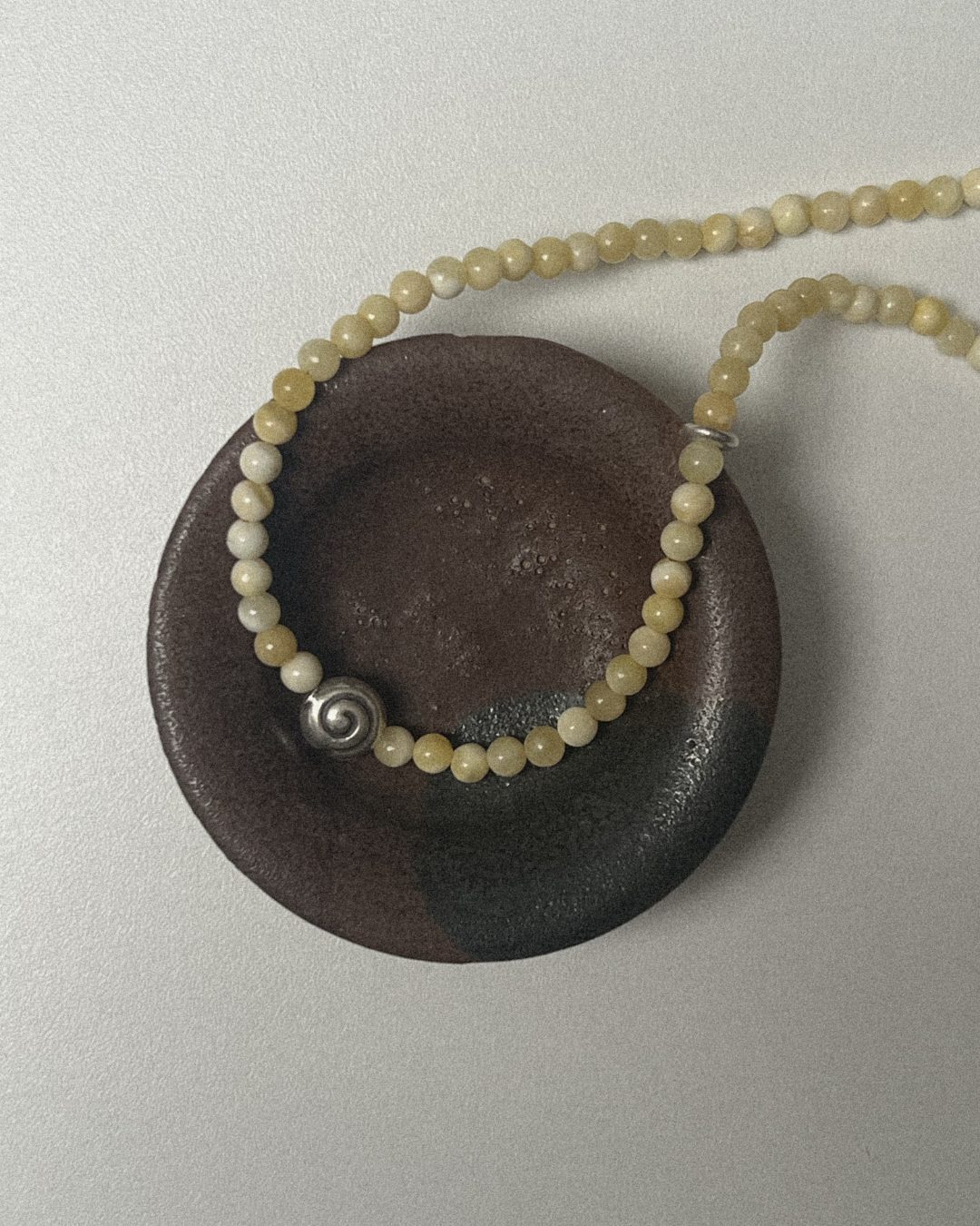 A one-of-a-kind necklace featuring petite 4mm yellow jade beads, centred with a fine silver spiral and accented by a single fine silver stud bead. All findings and clasp are sterling silver.