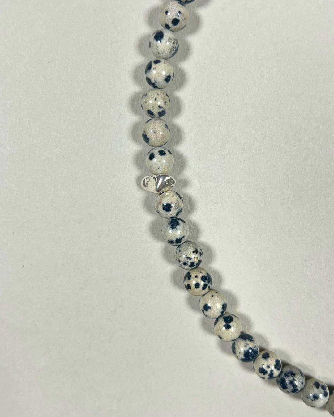 Dalmatian jasper is associated with joy, grounding, and balance, encouraging a sense of lightness and steady presence. Silver brings reflection and harmony, enhancing the natural tones of the jasper with quiet luminosity. Together, they create a piece that feels grounded yet joyful - balanced, radiant, and subtly uplifting.