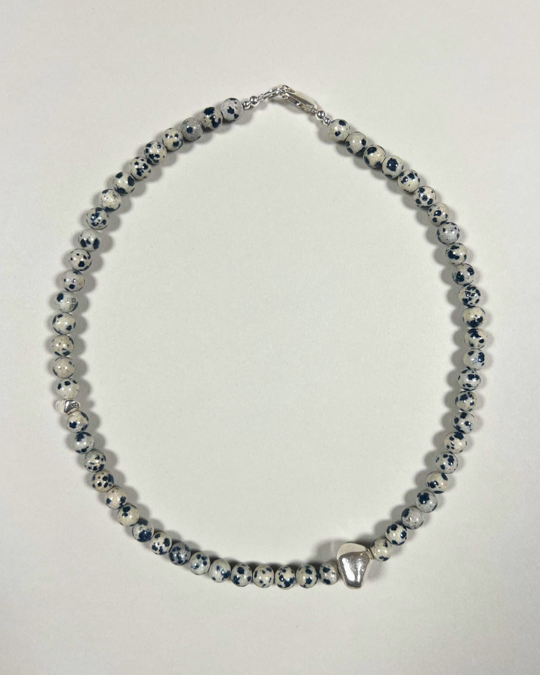 A one-of-a-kind necklace featuring 6mm dalmatian jasper beads, hand-strung and finished with sterling silver findings and clasp. Accented with a large sterling silver nugget and a smaller irregular silver nugget, adding texture and brightness to the playful, speckled jasper.