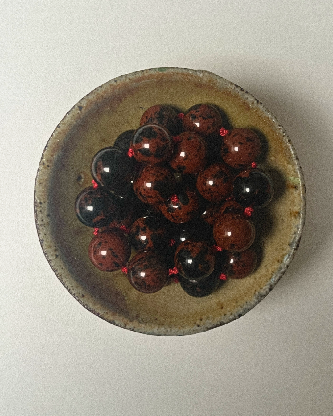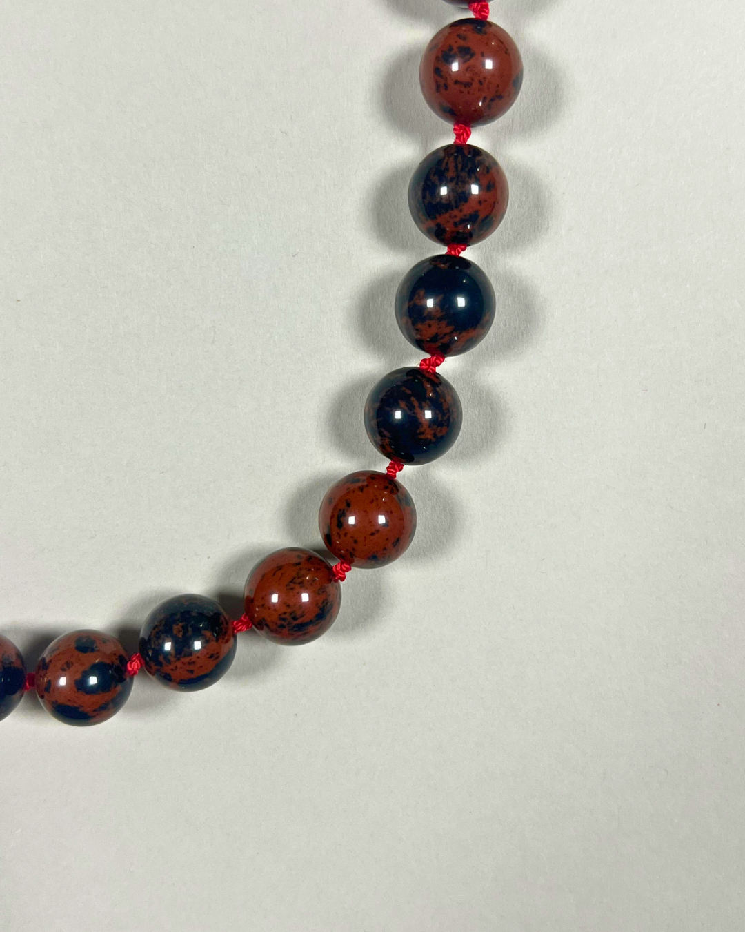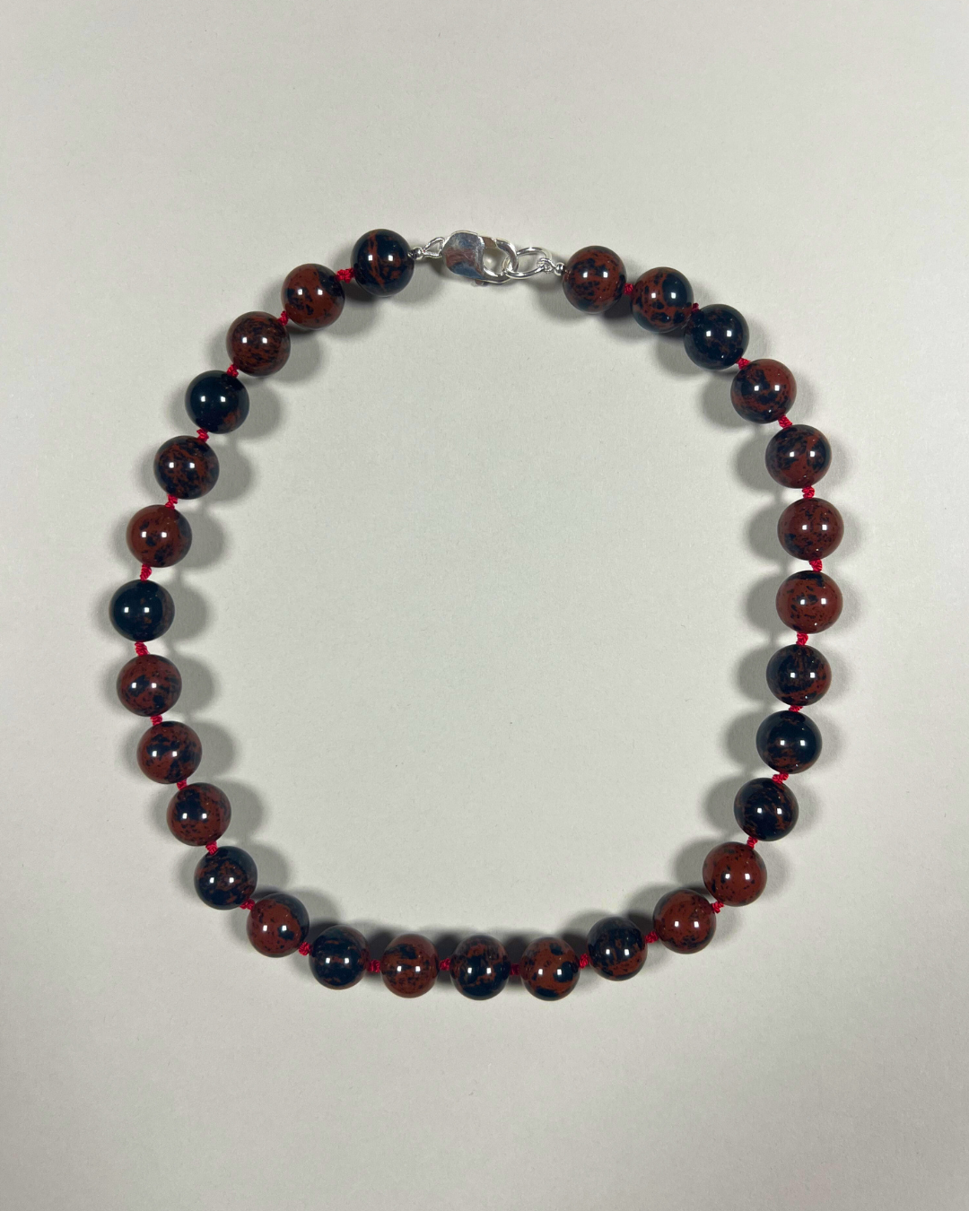 A one-of-a-kind heirloom necklace featuring 12mm mahogany obsidian beads, individually hand-knotted on bright red silk and finished with a chunky sterling silver clasp. The deep, earthy tones of the stone are heightened by the vibrant thread, creating a striking balance of warmth and strength.
