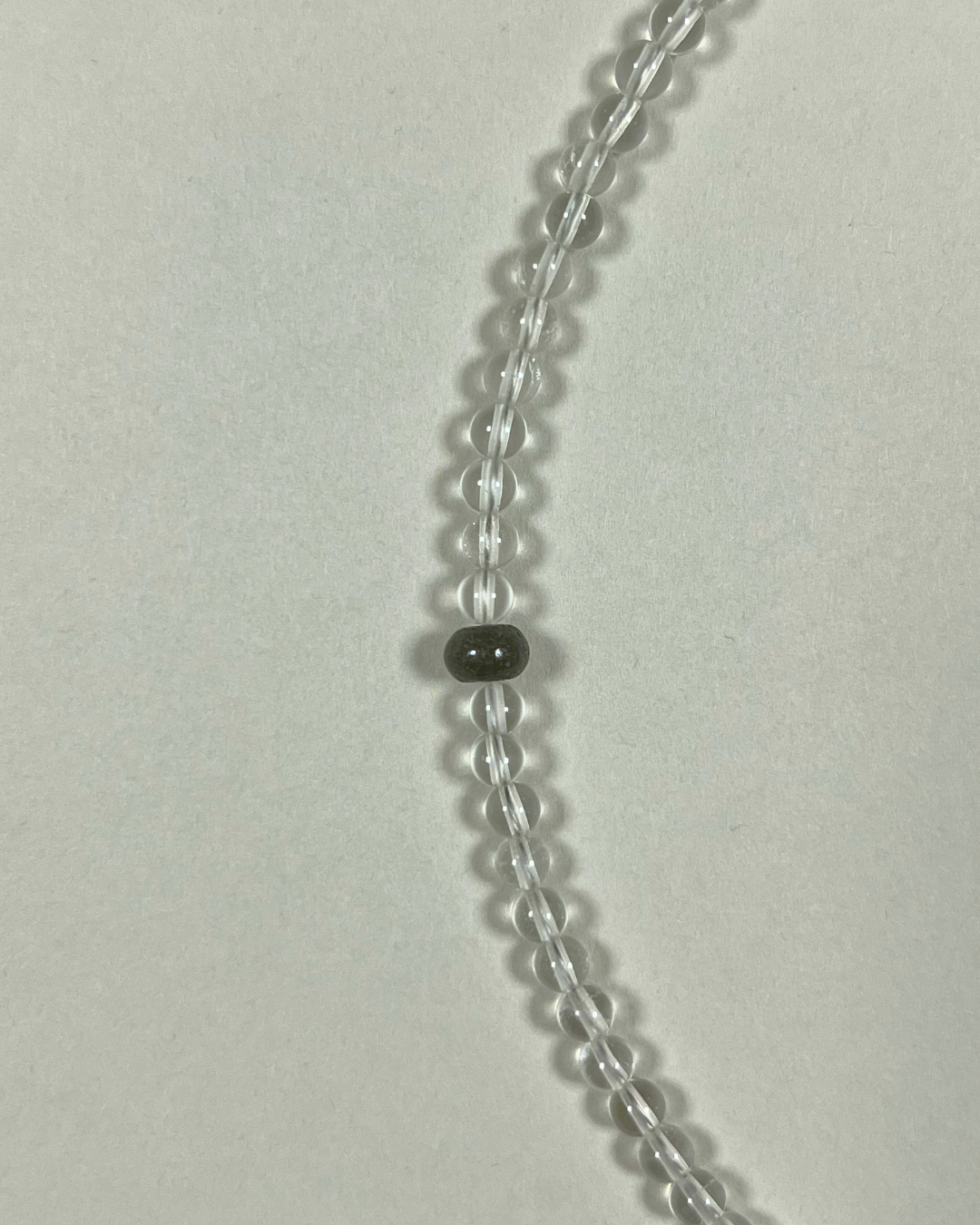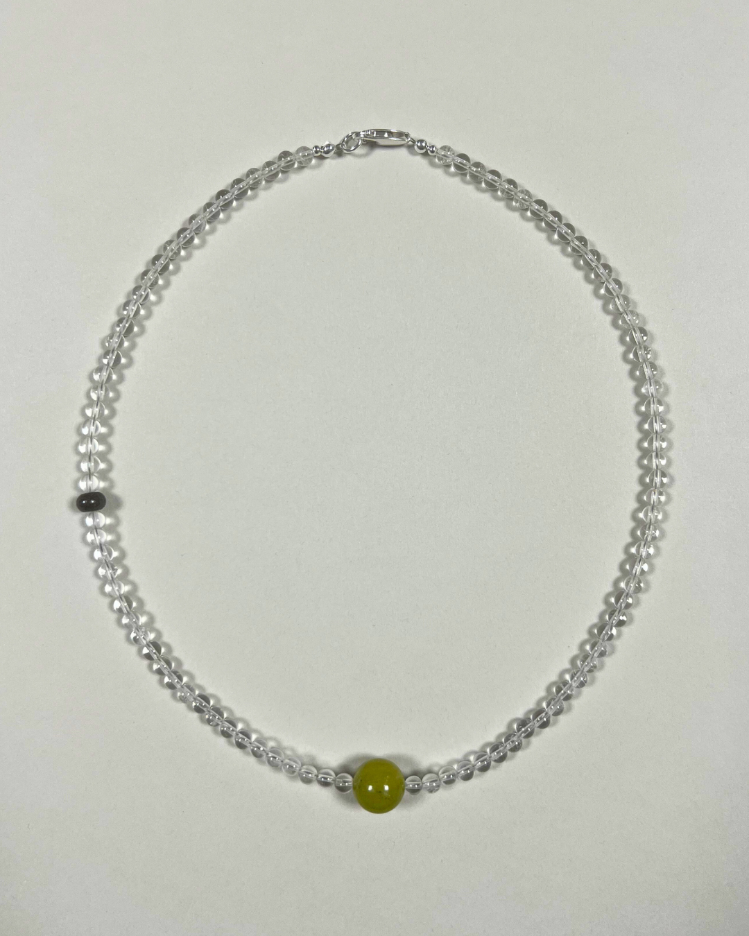 A one-of-a-kind necklace featuring petite clear quartz beads, hand-strung and finished with sterling silver findings and clasp. Accented with olive jade and a bronzite rondelle, adding earthy depth and balance to the luminous quartz.