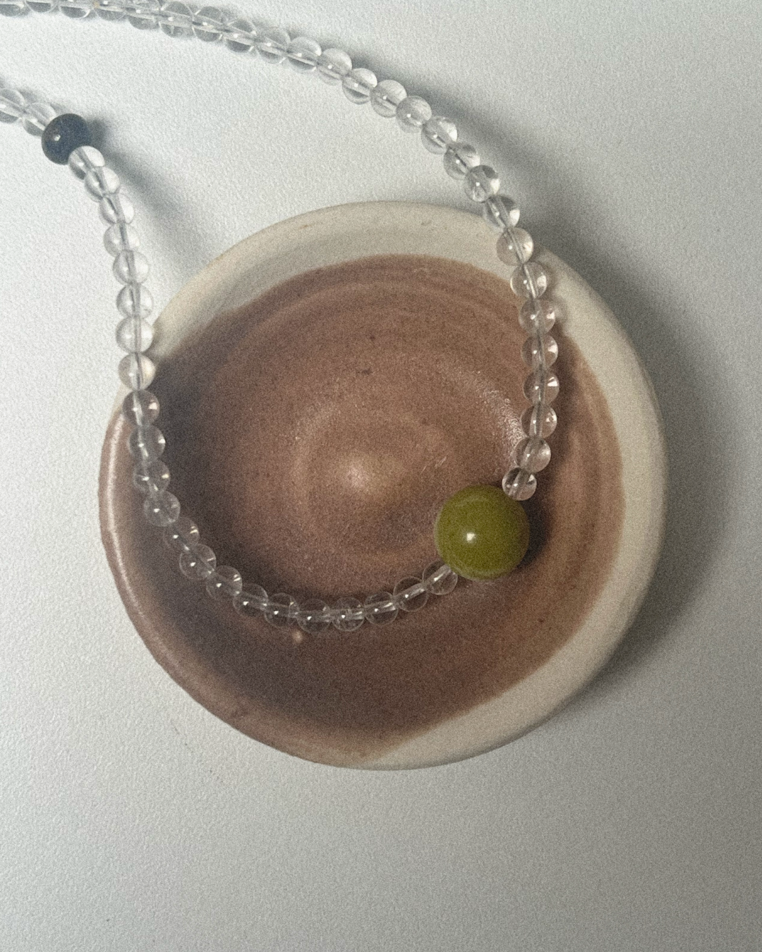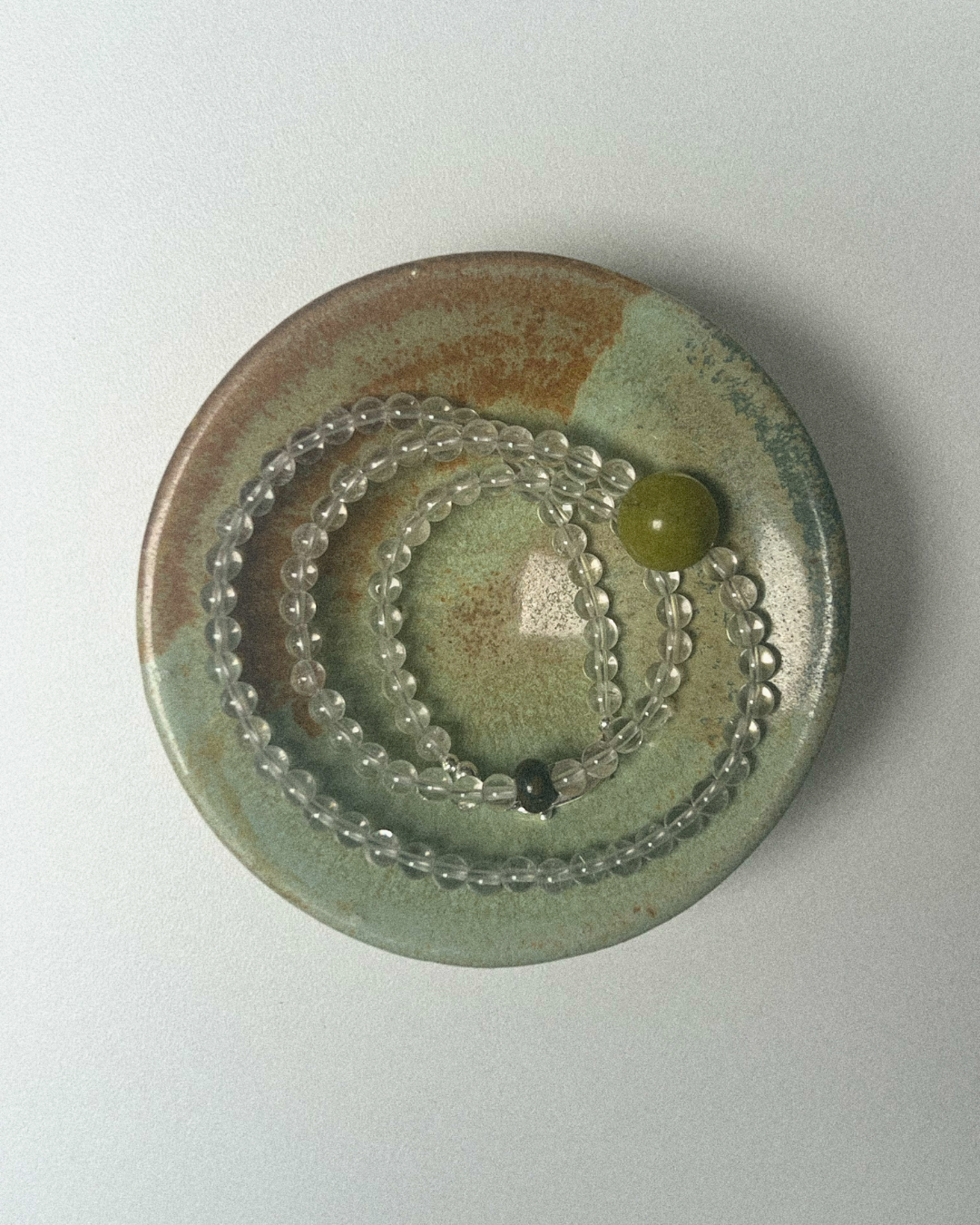 Clear quartz is associated with clarity, focus, and energetic amplification. Olive jade is linked to harmony and protection, while bronzite brings stability, grounding, and resilience. Together, they create a piece that feels light yet steady — luminous, balanced, and quietly protective.