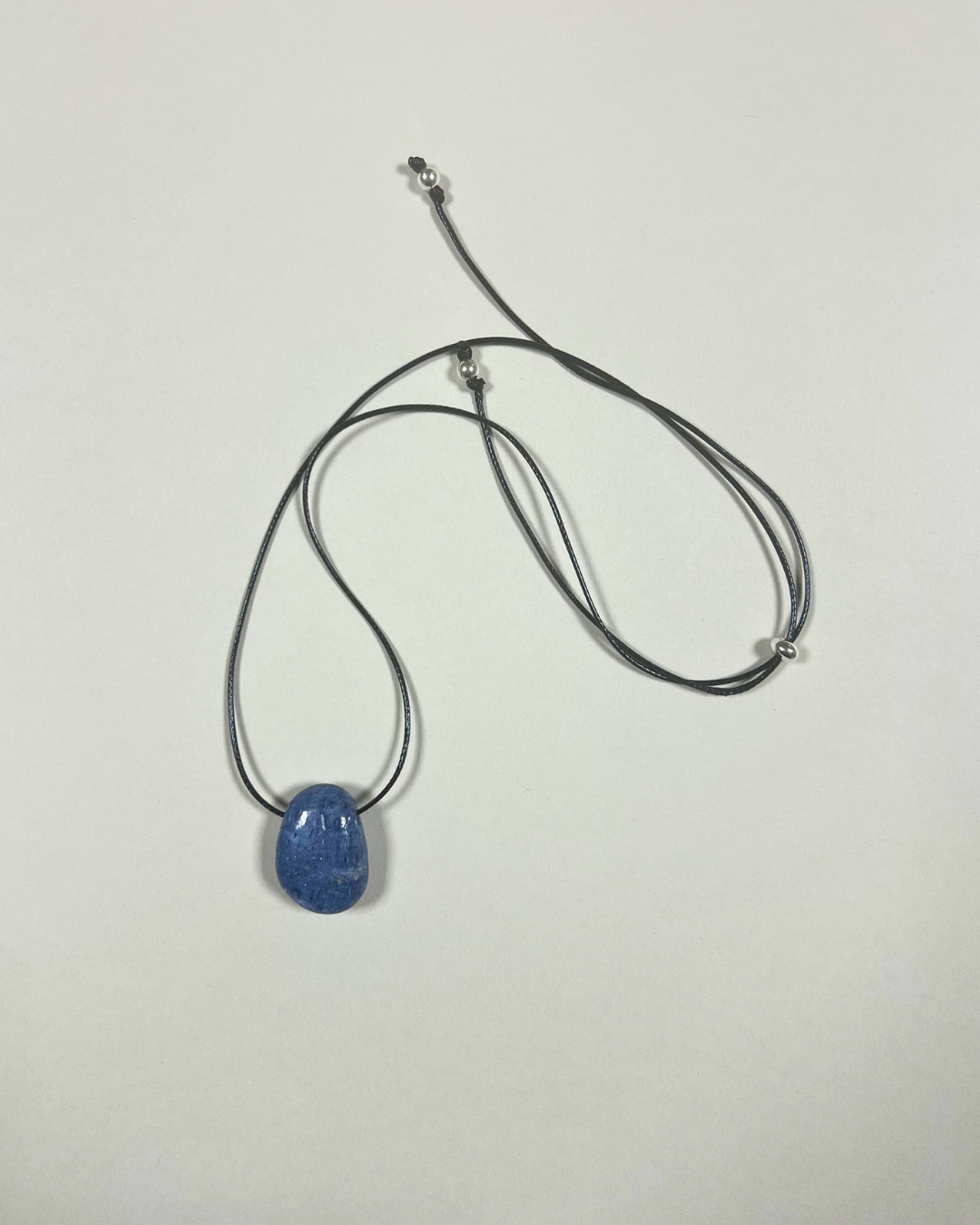A statement necklace featuring a textured blue coral Forma pendant, suspended from a black cord and secured with a sterling silver slider bead and accent beads. Designed for versatility, it can be worn at any length, adjusting effortlessly from long and elegant to a closer fit.