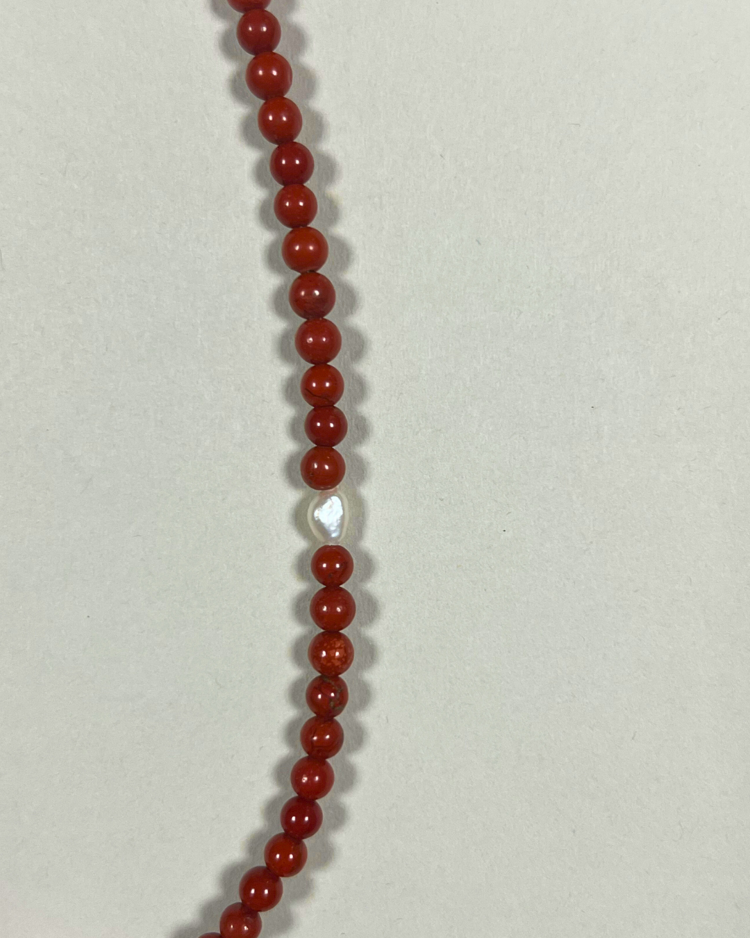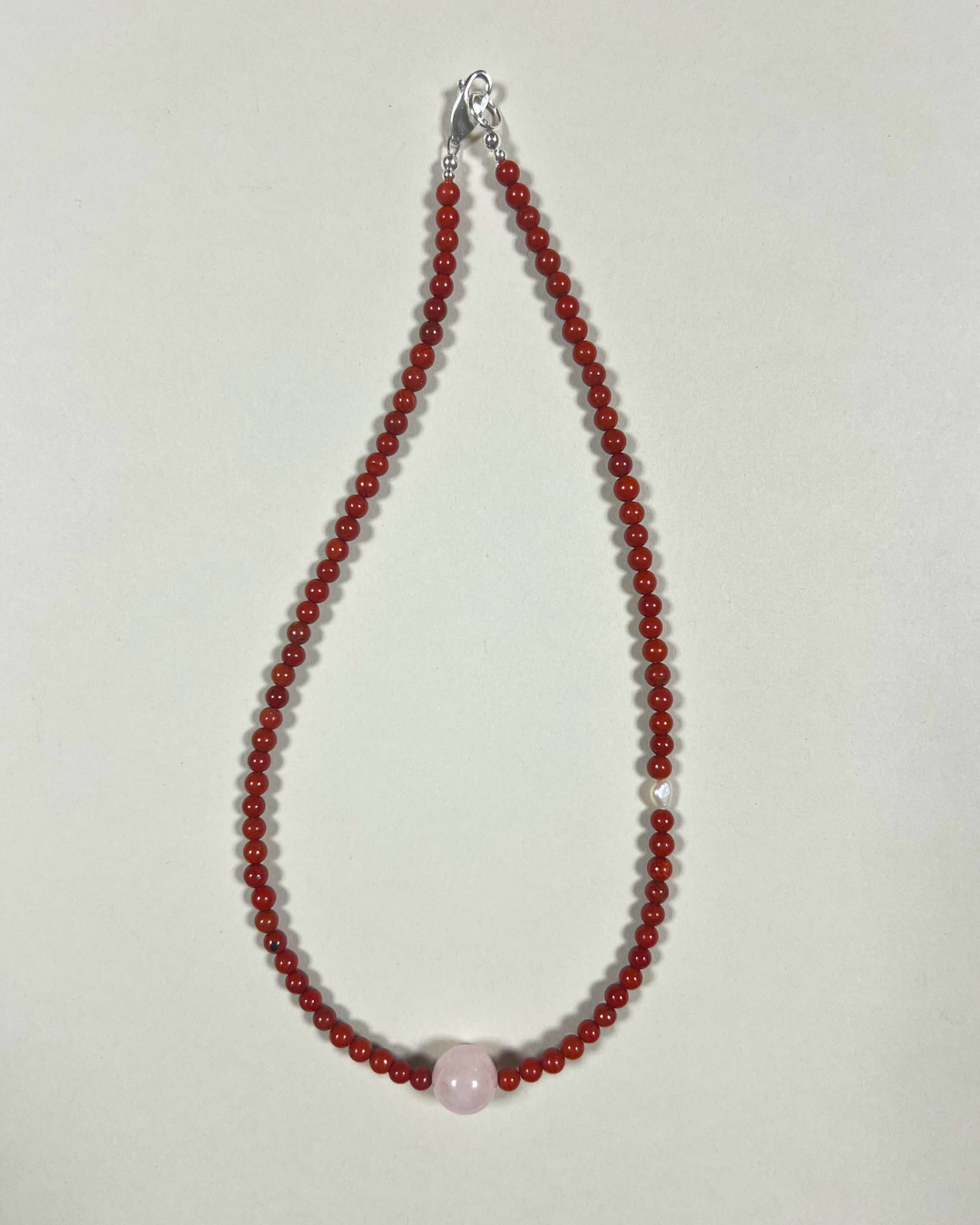 A one-of-a-kind necklace featuring petite 4 mm red jasper beads with a central smooth rose quartz sphere and a tiny accent freshwater pearl. All findings and clasp are sterling silver.