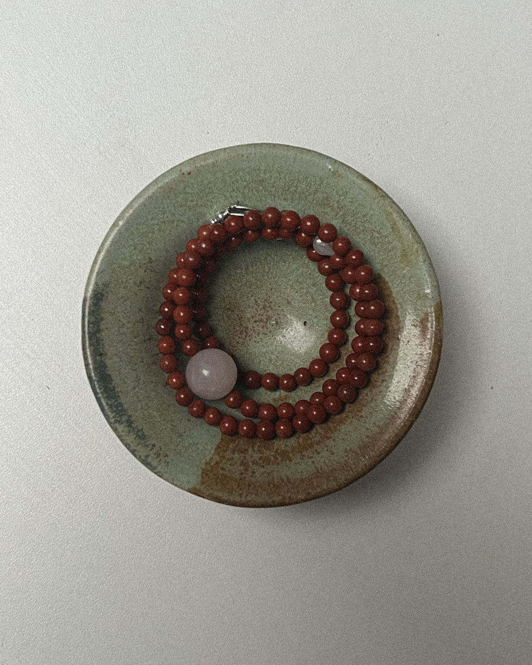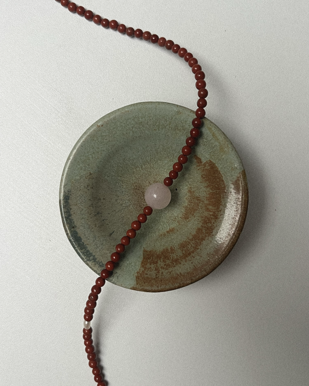 Red jasper is known for its grounding warmth and steady support, offering a sense of stability and quiet strength through its earthy red tone. Rose quartz brings softness and gentle openness, often associated with compassion and emotional ease. The small freshwater pearl adds a subtle note of reflection, balancing the palette with calm refinement. Together, they create a piece that feels warm, steady, and softly comforting.
