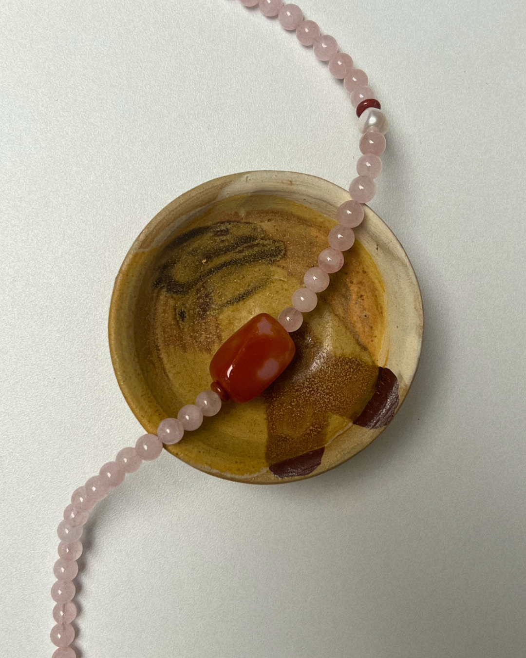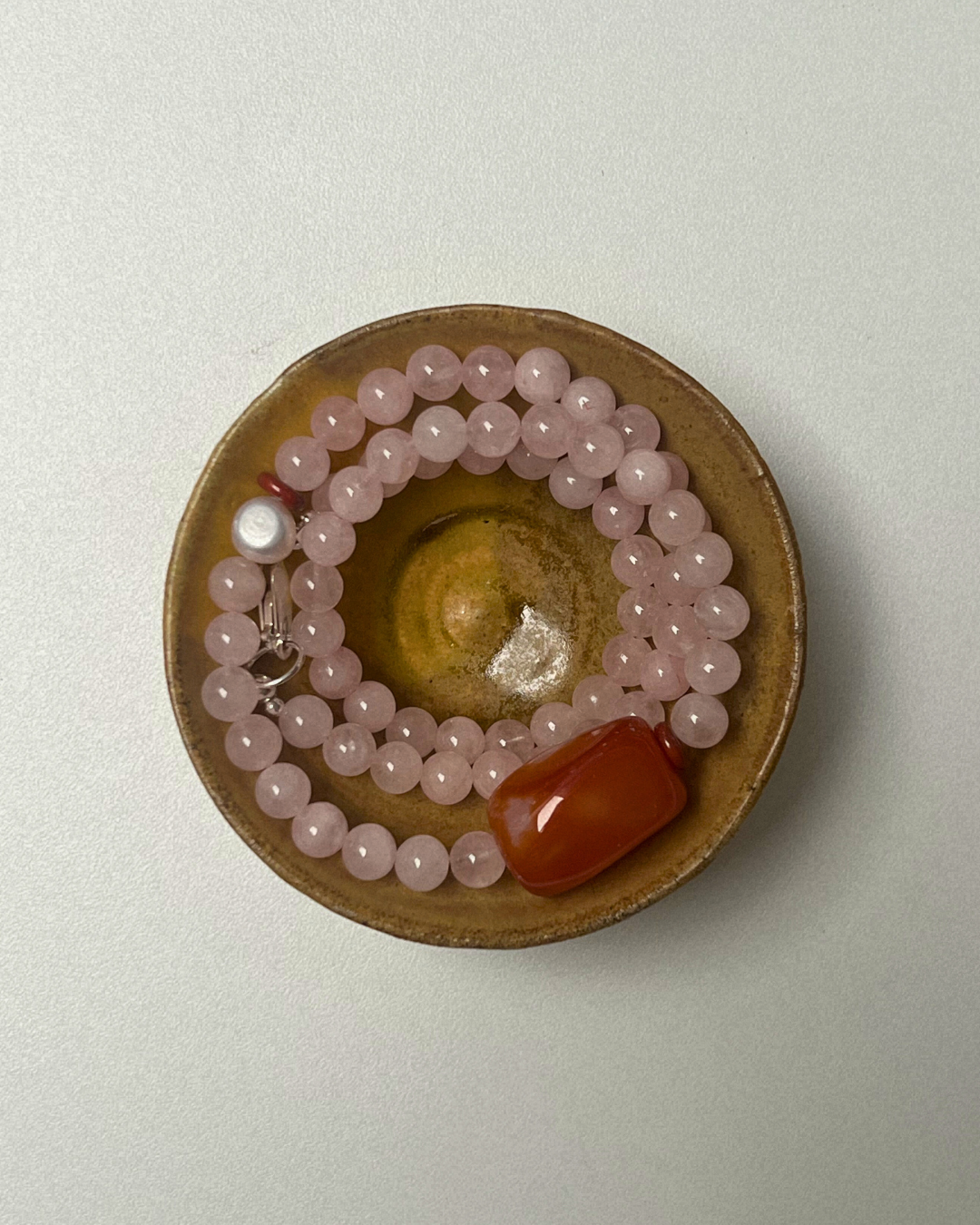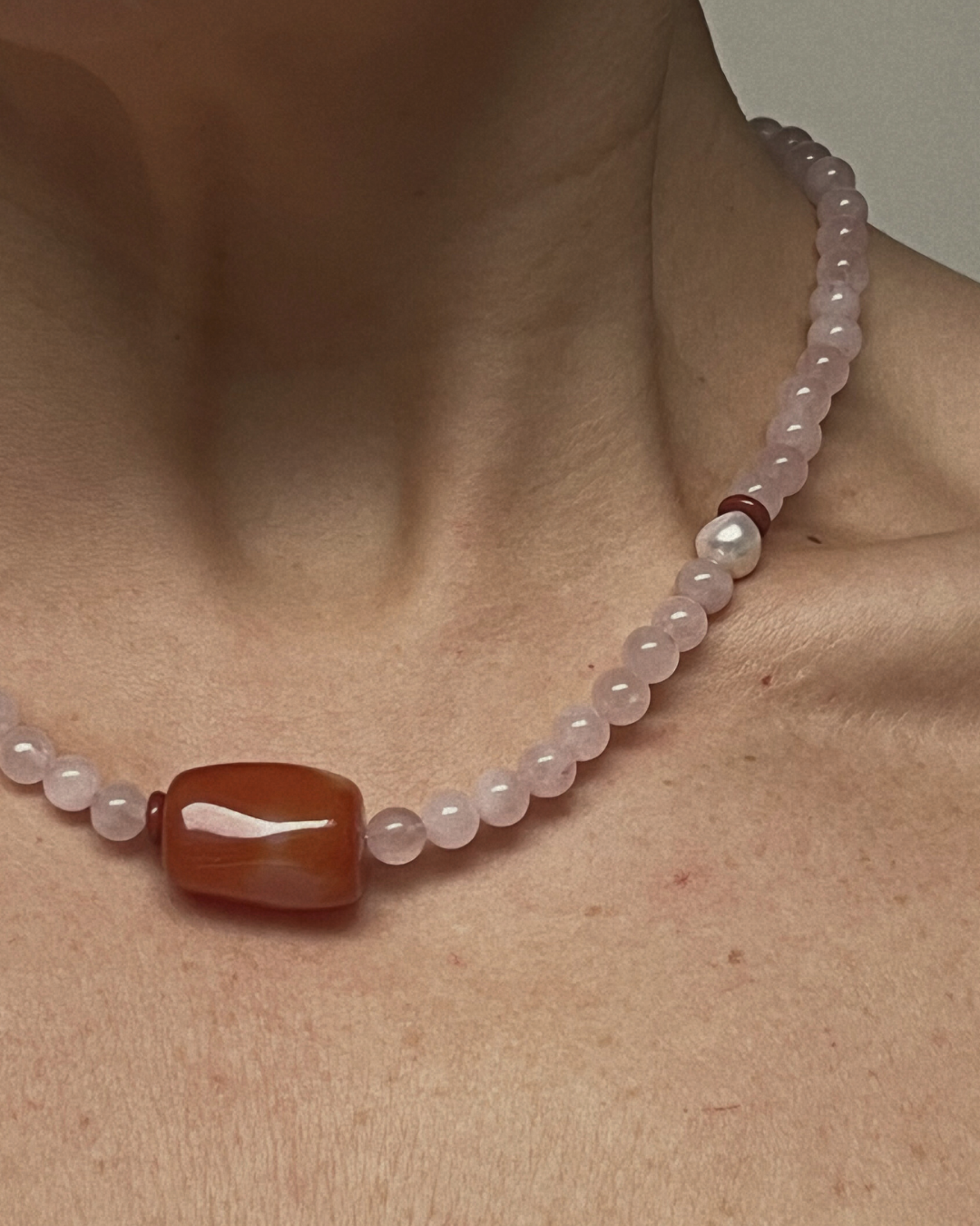 Rose quartz brings softness and gentle warmth through its pale blush tone, offering calm and openness. Carnelian adds a steady, grounded vitality at the centre, while red jasper reinforces depth and quiet strength. The freshwater pearl introduces a subtle point of light, balancing the richer tones. Together, the piece feels warm, centred, and quietly assured.