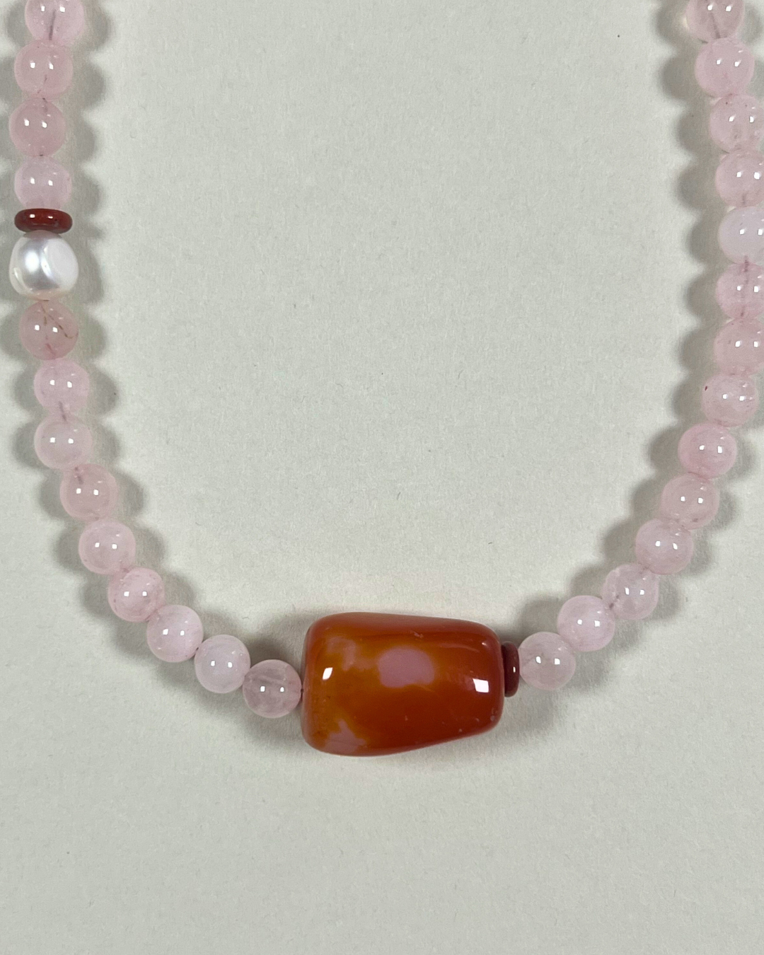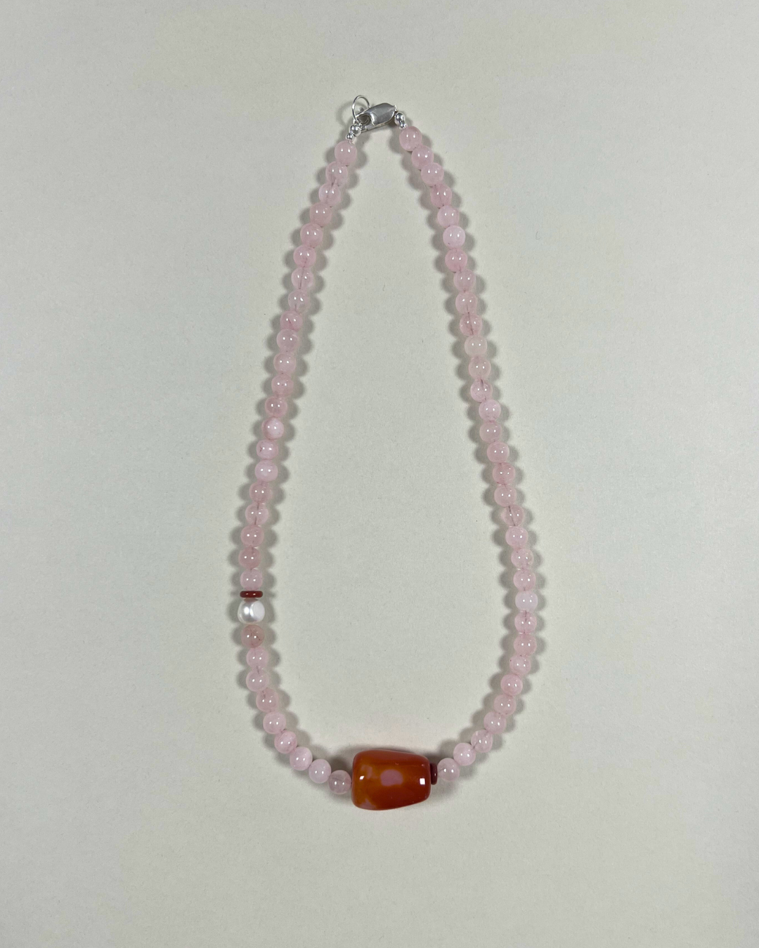 A one-of-a-kind necklace featuring 6 mm rose quartz beads with a central orange carnelian, accented by a freshwater pearl and a red jasper rondelle. All findings and clasp are sterling silver.