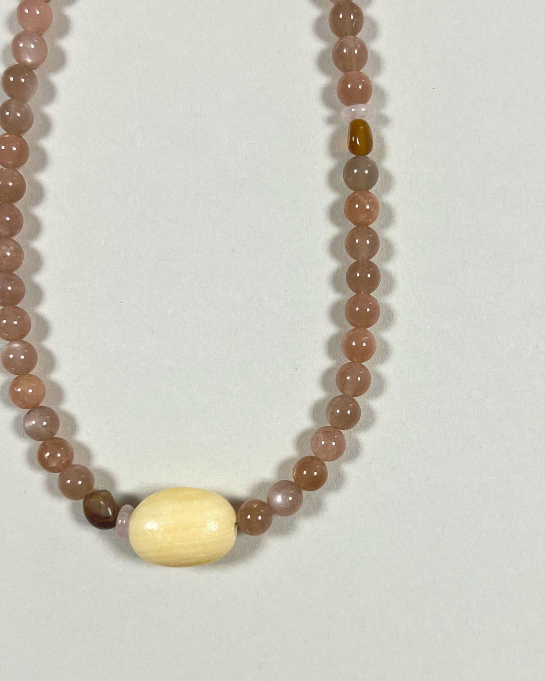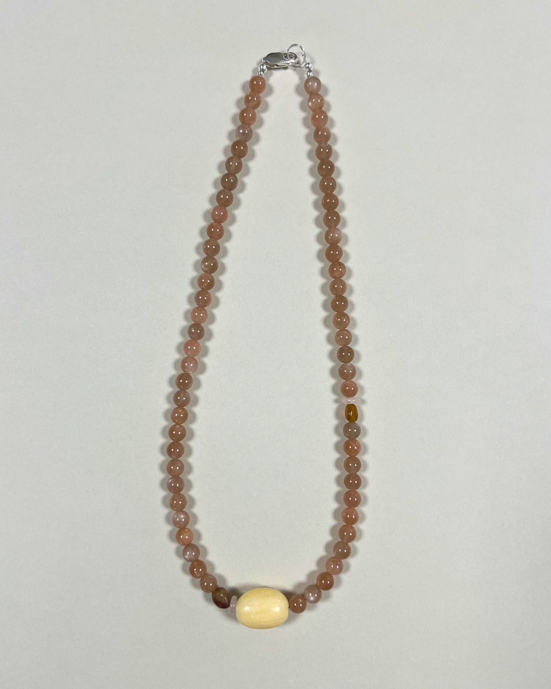 A one-of-a-kind necklace featuring 6 mm sunstone beads with a central yellow calcite, accented with jade and rose quartz. All findings and clasp are sterling silver.