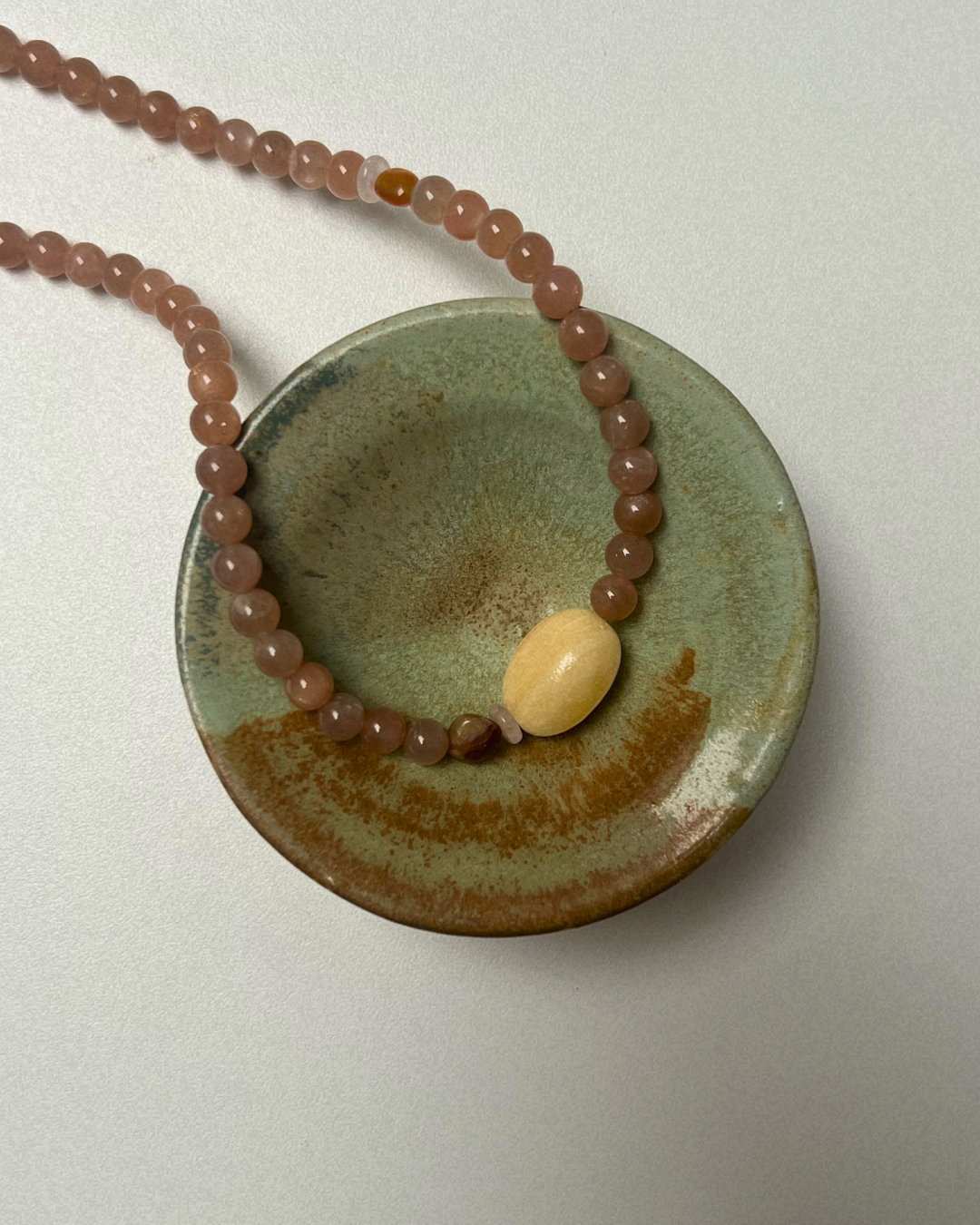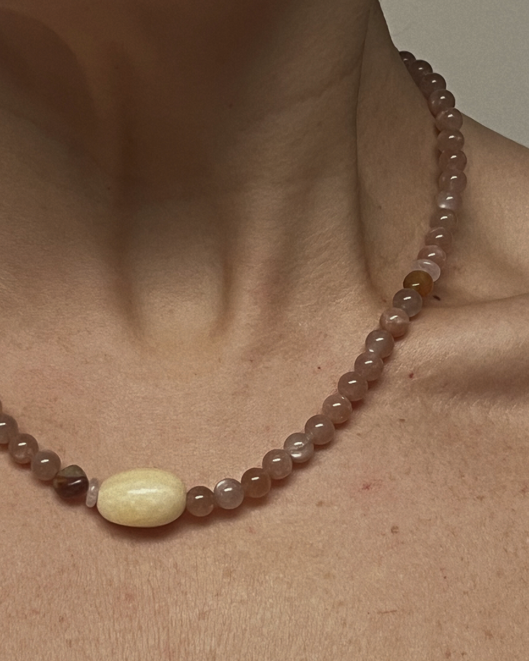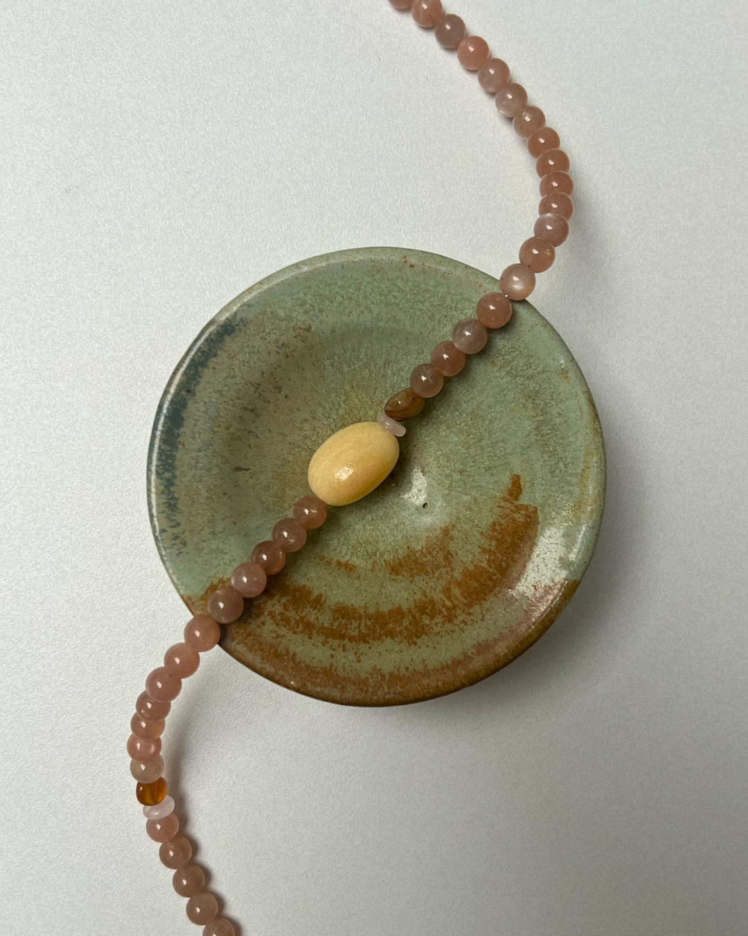 Sunstone brings a soft, luminous warmth with its gentle shimmer, offering lightness and quiet optimism. Yellow calcite adds a clear, sunny centre, while jade introduces steadiness and rose quartz softens the palette with calm ease. Together, the piece feels bright, balanced, and gently uplifting.