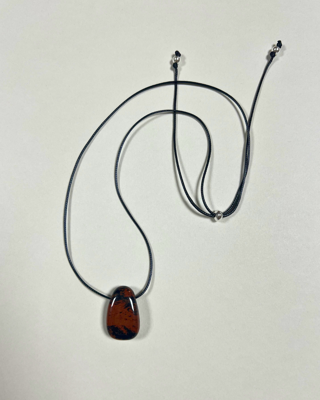 A statement necklace featuring a smooth mahogany obsidian Forma pendant, suspended from a black cord and secured with a sterling silver slider bead and accent beads. Designed for versatility, it can be worn at any length, adjusting effortlessly from long and elegant to a closer fit.