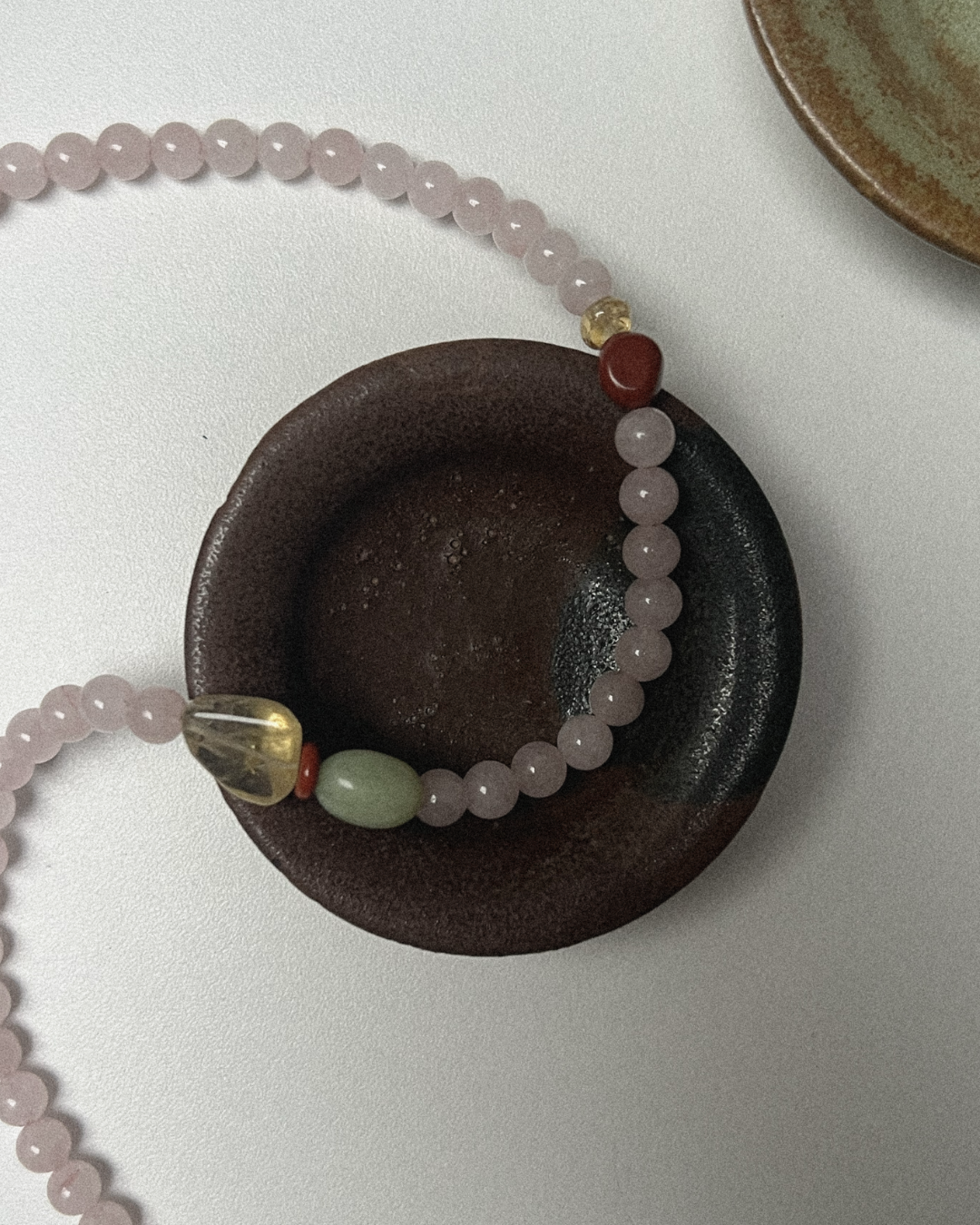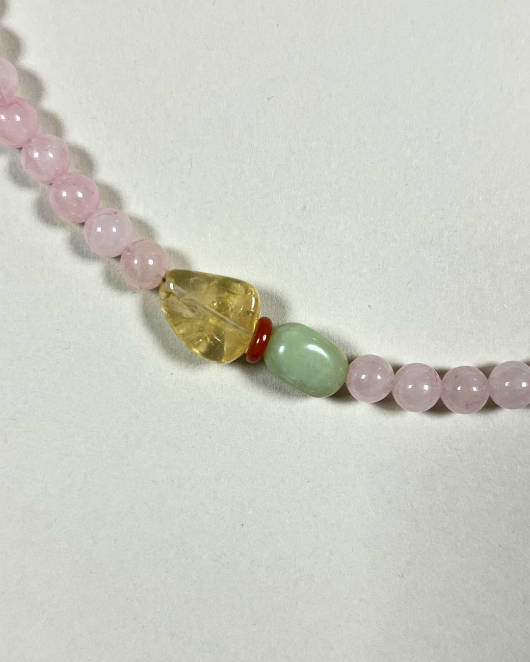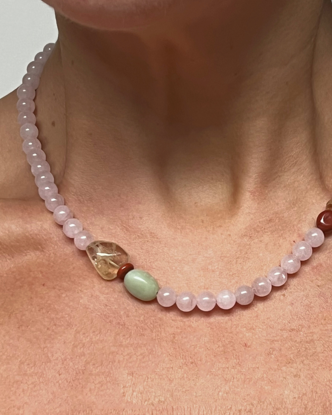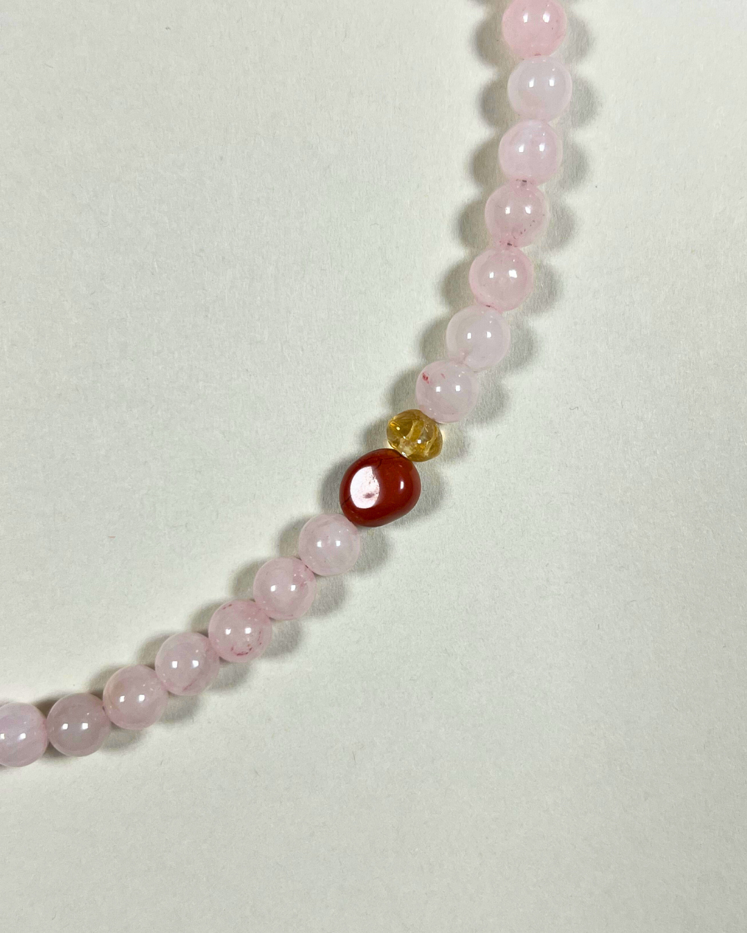 Rose quartz carries a soft, nurturing energy - a stone of compassion and emotional clarity. Citrine adds warmth and optimism, while red jasper grounds and strengthens. Bowenite lends calm and protection, weaving the elements together in harmony. The result is a piece that feels balanced, heartfelt, and quietly radiant.
