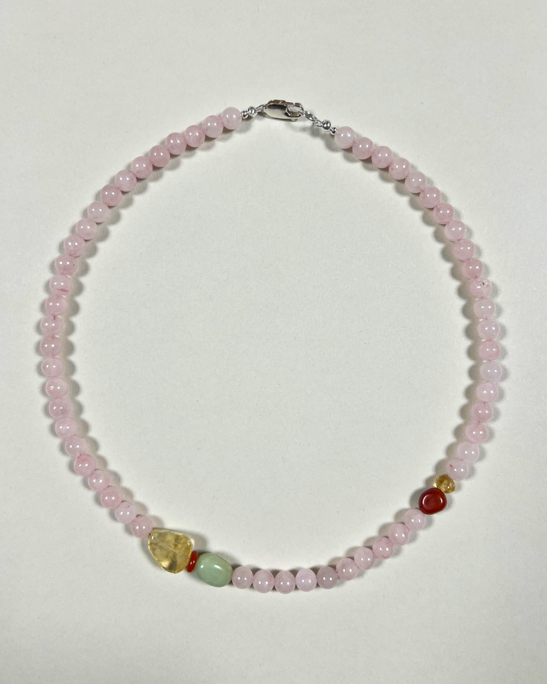A one-of-a-kind necklace featuring 6mm rose quartz beads with an accent stack of citrine, red jasper, and bowenite, alongside an off-centre red jasper nugget and an irregular citrine button bead. All findings and clasp are sterling silver.