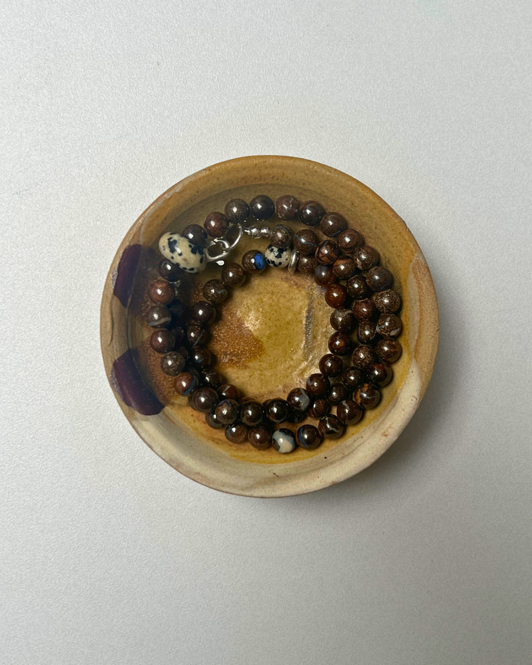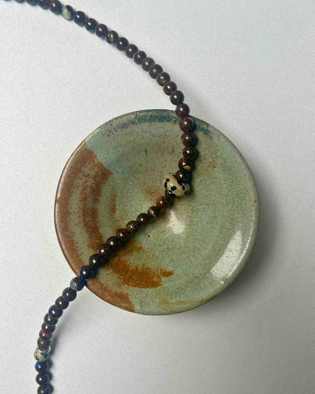 Boulder opal brings softness and depth through its natural patterning, offering a sense of calm and quiet variation. Dalmatian jasper adds grounding contrast and gentle playfulness, while the silver accents provide subtle points of light. Together, the piece feels balanced, tactile, and quietly expressive.