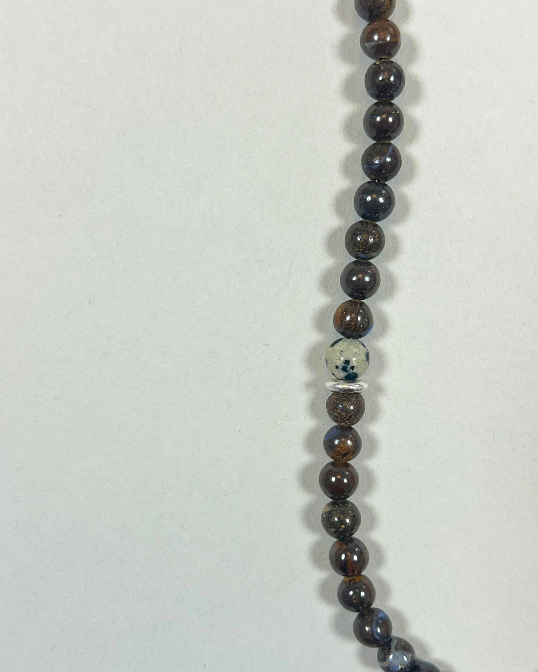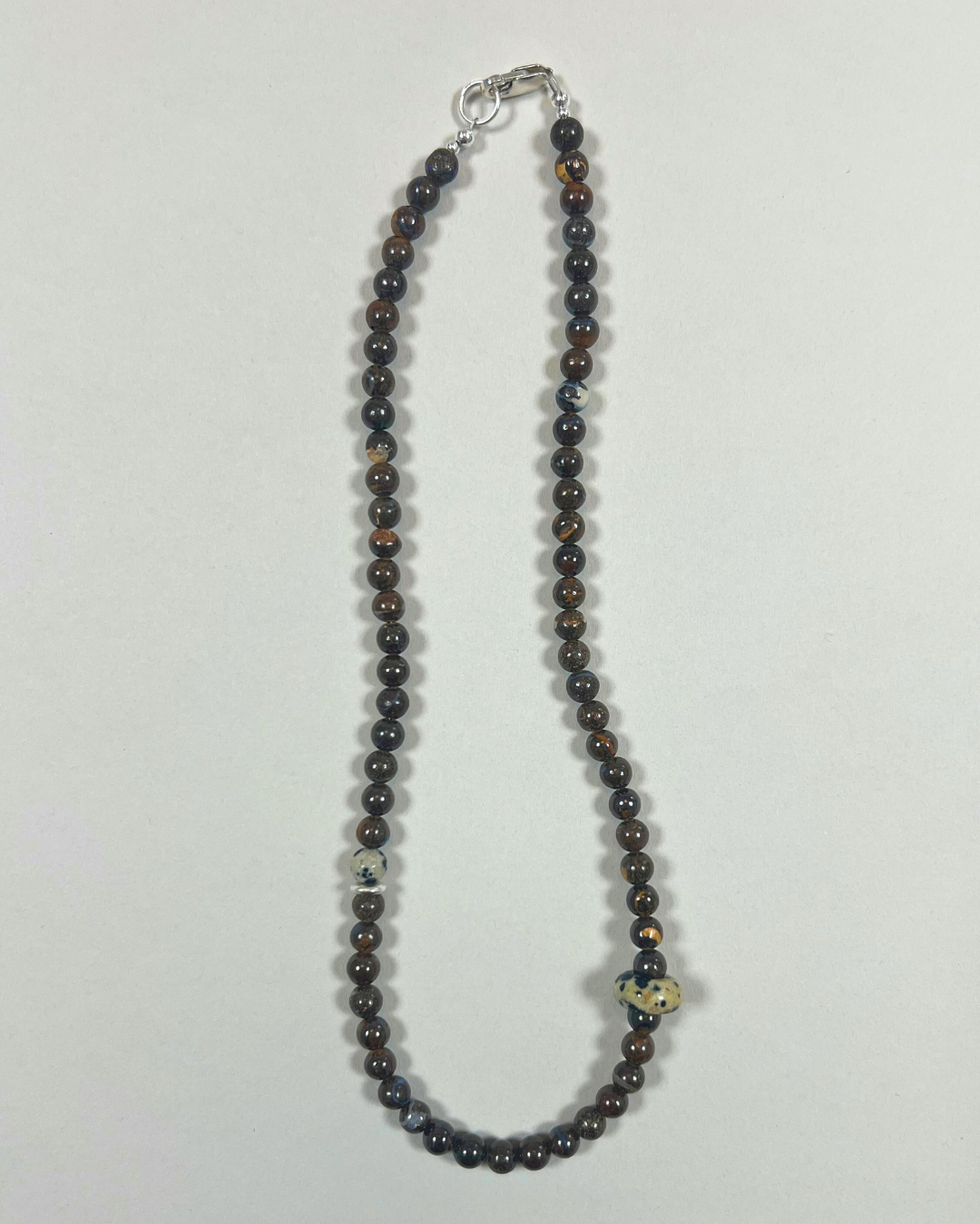 A one-of-a-kind necklace featuring 6 mm boulder opal beads with accents of dalmatian jasper and fine silver stud beads. All findings and clasp are sterling silver.
