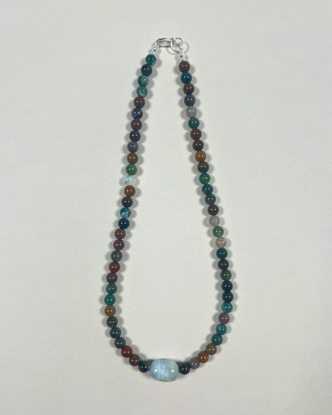 A one-of-a-kind necklace featuring 6 mm Indian agate beads with a central pale blue beryl. All findings and clasp are sterling silver.