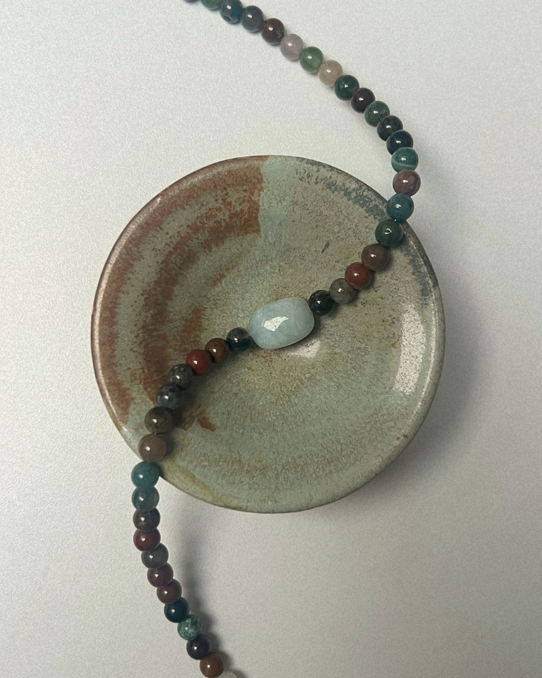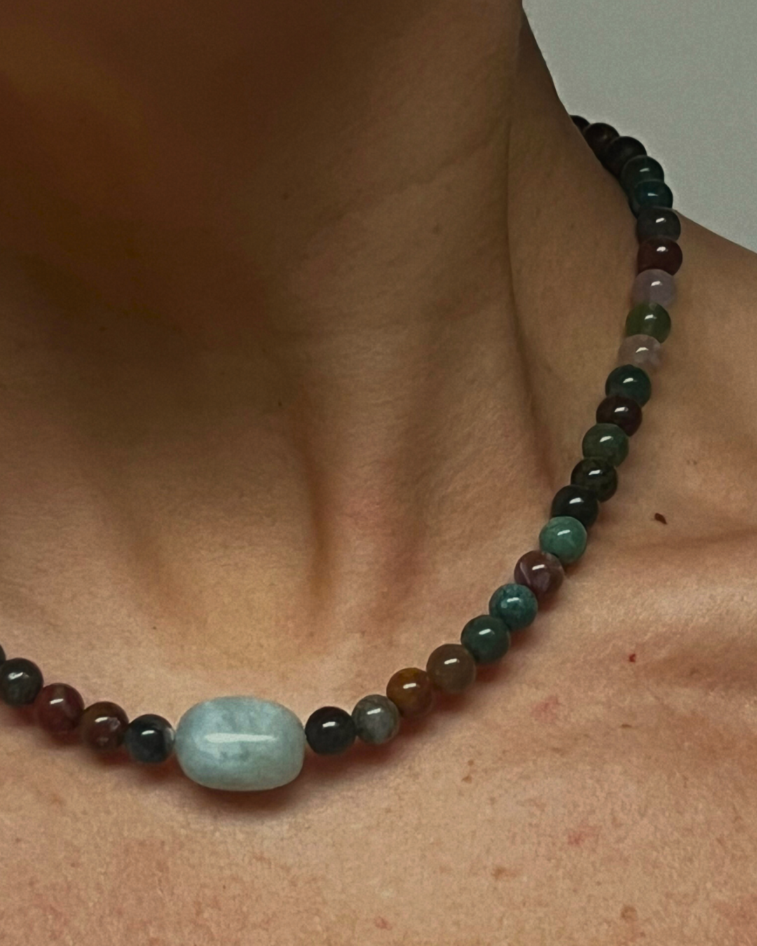 Indian agate brings grounding balance through its natural variation of earthy greens, browns, and muted tones, offering steadiness and quiet depth. Pale blue beryl adds a soft clarity and lightness at the centre, creating a gentle contrast. Together, the piece feels calm, composed, and naturally harmonious.