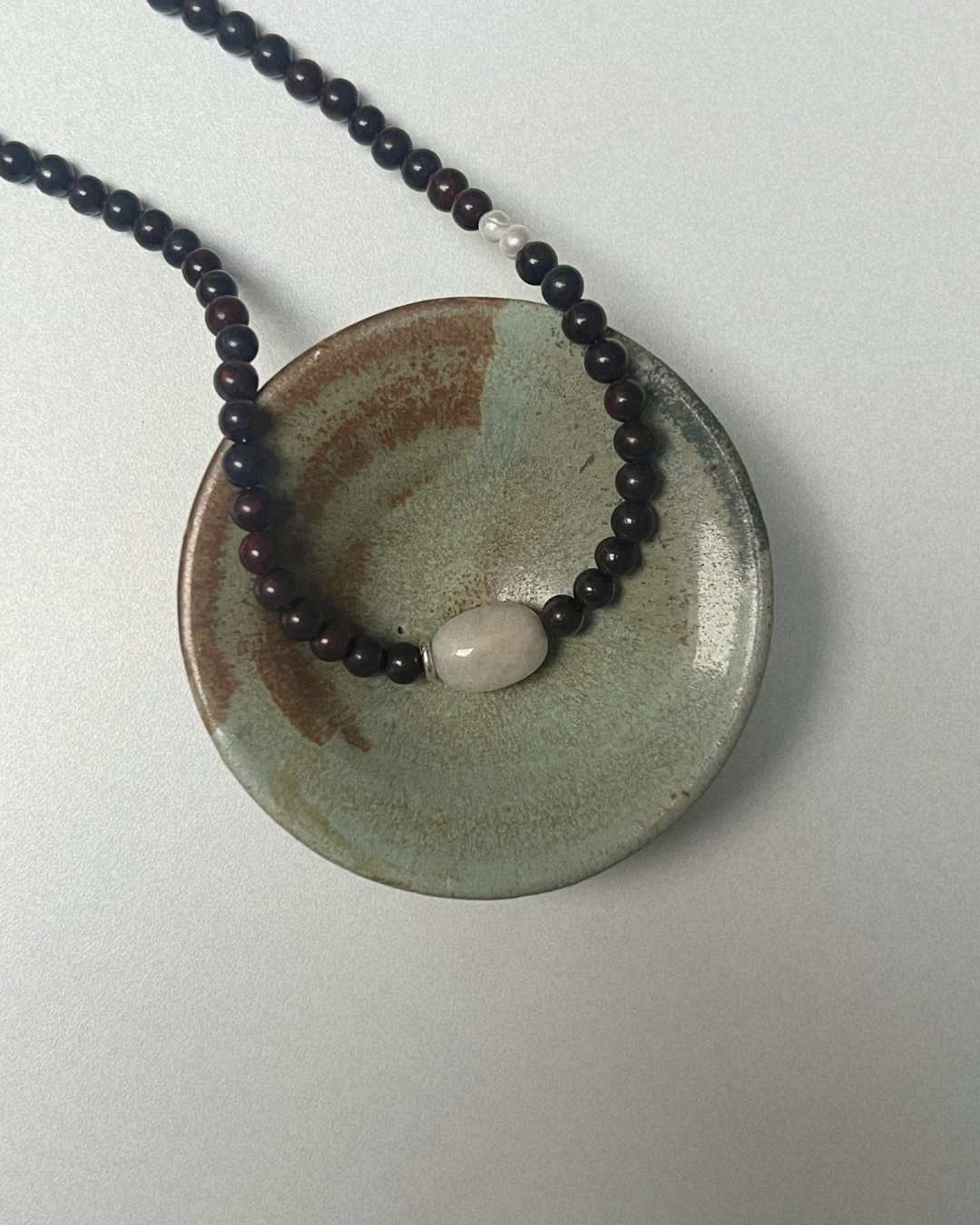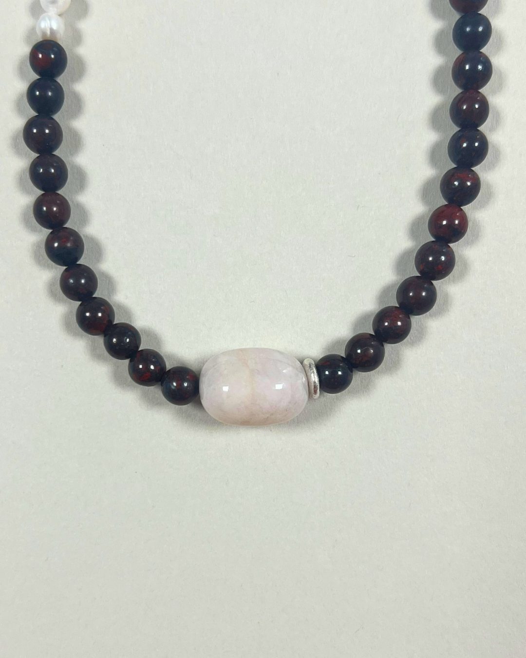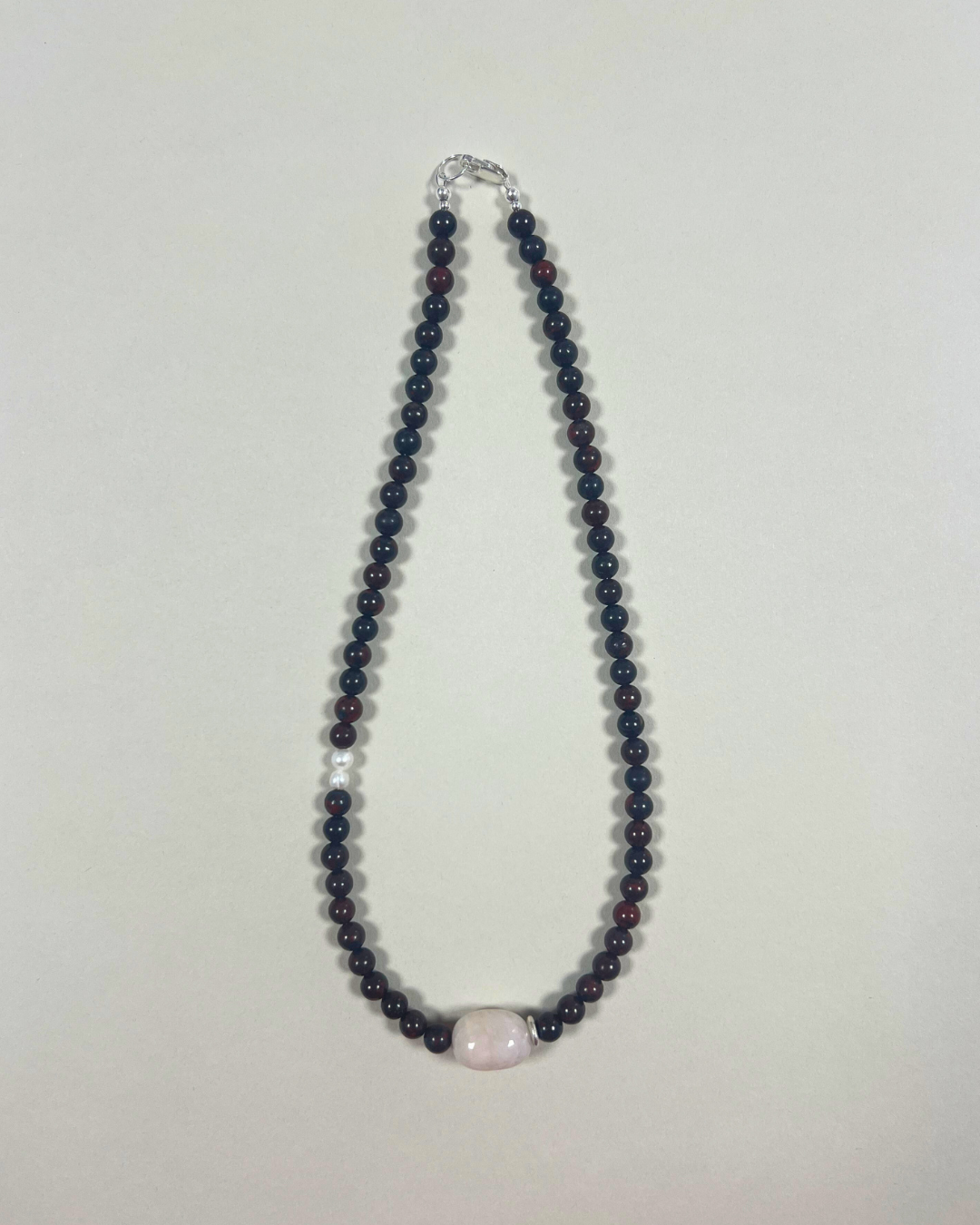 Bloodstone brings grounding strength and resilience through its rich, earthy tone, while pale pink beryl adds softness and gentle clarity. The freshwater pearls introduce a quiet luminosity, with the silver accent offering a subtle point of balance. Together, the piece feels steady, tender, and thoughtfully composed.