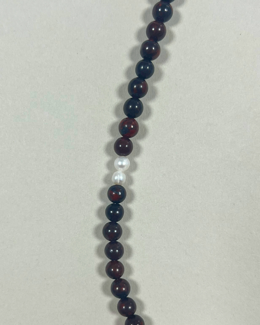 A one-of-a-kind necklace featuring 6 mm deep red bloodstone beads with a central pale pink beryl, accented with a fine silver stud bead and a double stack of petite freshwater pearls. All findings and clasp are sterling silver.