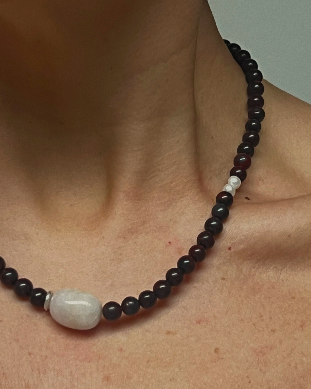 Each Adorned necklace is handcrafted with natural gemstones and sterling silver and should be handled with care. While securely strung, avoid pulling or tugging on the necklace or clasp.