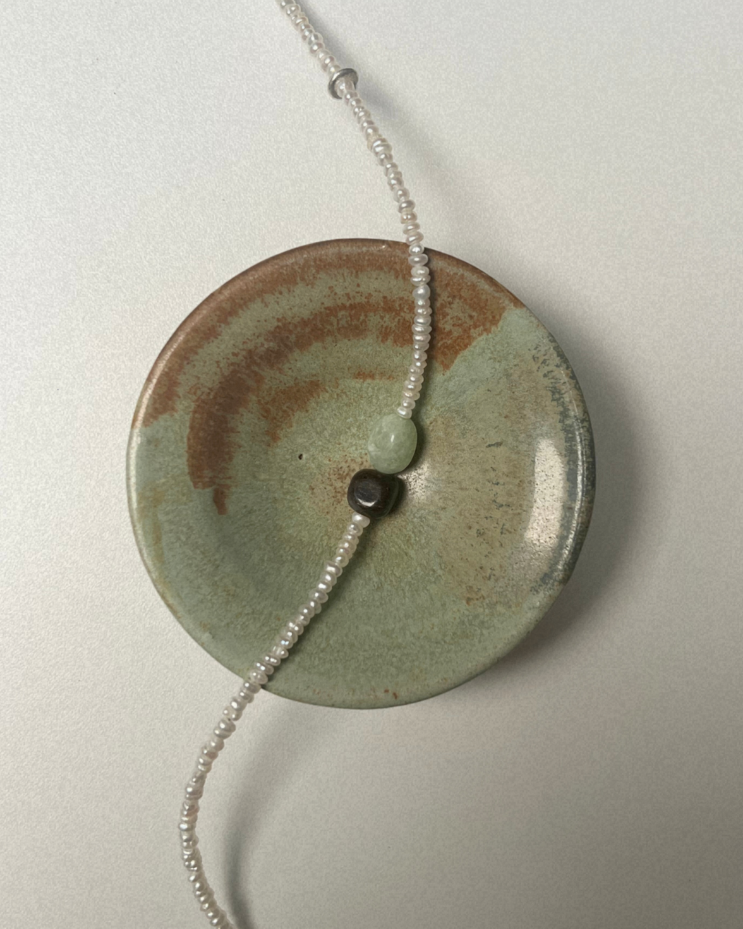 The freshwater pearls bring a delicate luminosity and quiet refinement, while bowenite adds calm balance through its soft green tone. Bronzite introduces grounding warmth and depth, with the silver accent offering a subtle point of light. Together, the piece feels gentle, tactile, and quietly precious.