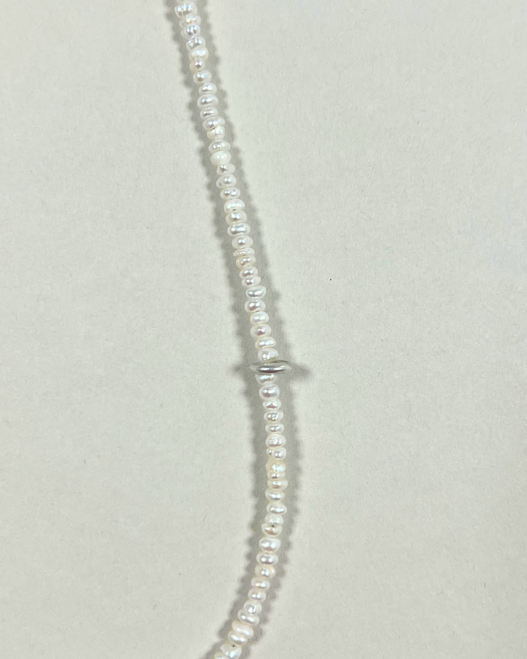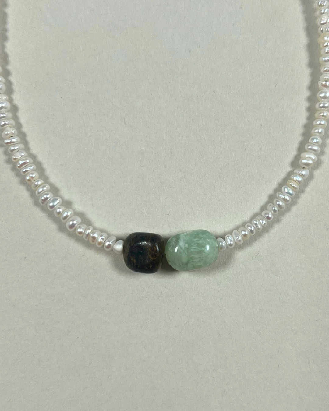 A one-of-a-kind necklace featuring super-petite 2 mm freshwater pearls with a central bowenite, accented by a bronzite nugget and a fine silver stud bead. All findings and clasp are sterling silver.