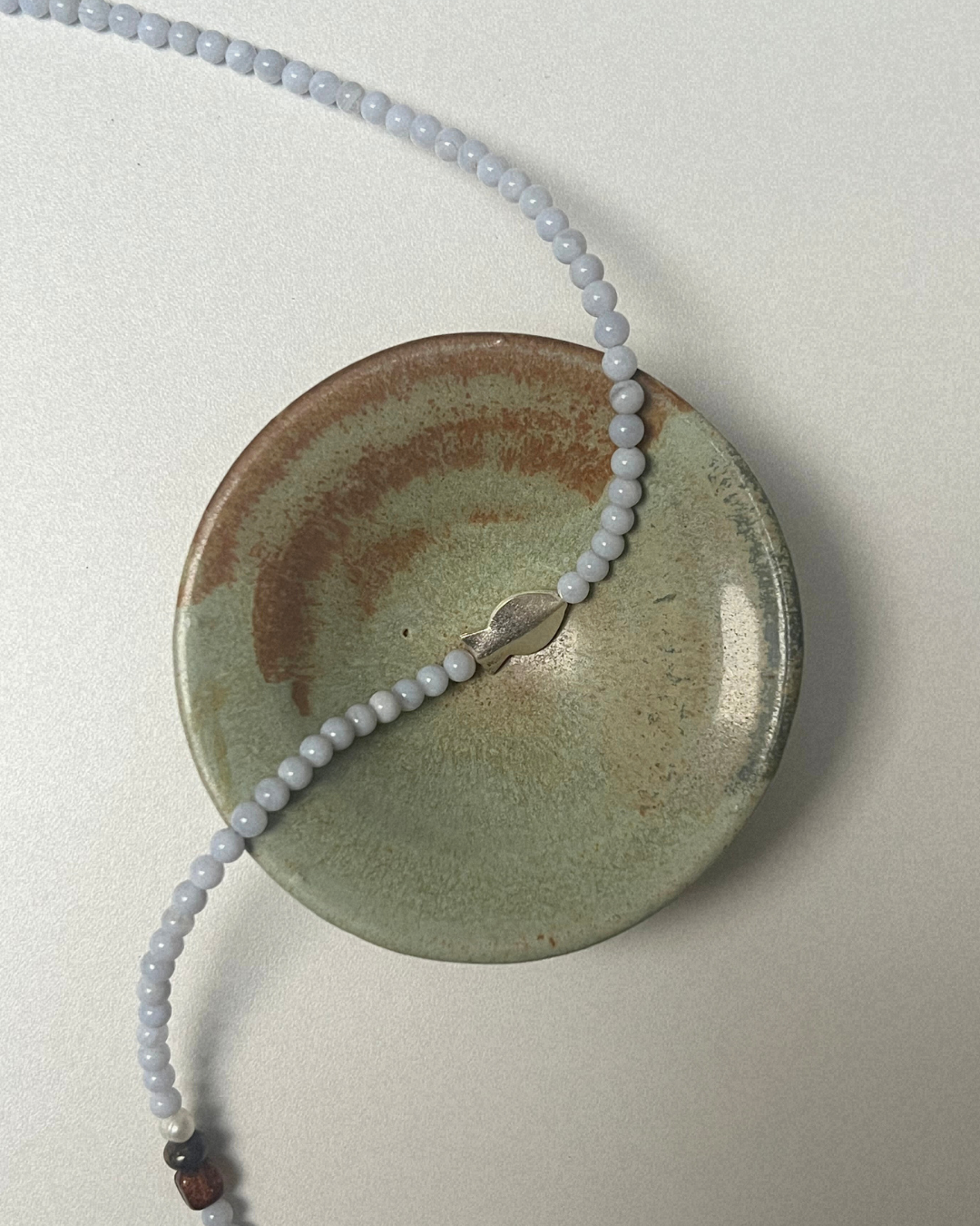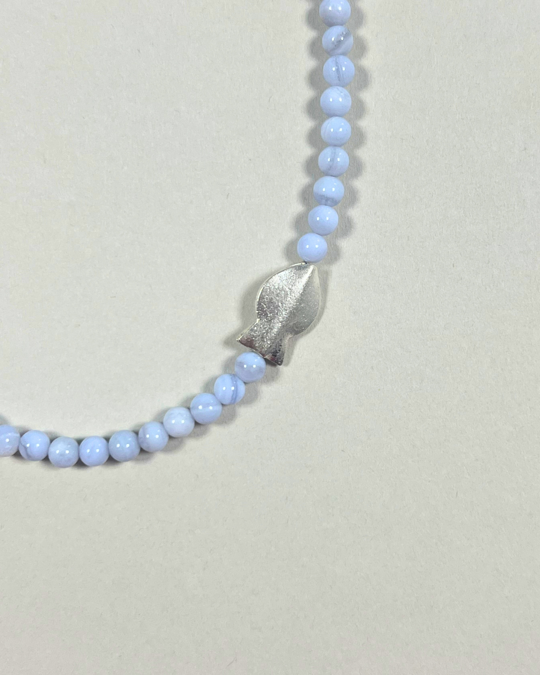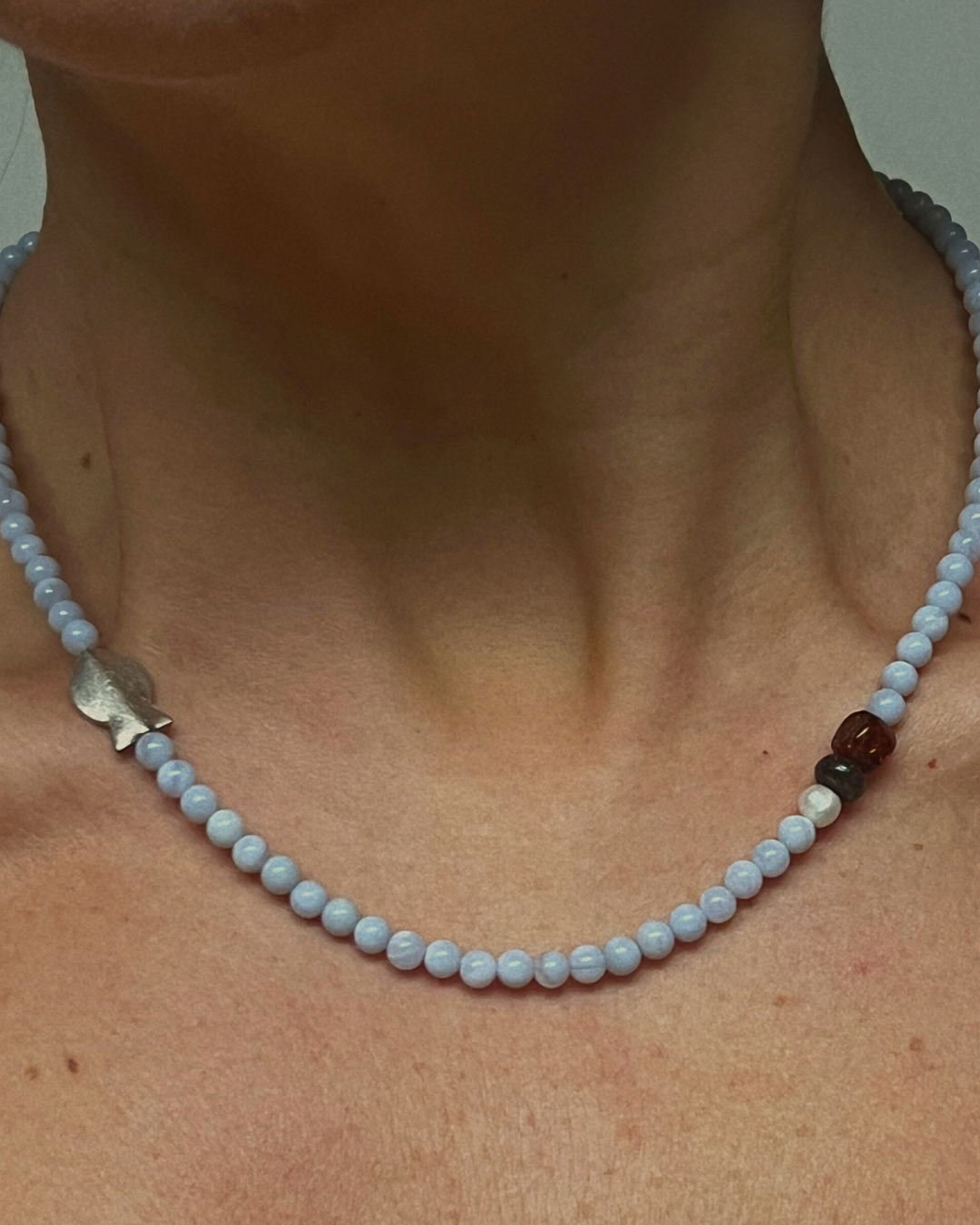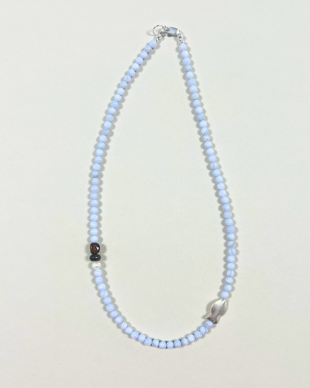 Blue lace agate brings softness and calm through its pale blue tone, offering clarity and ease. Amber adds gentle warmth and depth, while bronzite grounds the composition with a steady presence. The freshwater pearl softens the palette, and the silver fish introduces a subtle note of movement and symbolism. Together, the piece feels balanced, tactile, and quietly expressive.