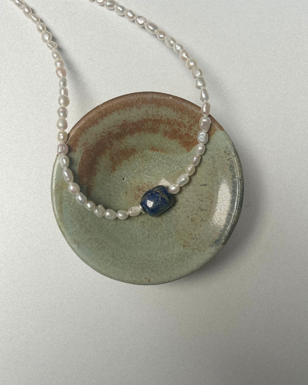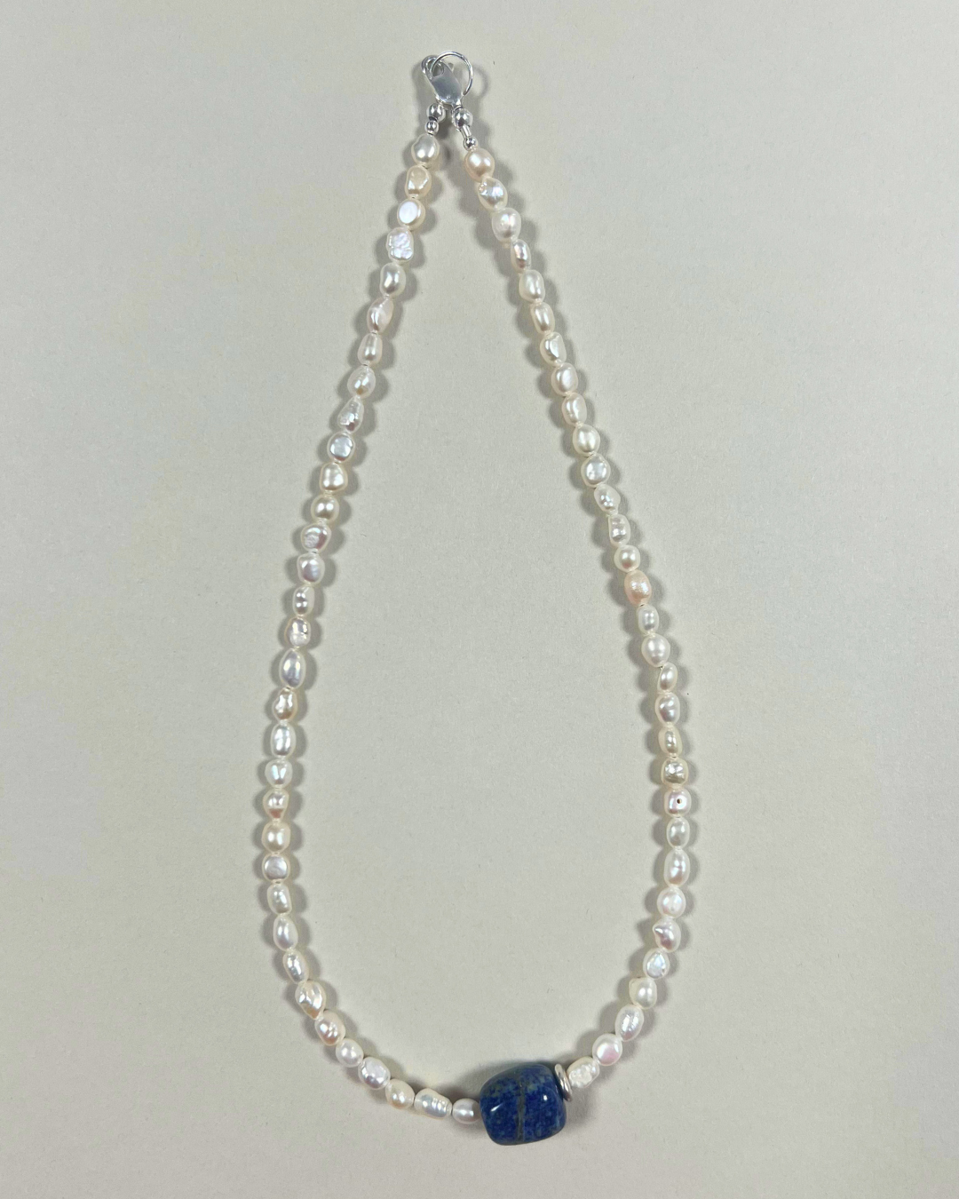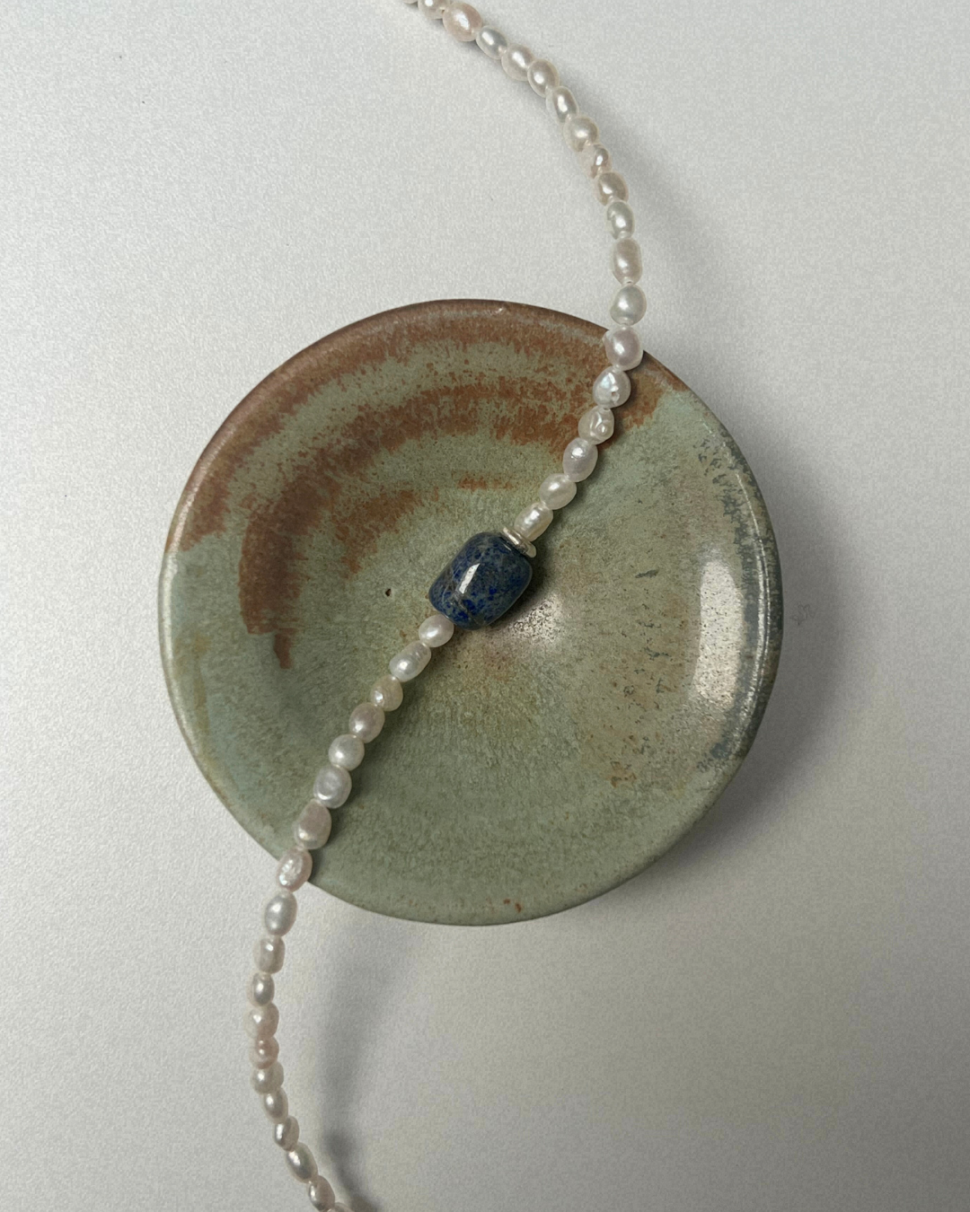 The freshwater pearls bring a soft, quiet luminosity, offering refinement and ease. Lapis lazuli adds depth and clarity through its rich blue tone, creating a gentle point of contrast. The silver accent provides a subtle lift of light, resulting in a piece that feels calm, balanced, and quietly resolved.