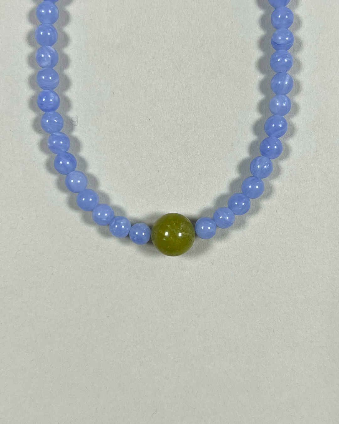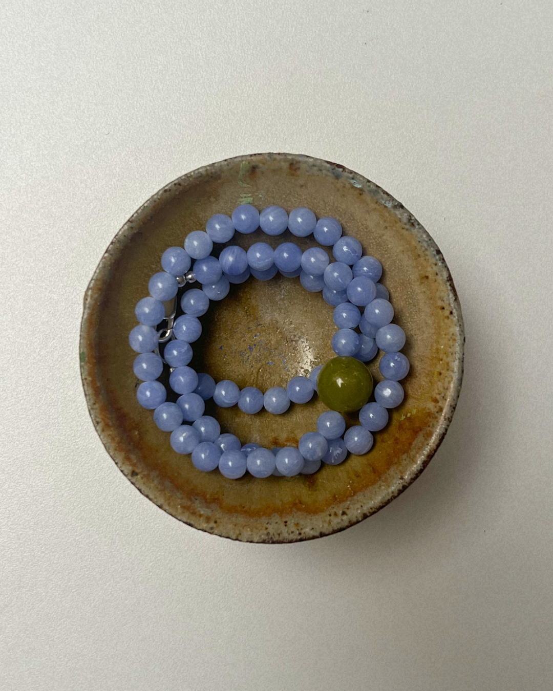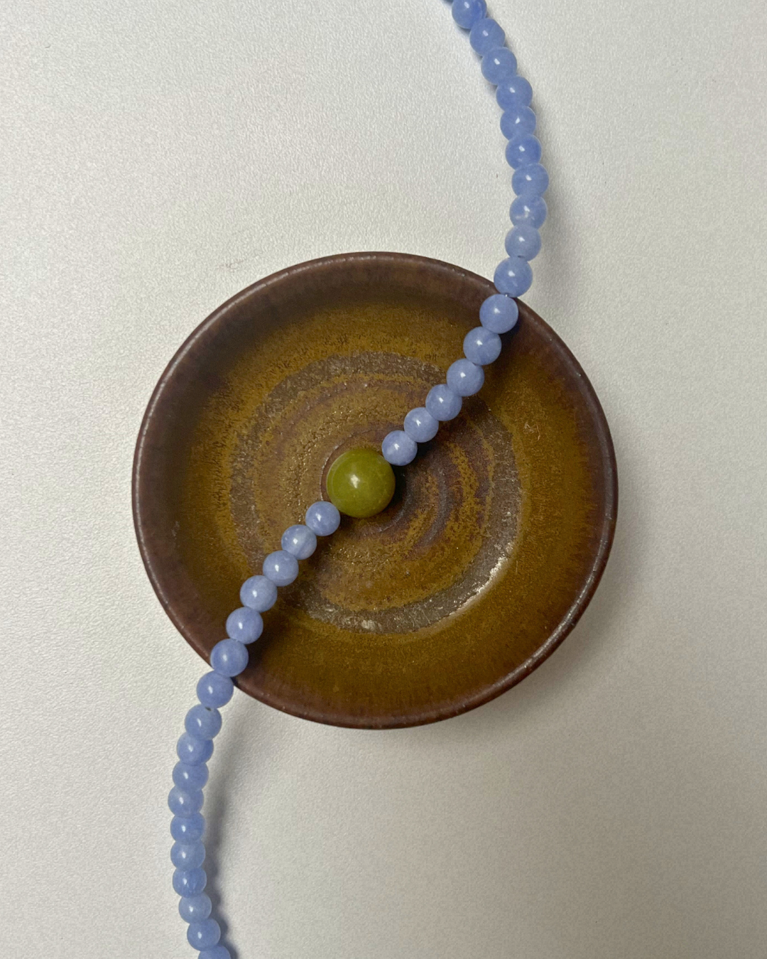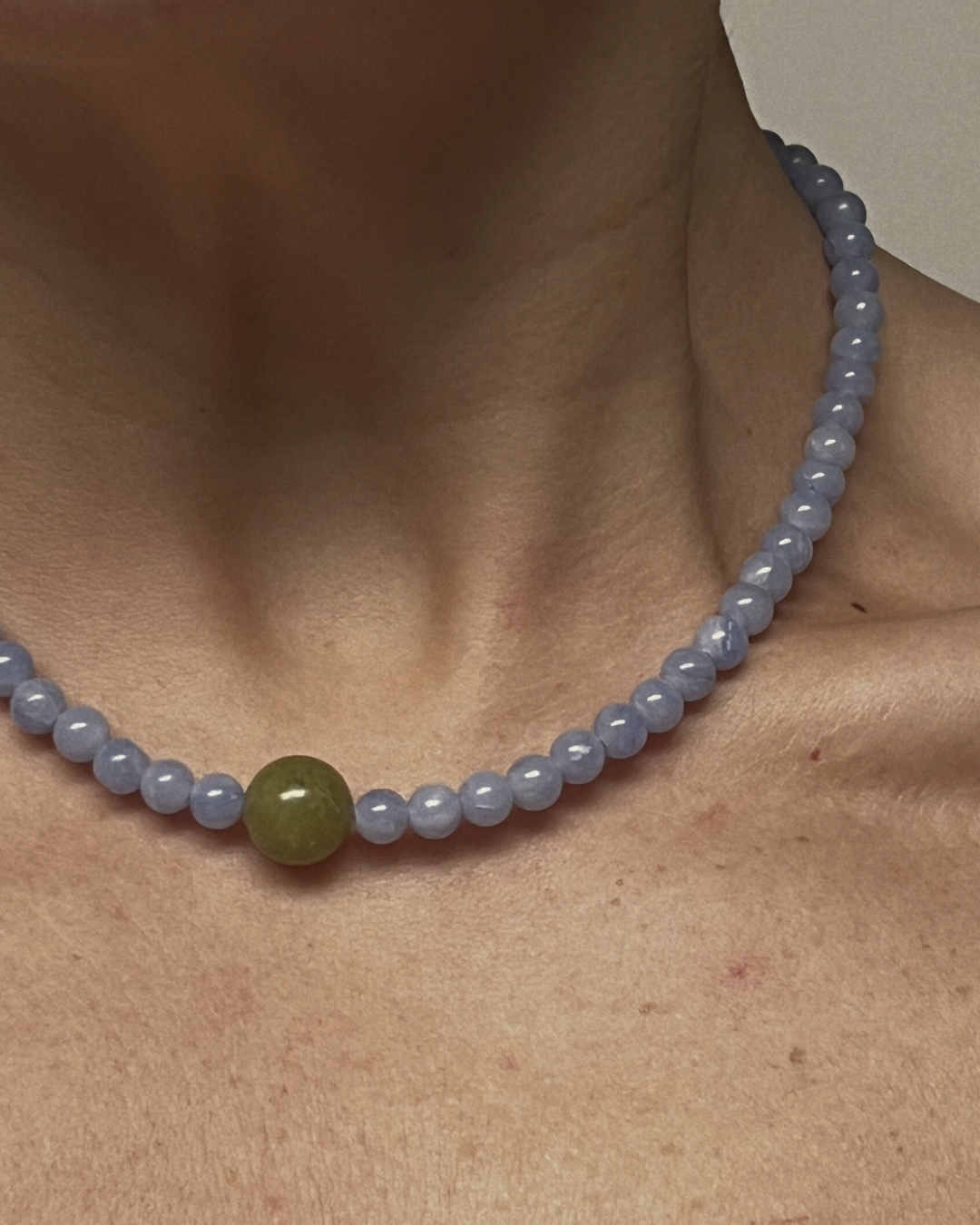 Blue lace agate brings softness and calm through its pale blue tone, offering clarity and ease. At the centre, olive jade introduces grounding balance and quiet depth, creating a gentle contrast between lightness and steadiness. Together, the piece feels composed, wearable, and quietly reassuring.