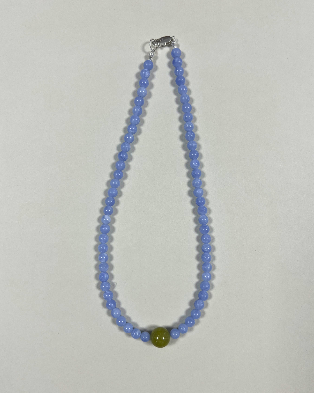 A one-of-a-kind necklace featuring 6 mm blue lace agate beads with a central olive jade sphere. All findings and clasp are sterling silver.