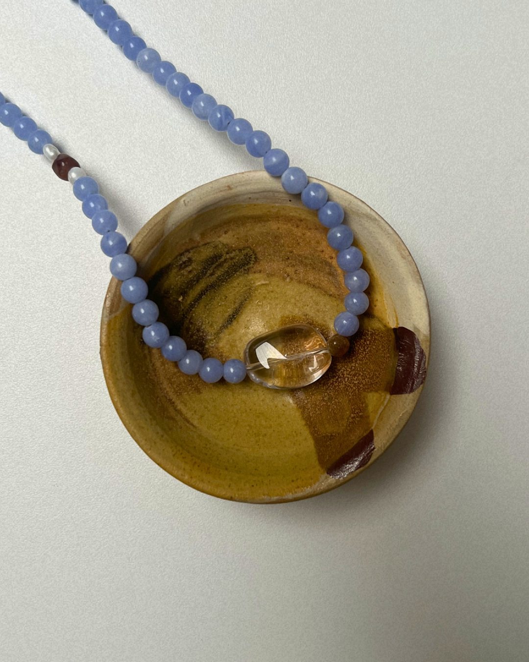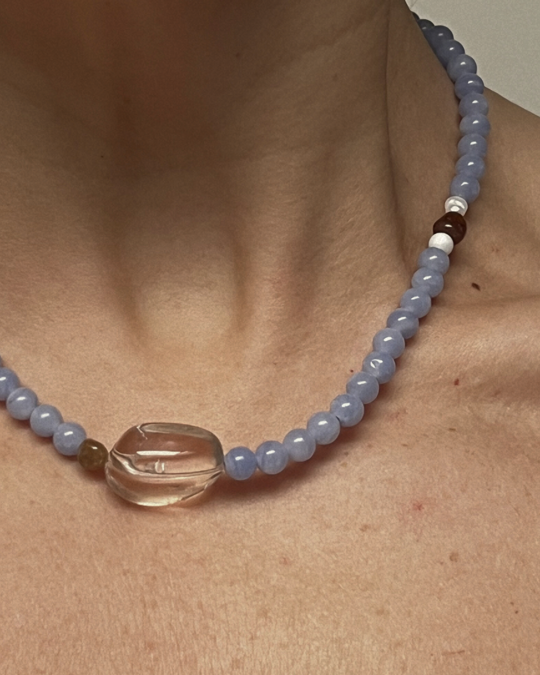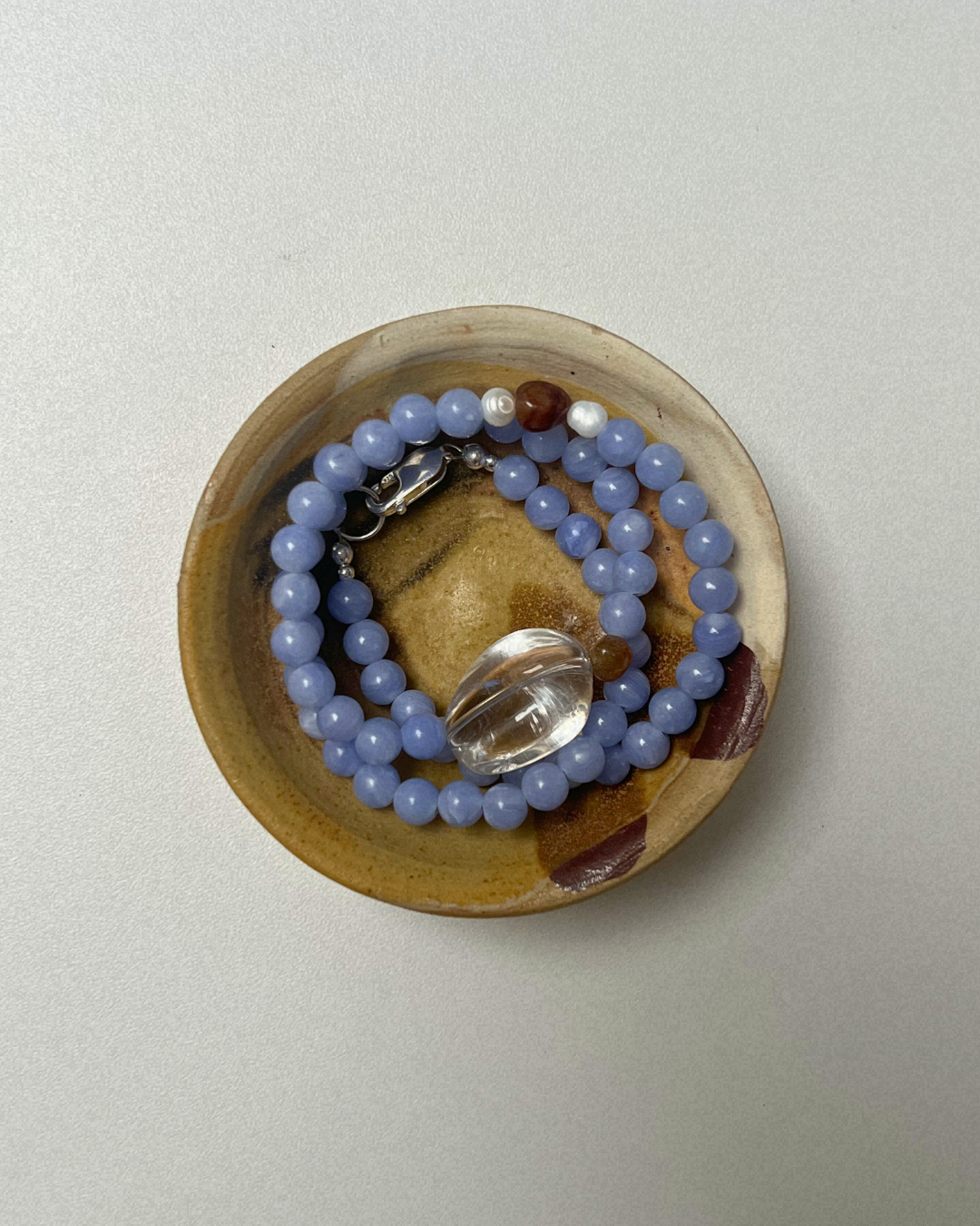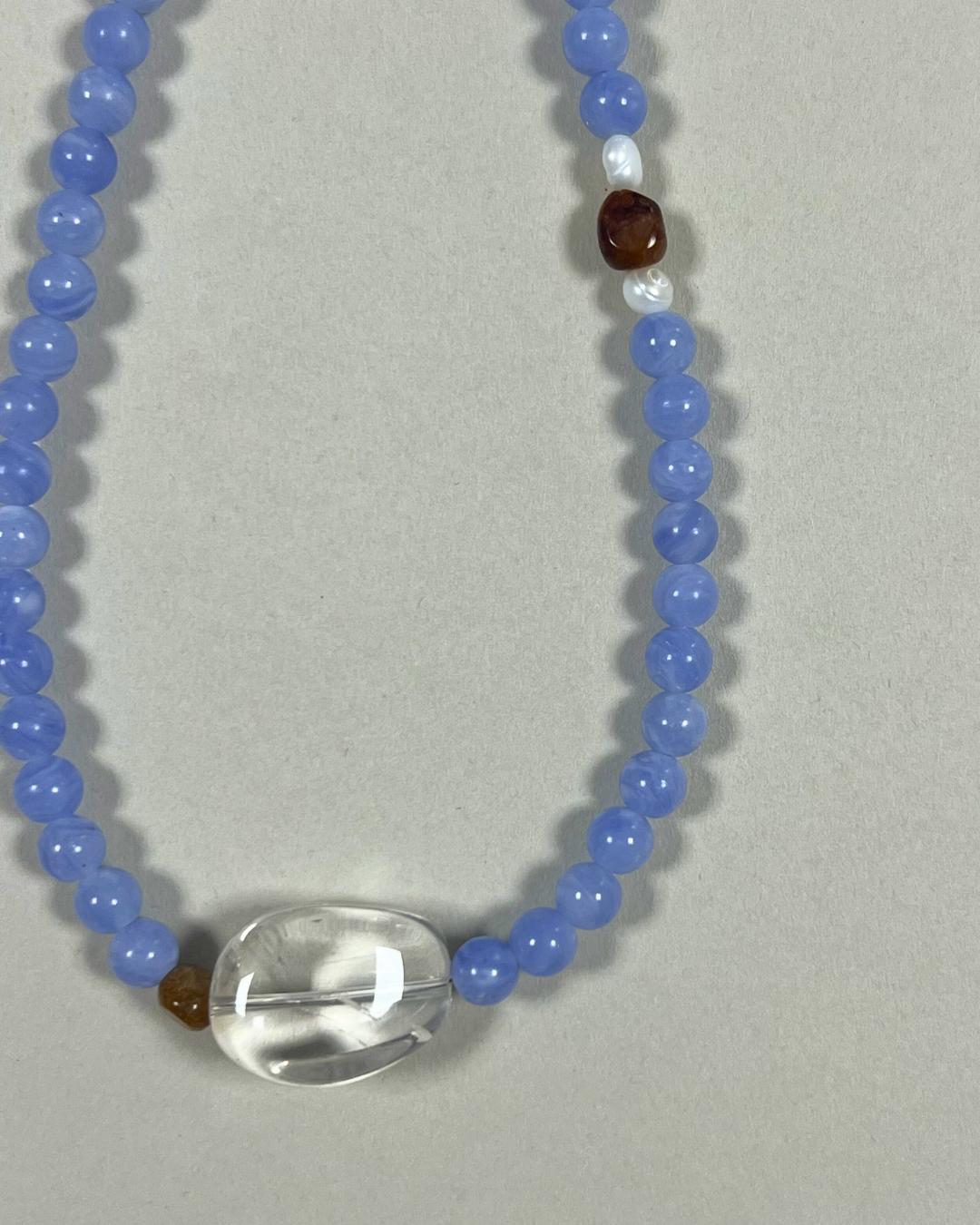 Blue lace agate brings softness and calm through its pale, clouded blue tones, offering clarity and ease. Clear quartz sits at the centre as a point of light and focus, while jade introduces grounded balance through its smooth green depth. The freshwater pearls add a gentle luminosity, creating a piece that feels clear, composed, and quietly radiant.
