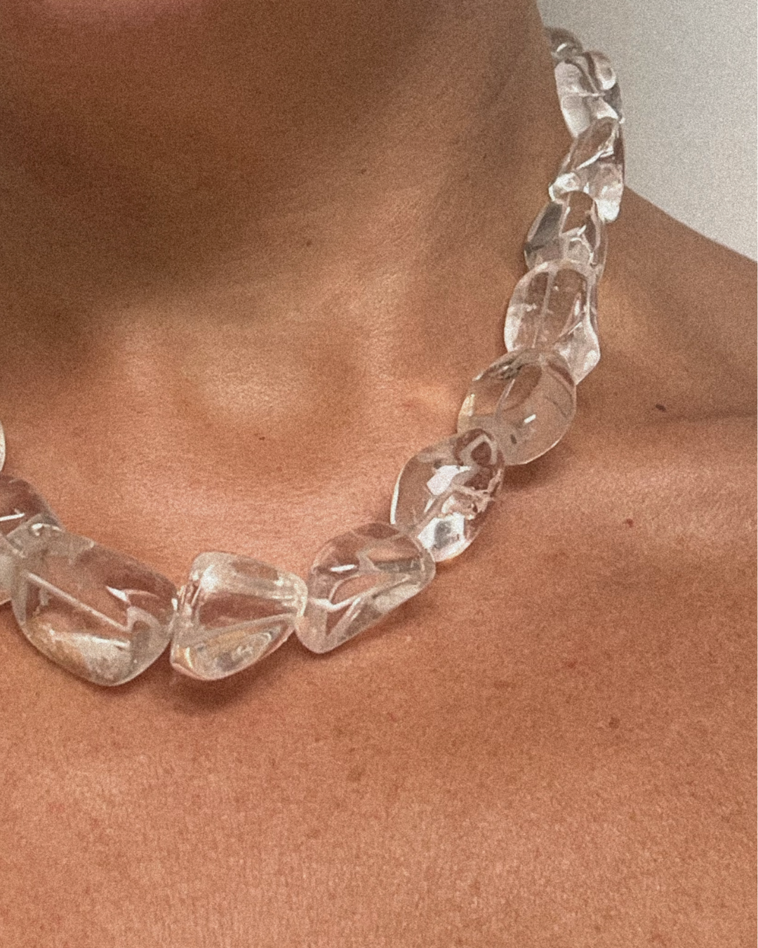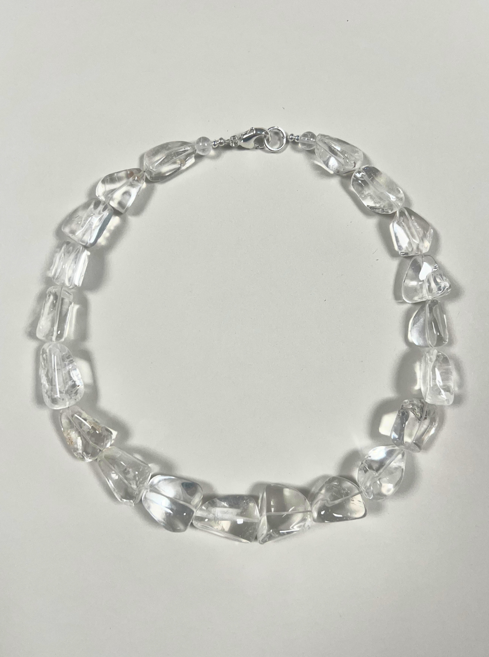 A limited, handmade piece featuring large, chunky clear quartz tumble beads, hand-strung with sterling silver findings and clasp. The stones are luminous and weighty, each with subtle natural inclusions — a striking composition of clarity, form and light.