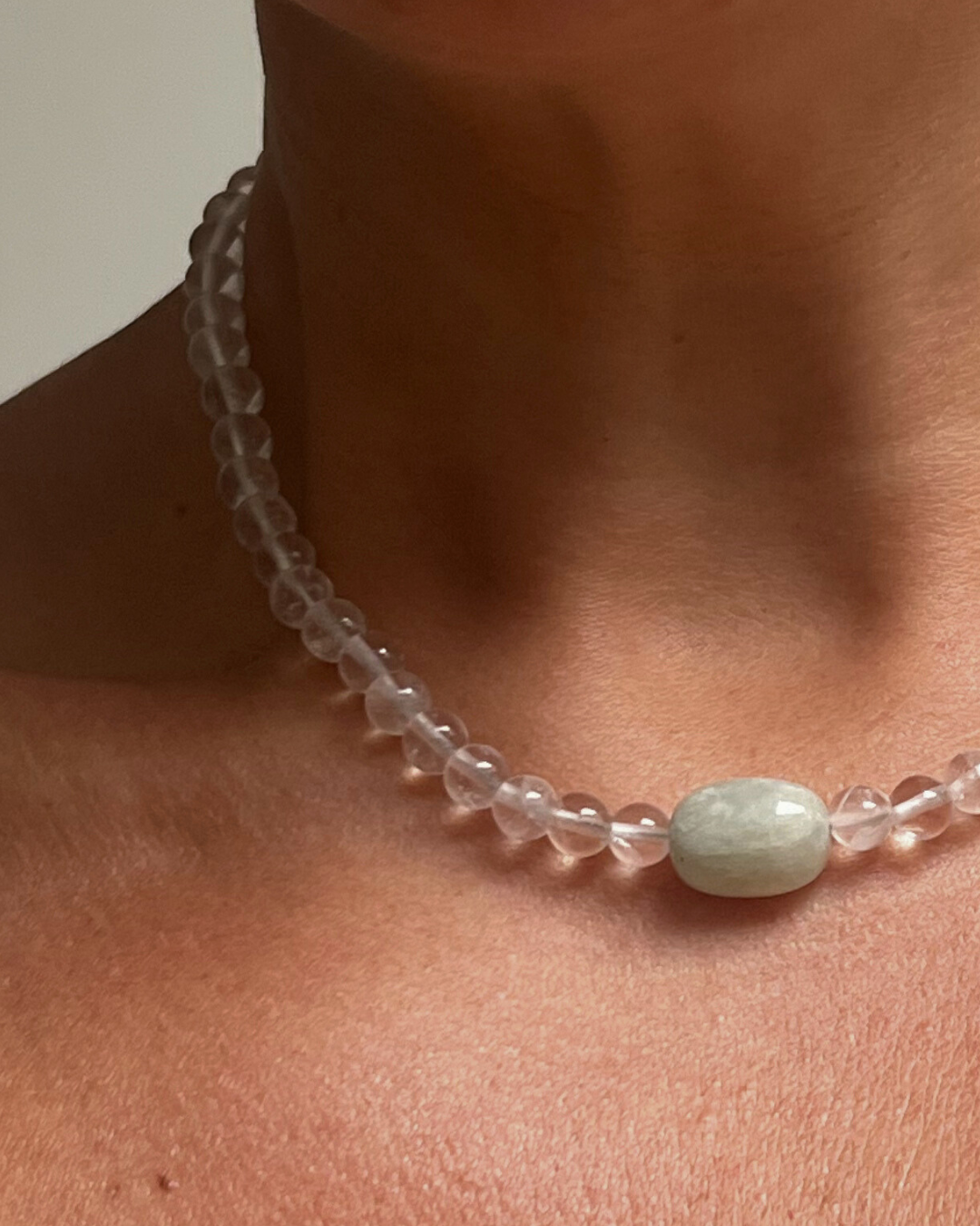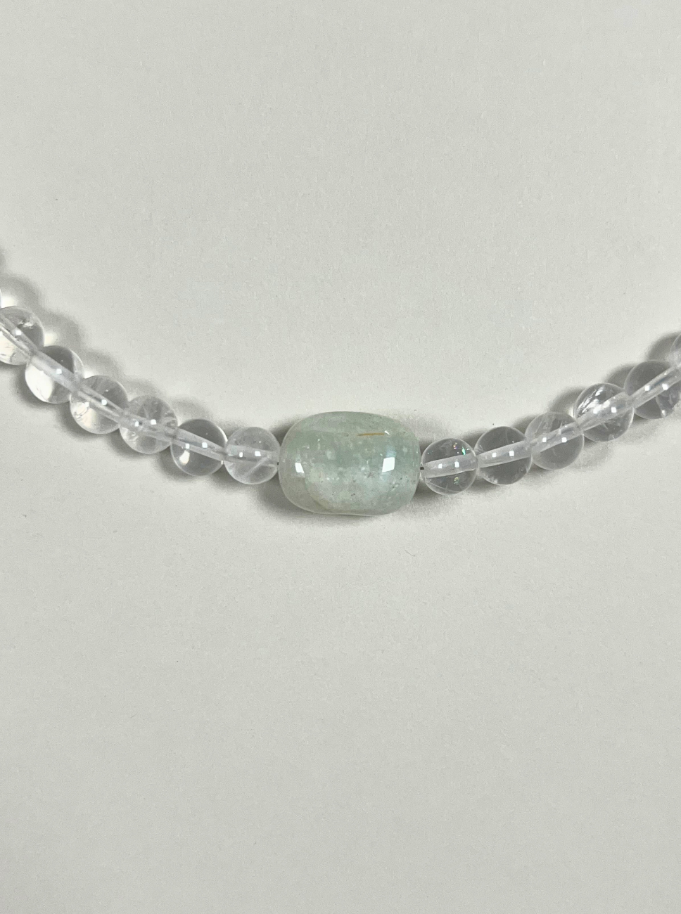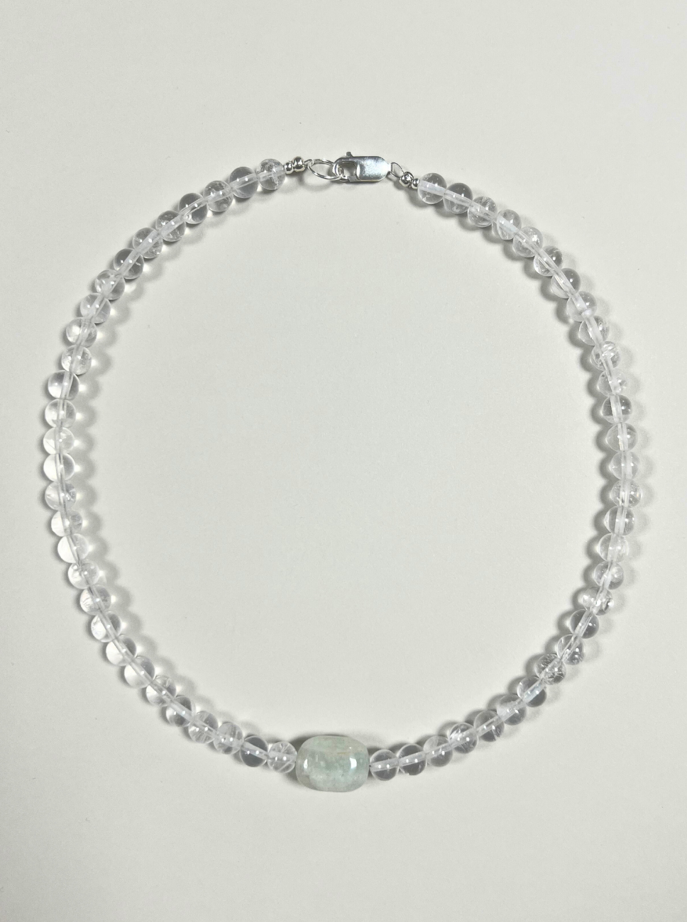 A limited, handmade necklace featuring smooth clear quartz beads, hand-strung with sterling silver findings. At the centre sits a soft blue-green beryl bead - a gentle focal point of calm and clarity.